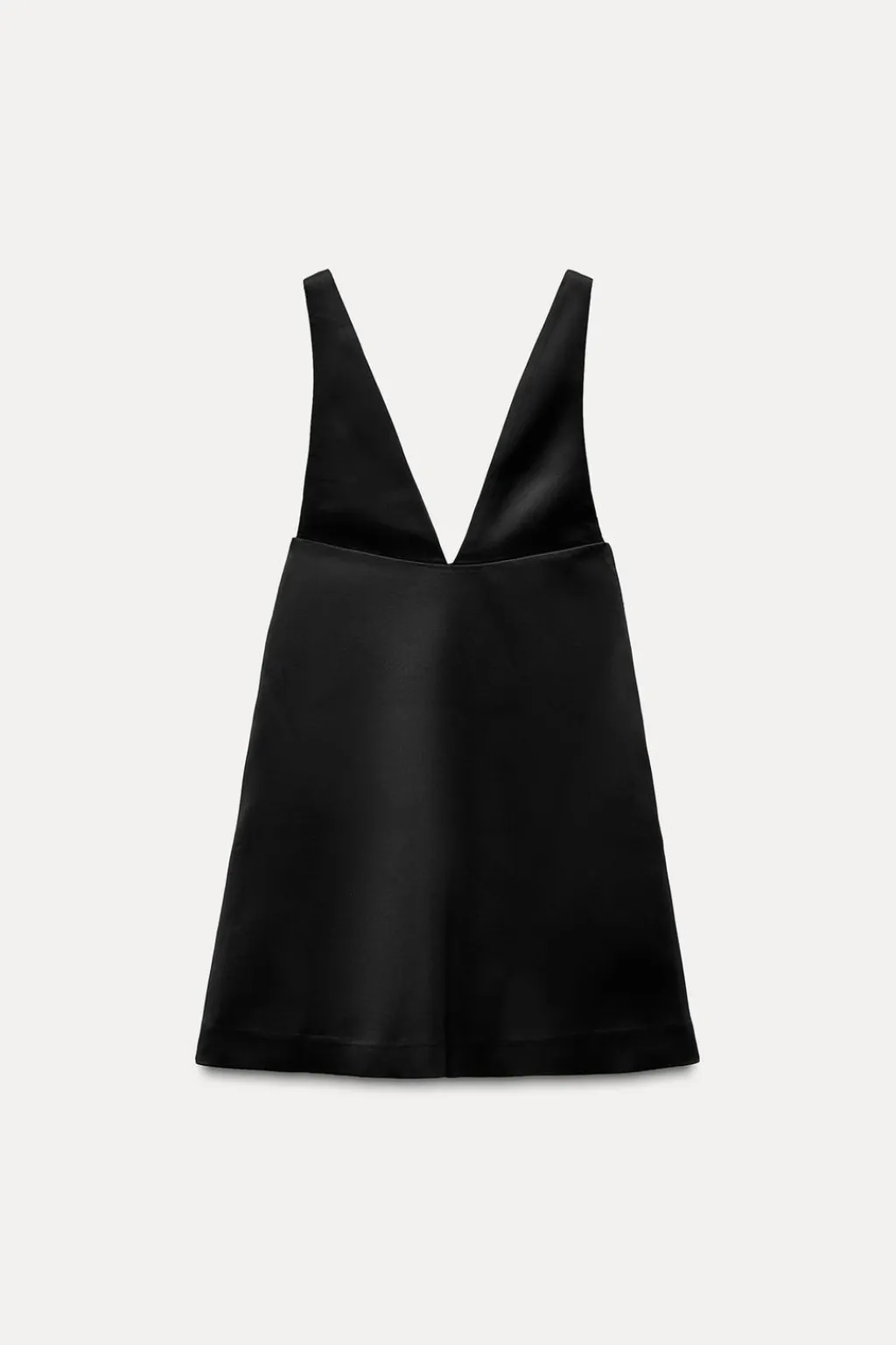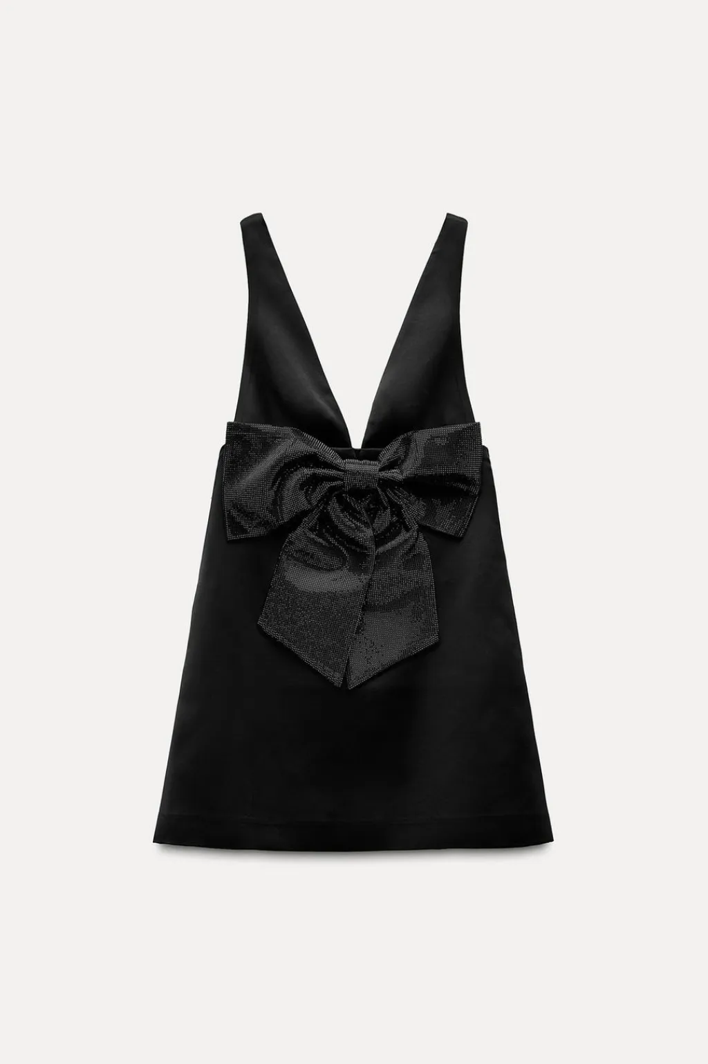 Vestido corto de escote pico pronunciado y tirantes anchos. Detalle de maxi lazo con strass en delantero. Forro interior. Cierre lateral con cremallera oculta en costura.