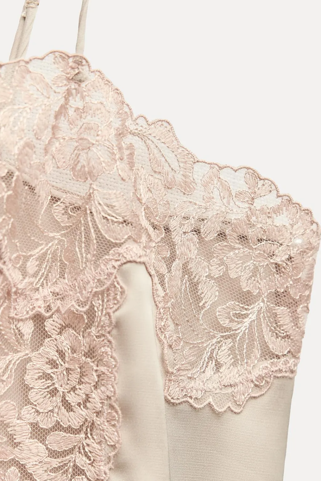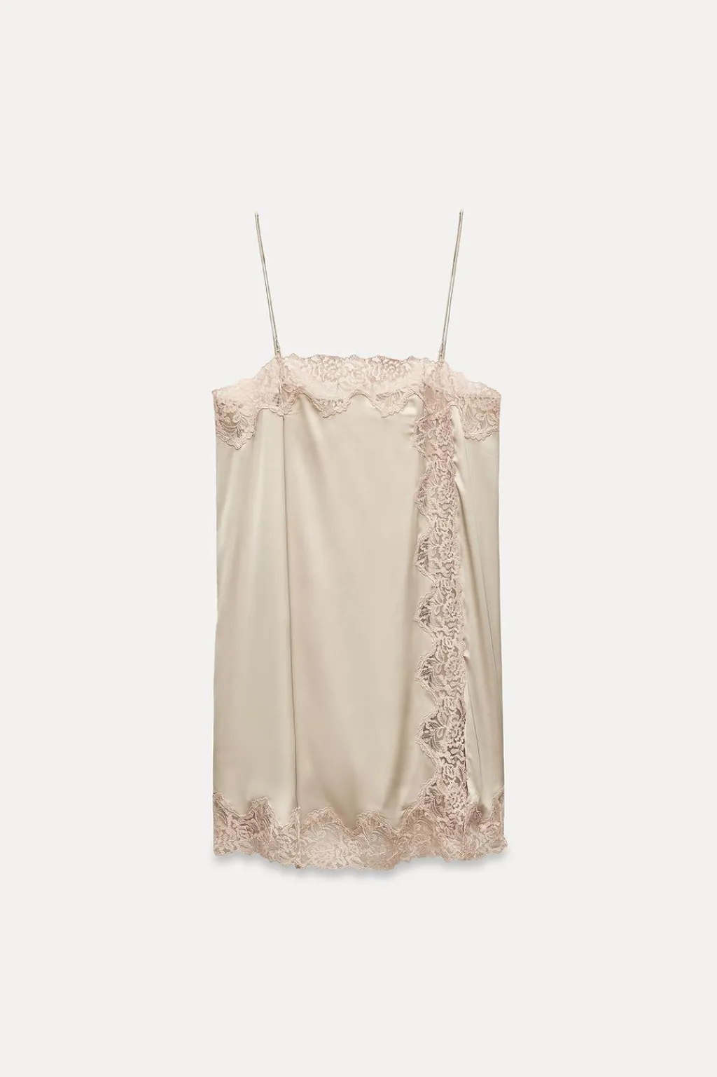 Vestido corto de escote recto y tirantes finos ajustables. Detalle aplicación de encaje combinado a contraste. Bajo con abertura lateral.