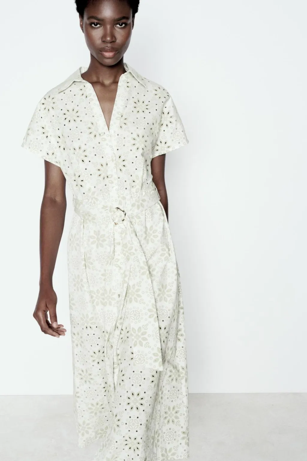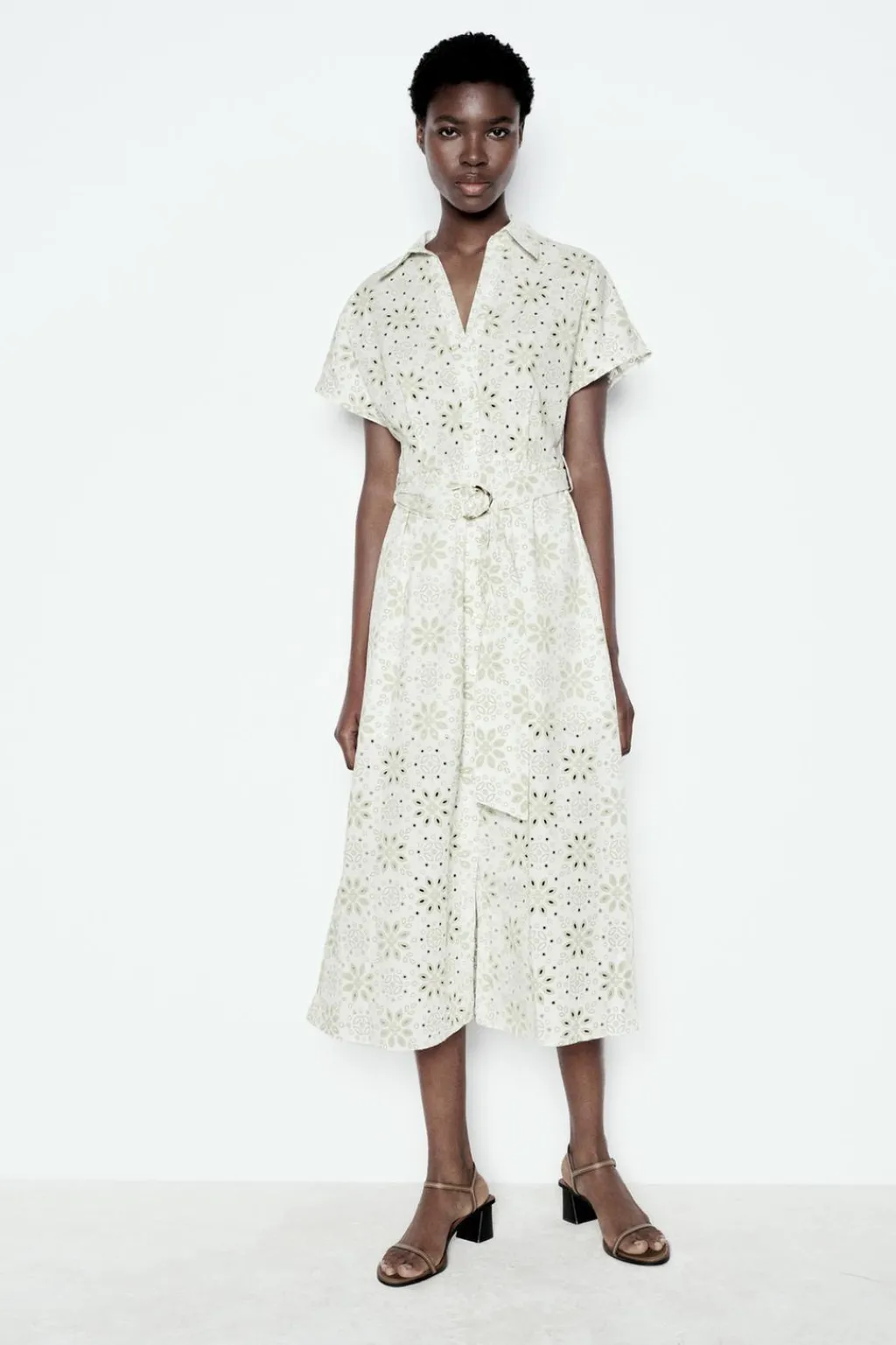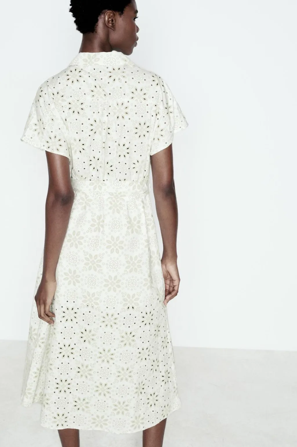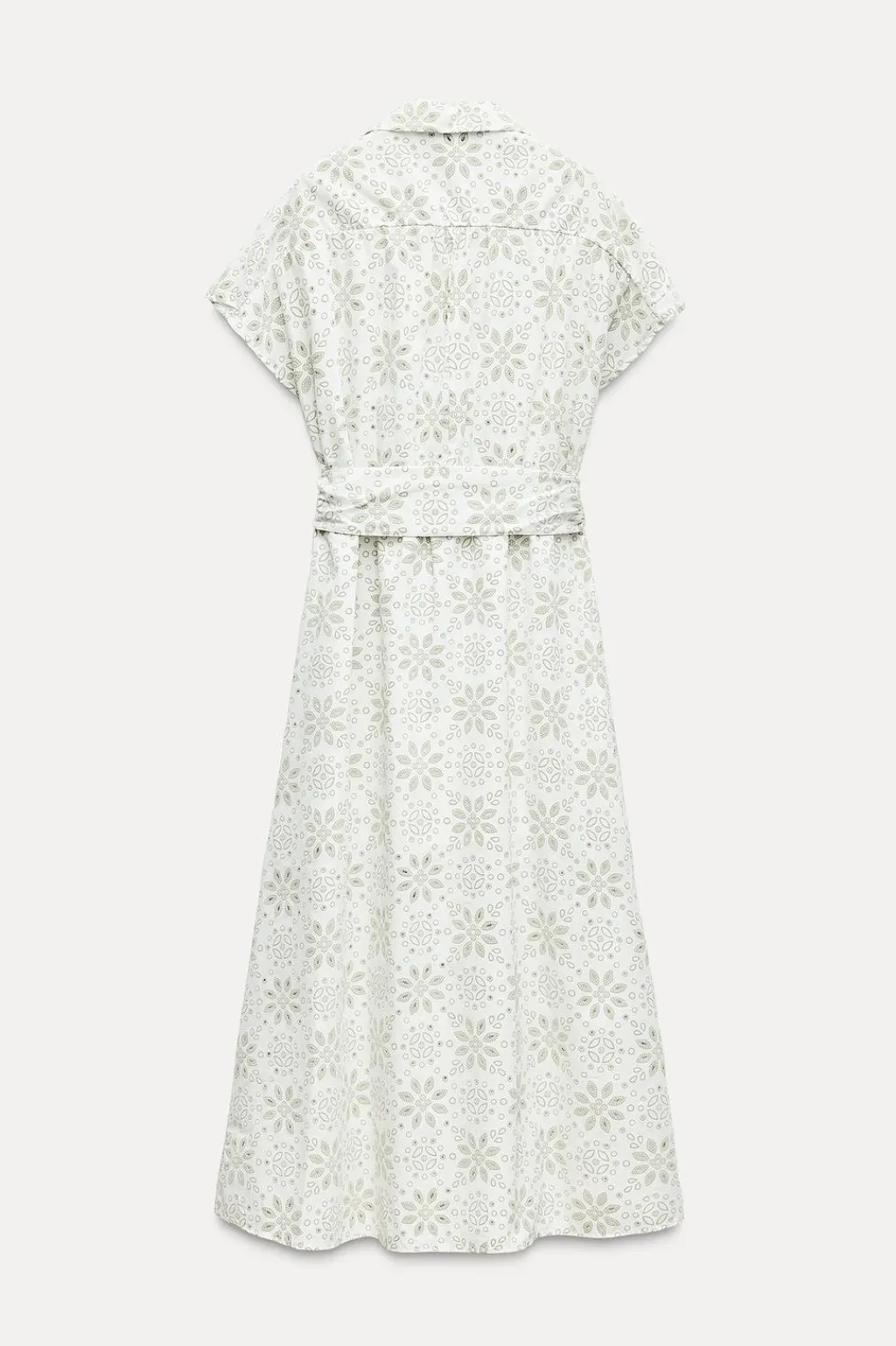 Vestido de cuello solapa con escote pico y manga corta. Detalle de bordados engomados y cinturón del mismo tejido. Cierre frontal con botones.