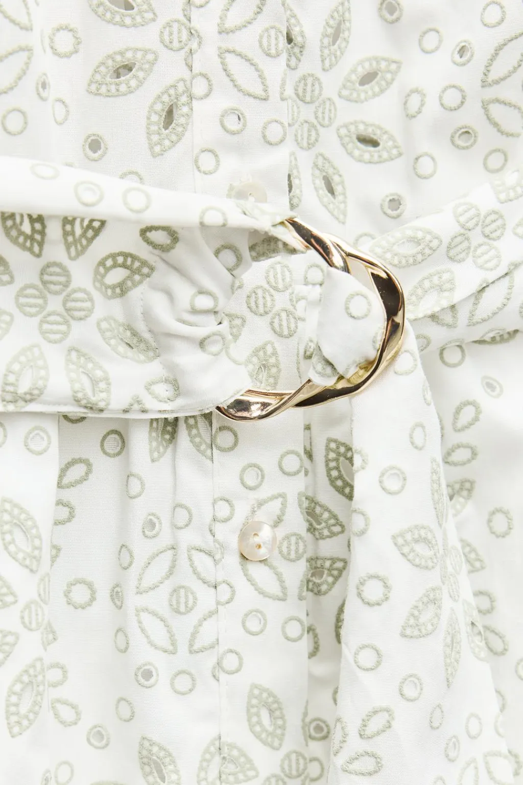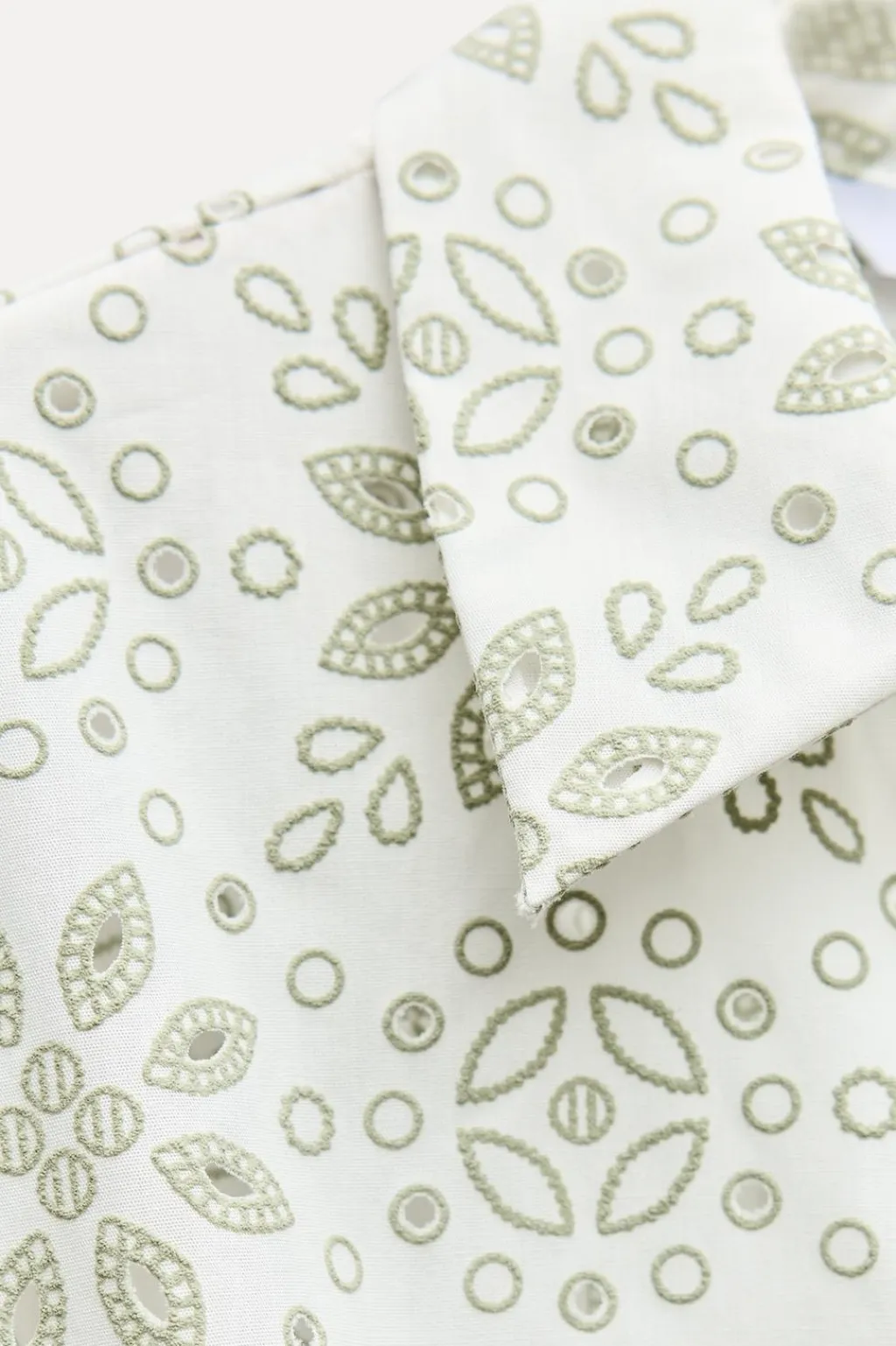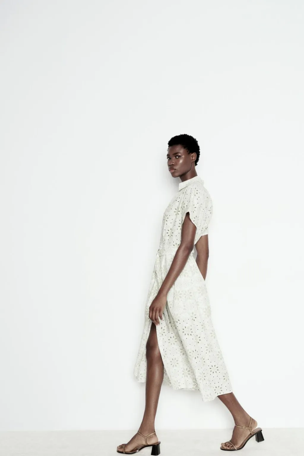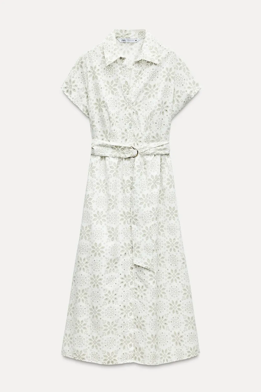 Vestido de cuello solapa con escote pico y manga corta. Detalle de bordados engomados y cinturón del mismo tejido. Cierre frontal con botones.