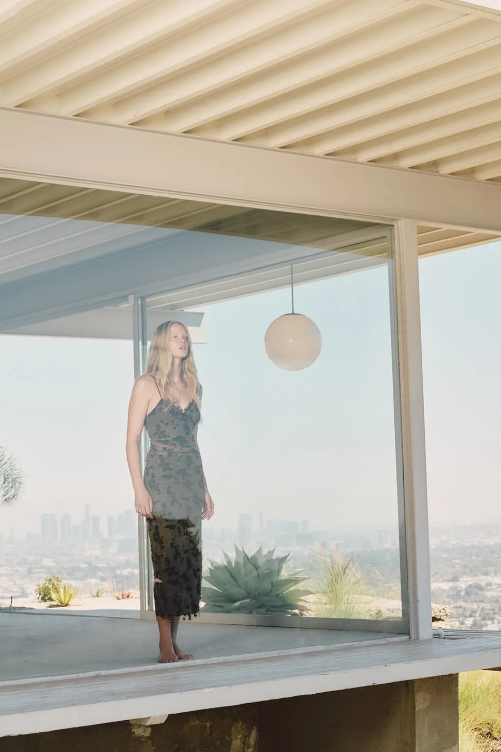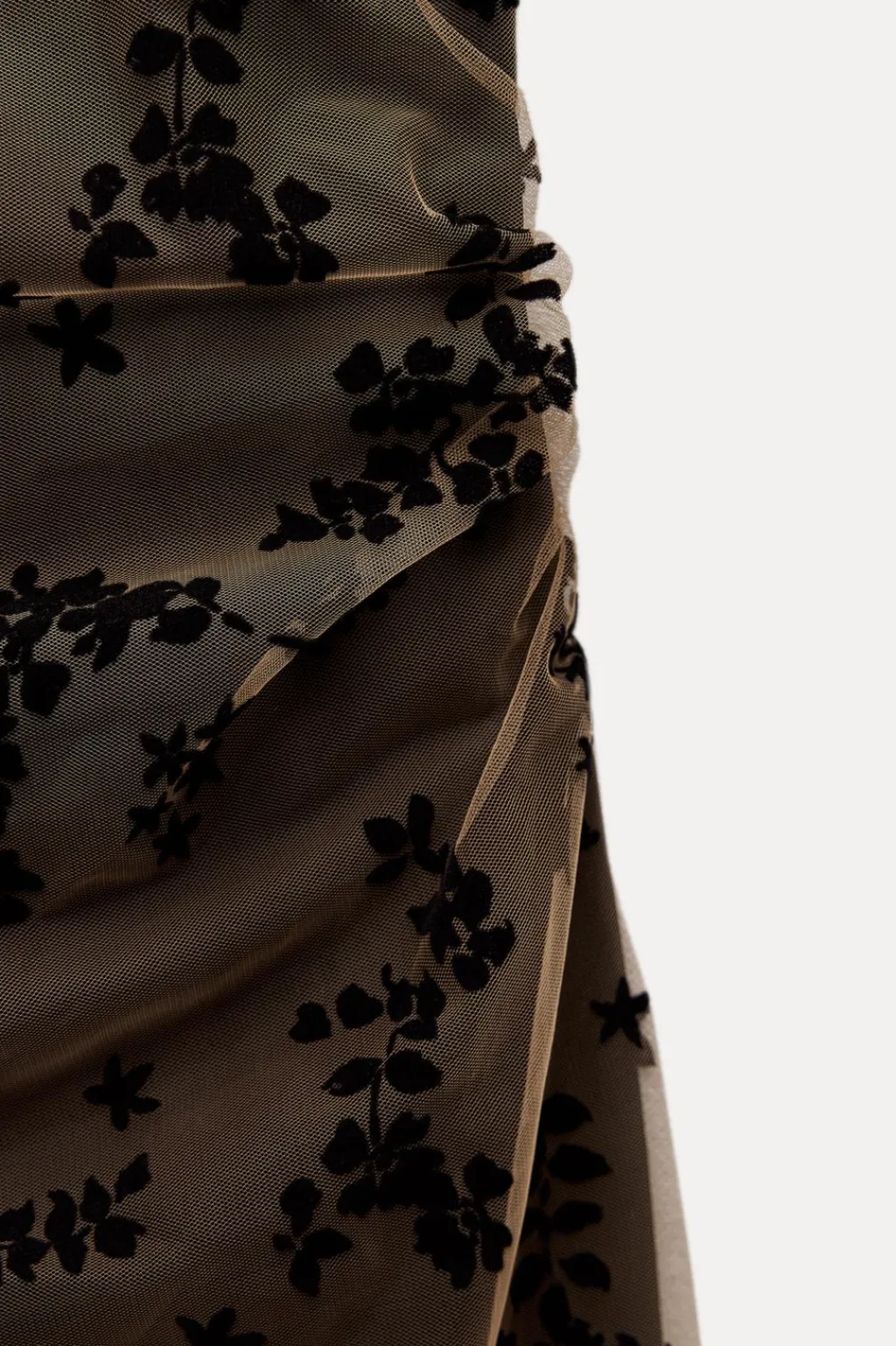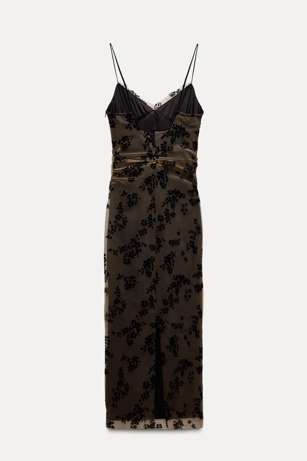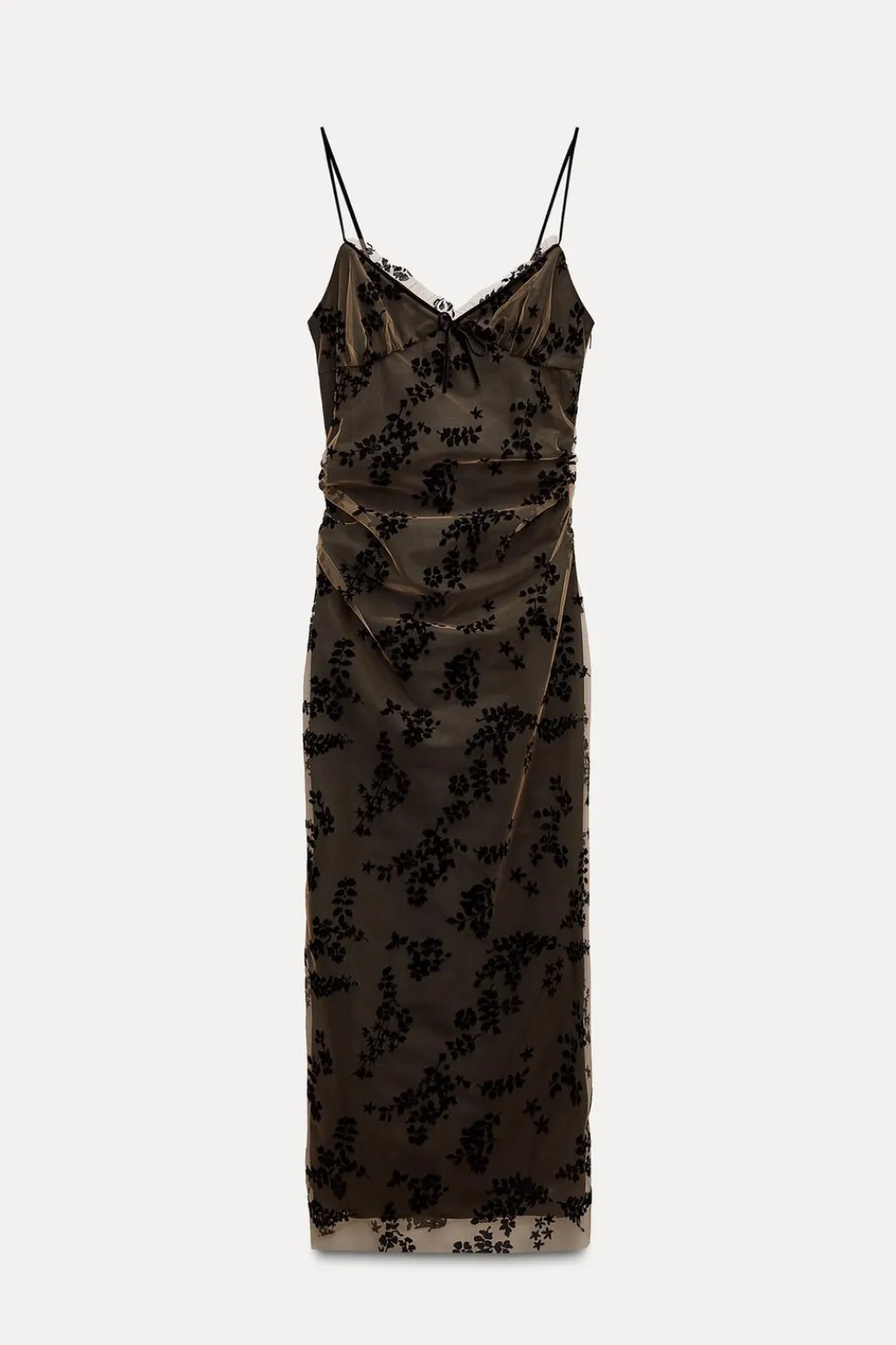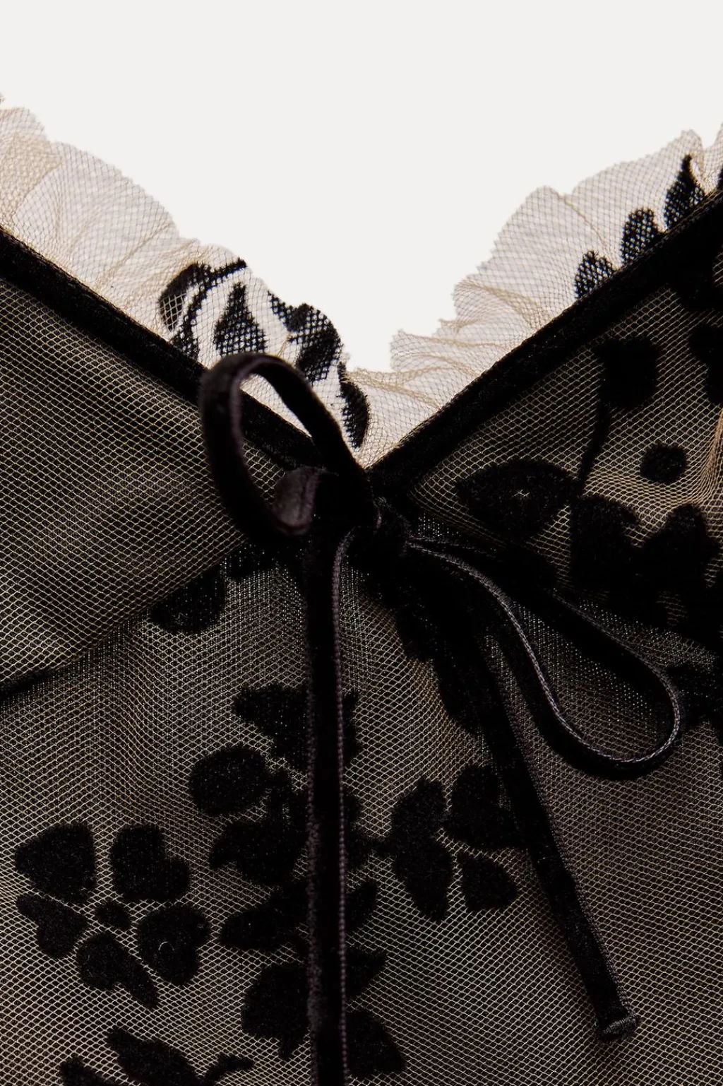 Vestido de escote pico con volante y tirantes finos. Detalle de tejido en tul combinado con terciopelo. Forro interior. Acabados con frunces. Cierre lateral con cremallera oculta en costura. Bajo con abertura en espalda.