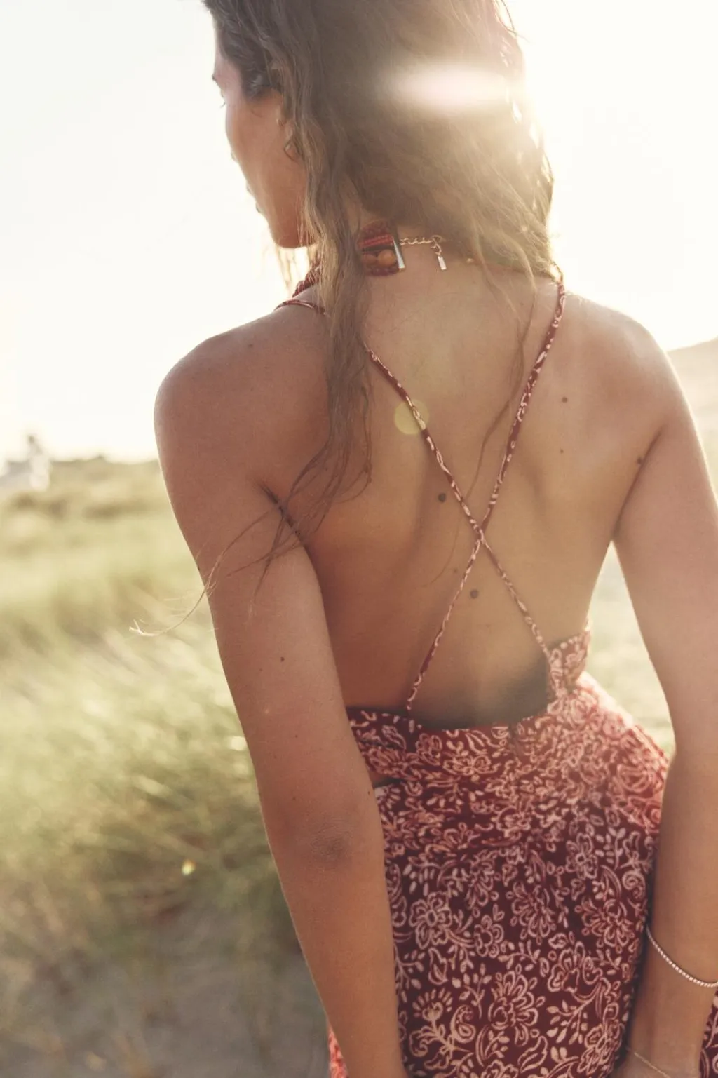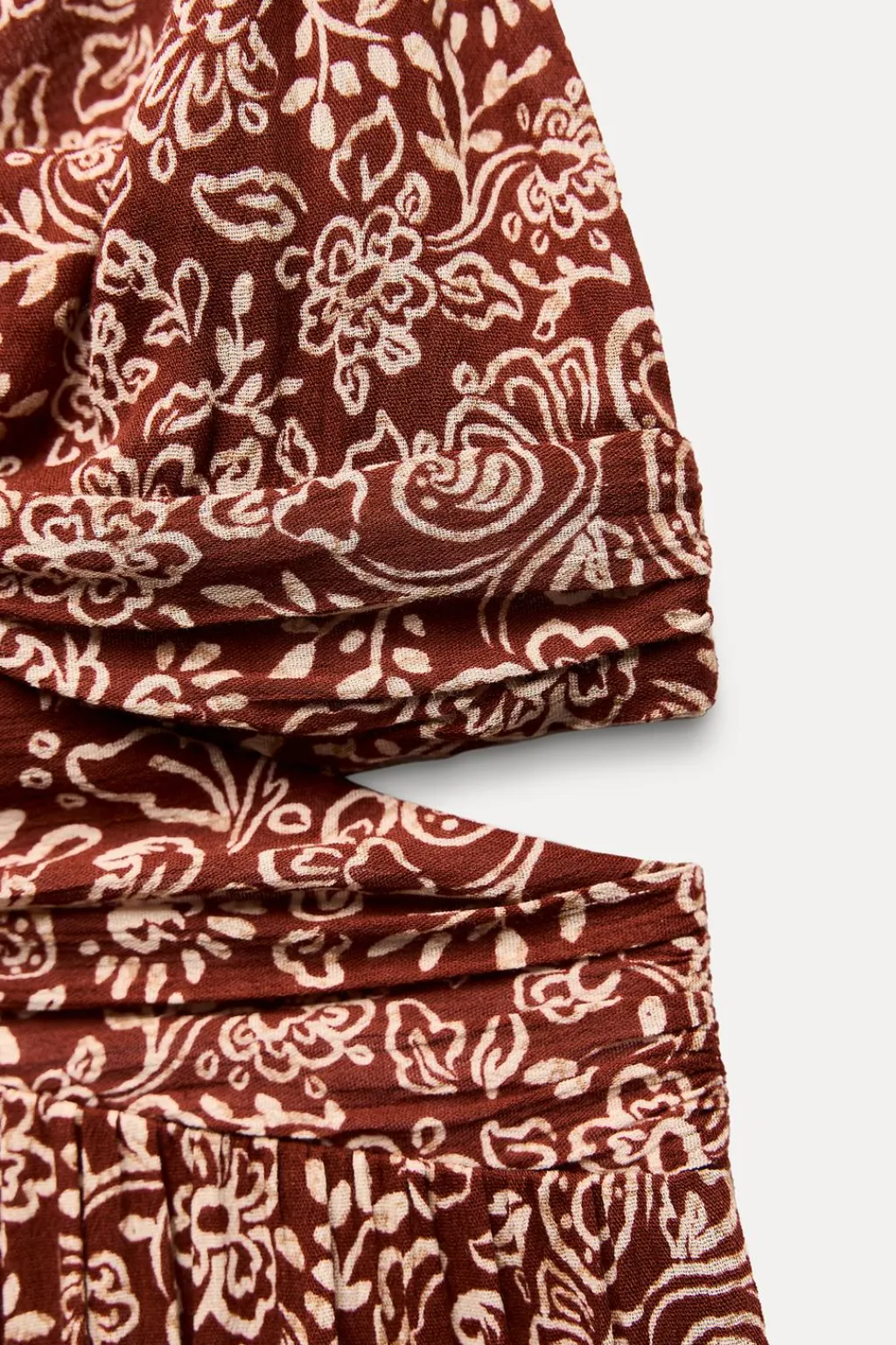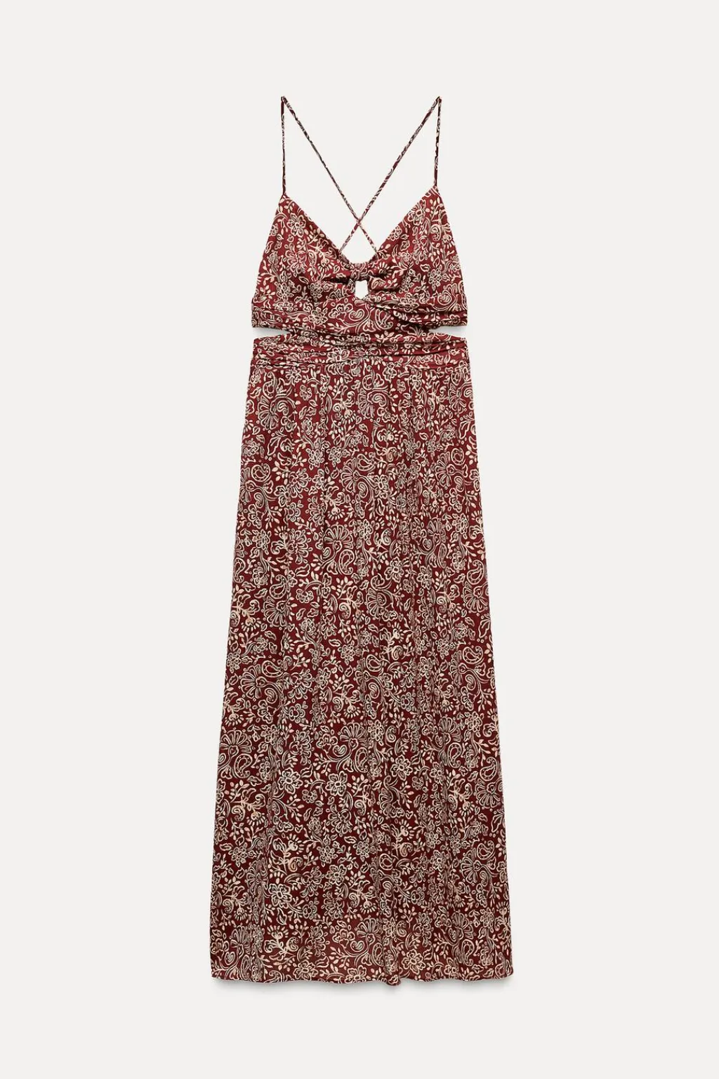 Vestido de escote pico con nudo y tirantes finos cruzados en espalda. Detalle de frunces en cintura y aberturas. Cierre en espalda con cremallera oculta en costura.