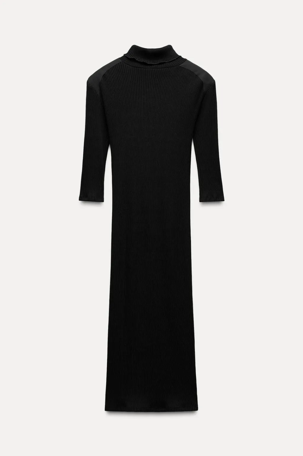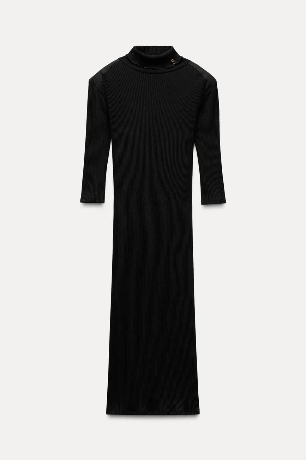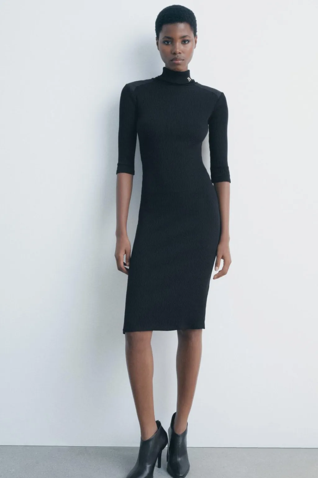 Vestido midi de cuello acabado en vuelta y manga por debajo del codo. Detalle de aplicación metálica ZA en cuello. Tejido en rib.