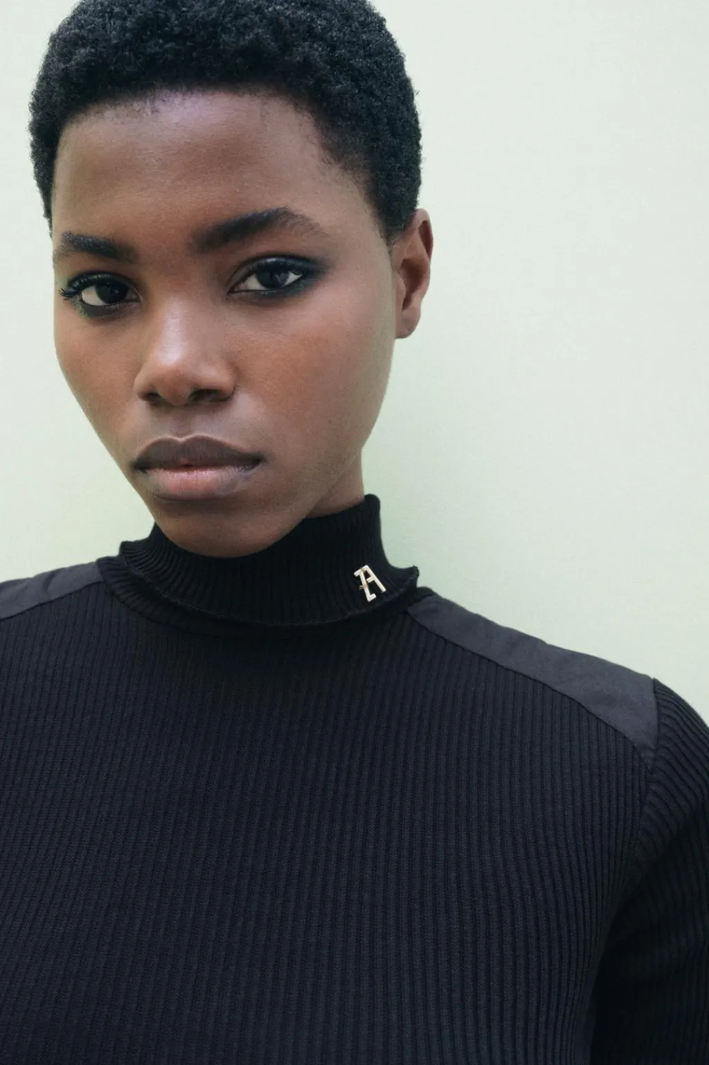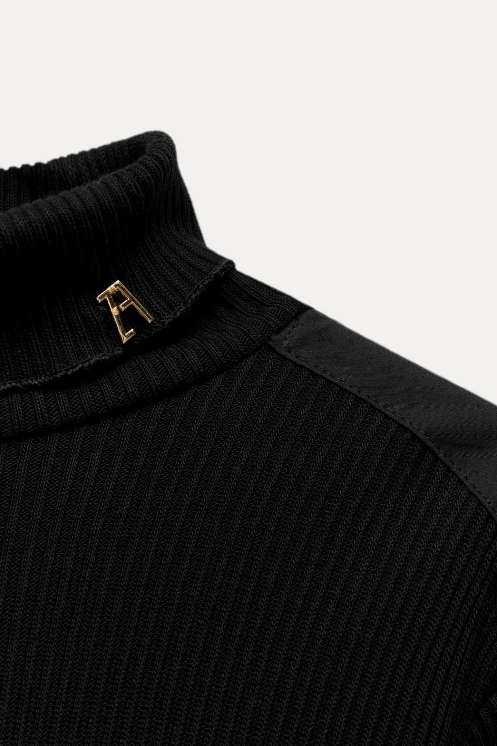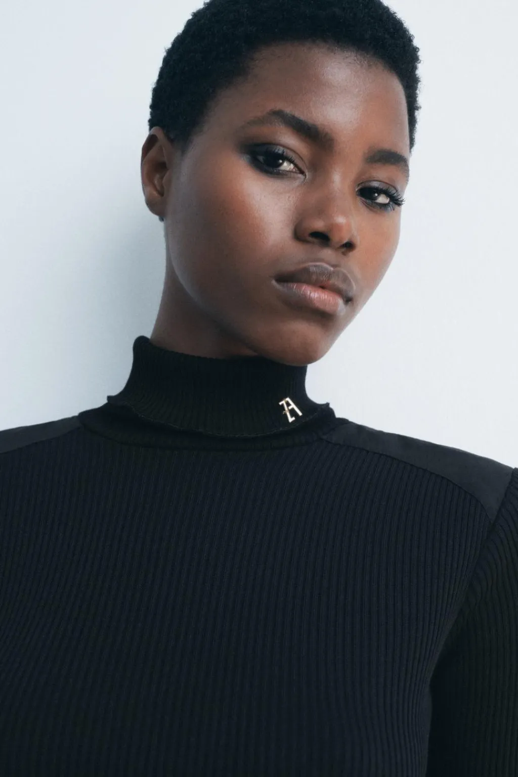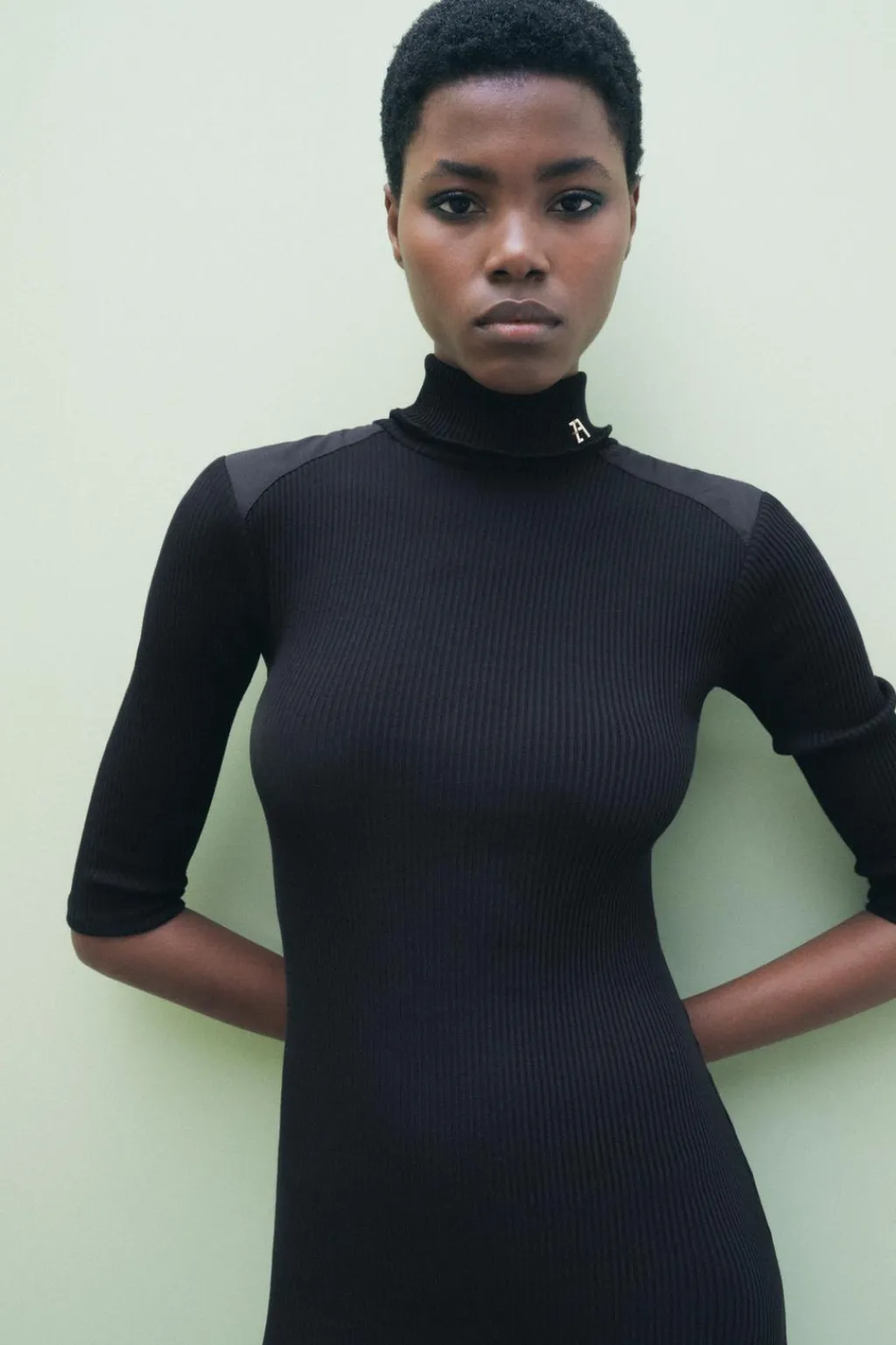 Vestido midi de cuello acabado en vuelta y manga por debajo del codo. Detalle de aplicación metálica ZA en cuello. Tejido en rib.