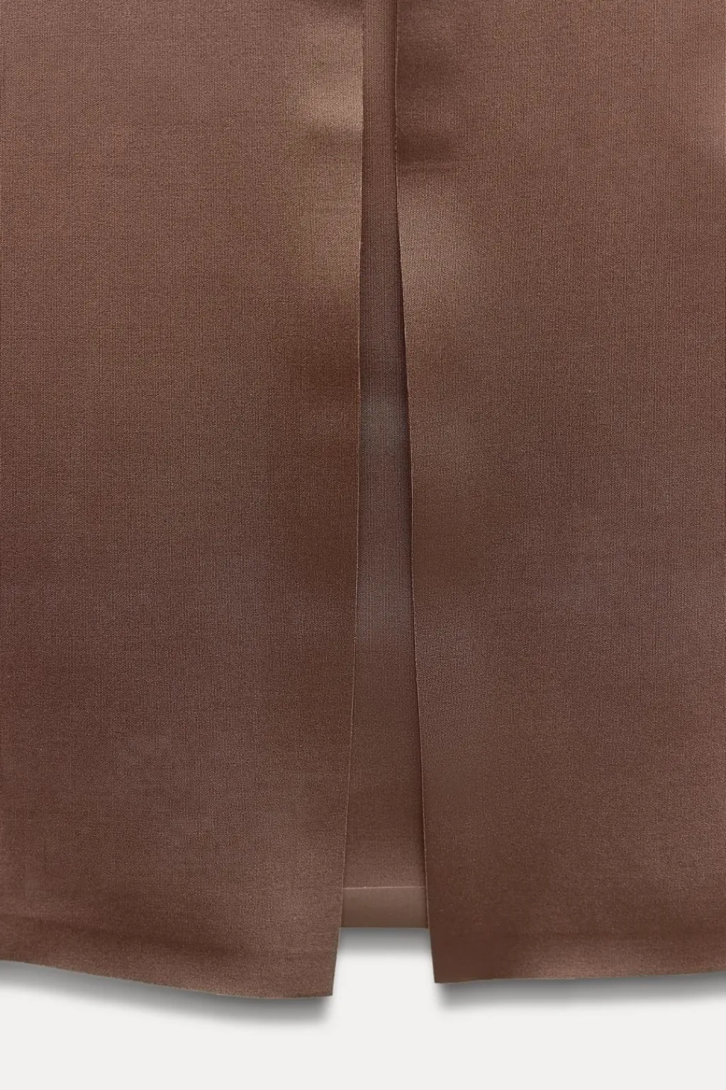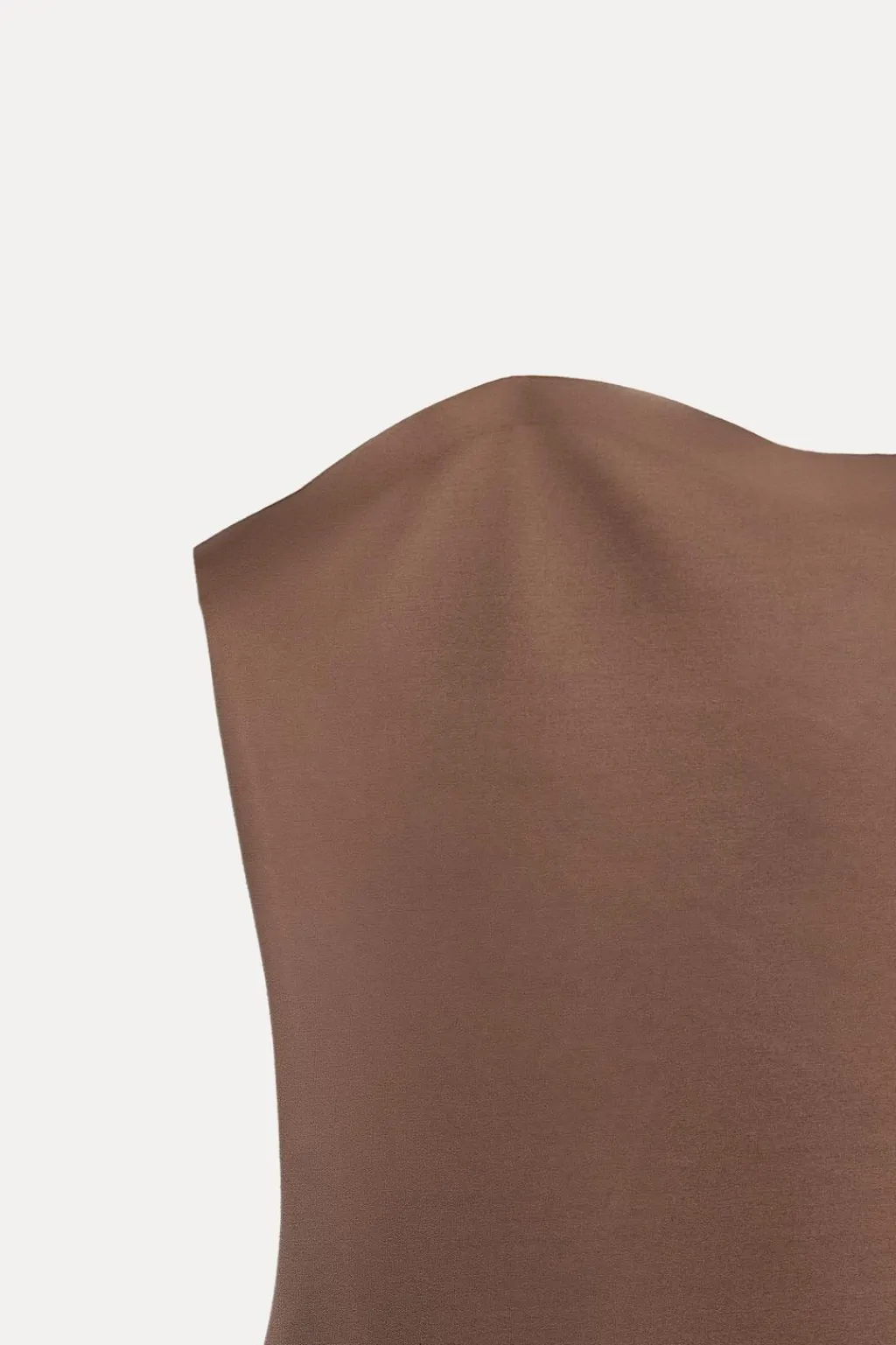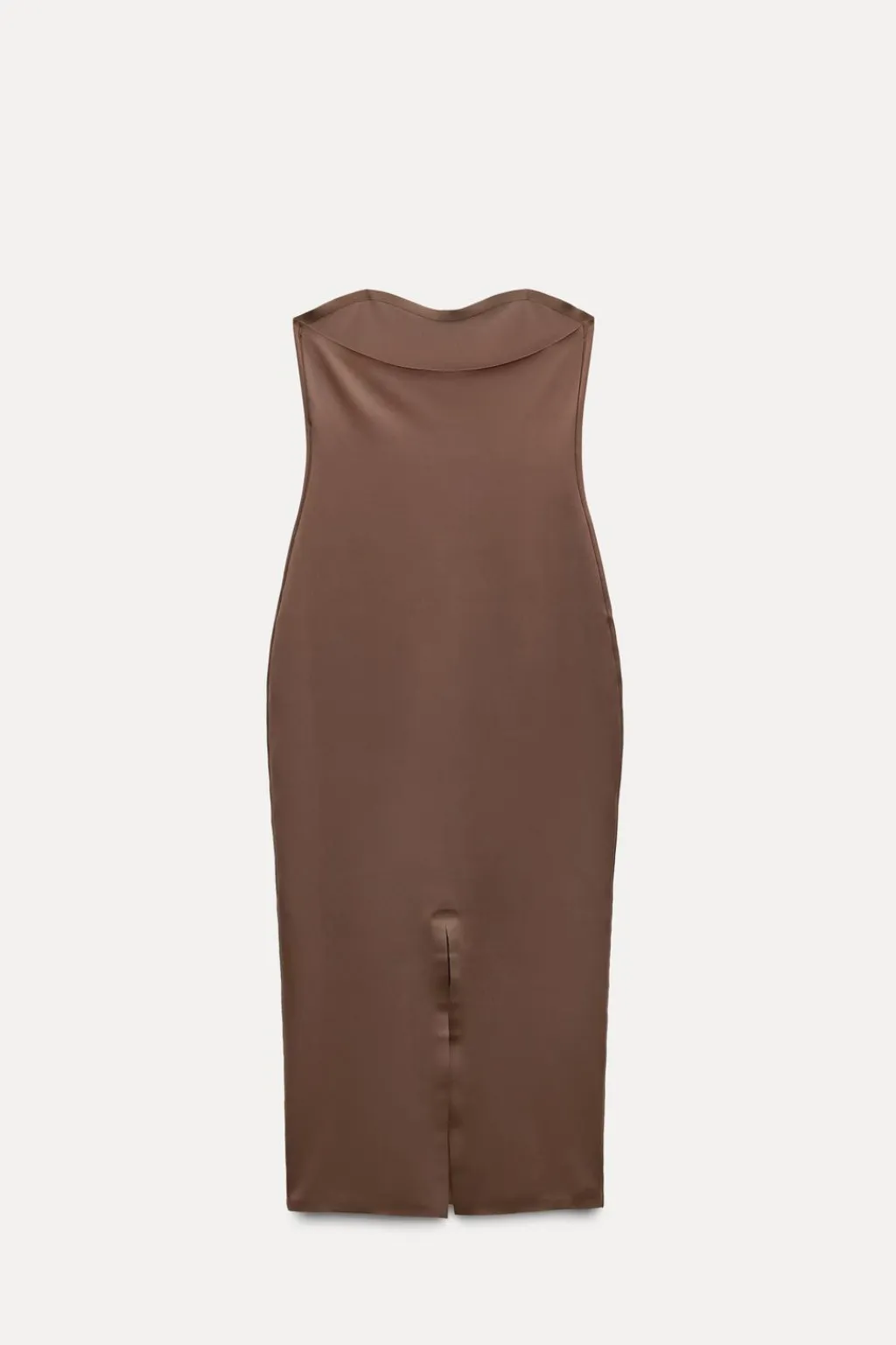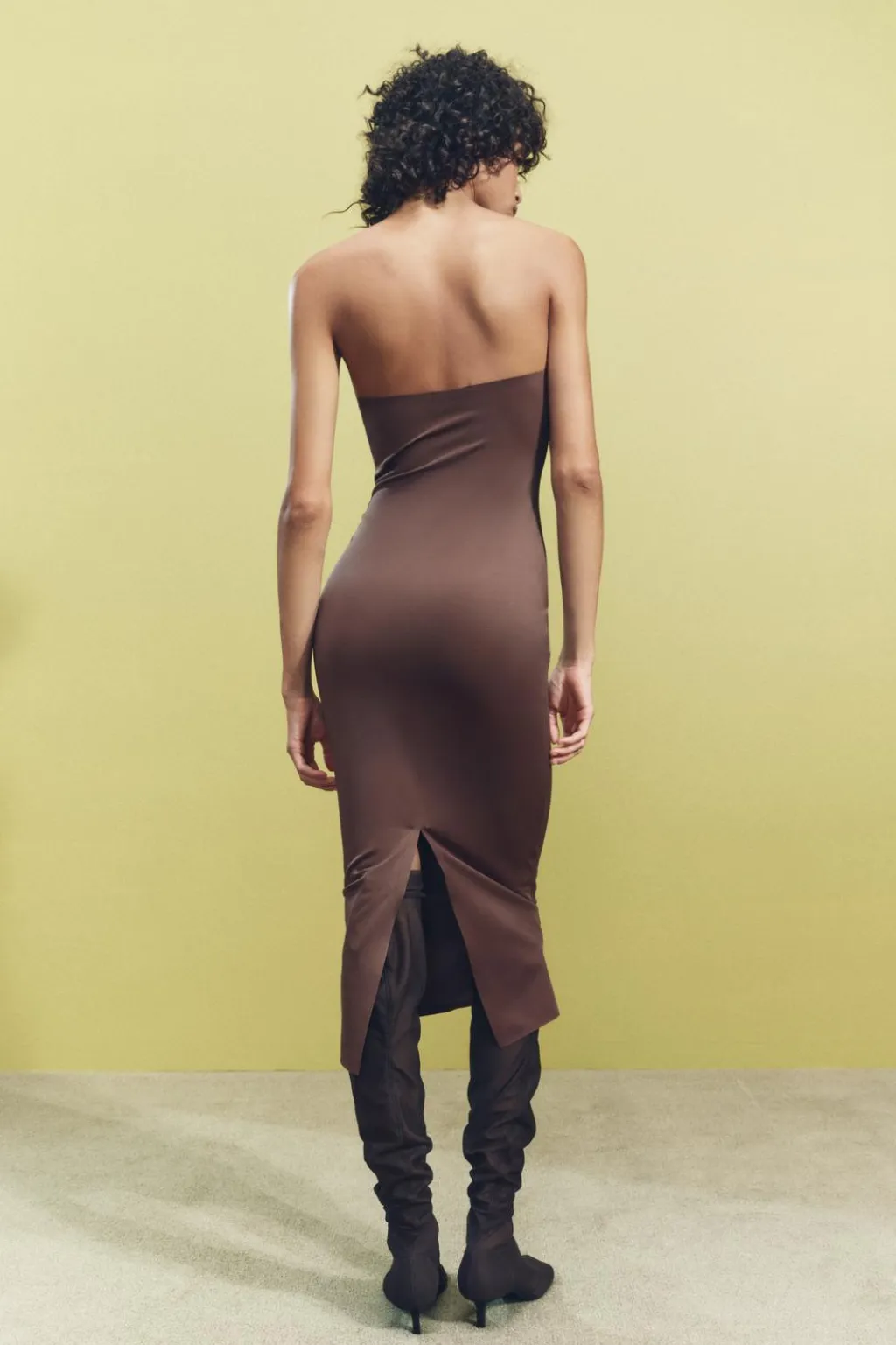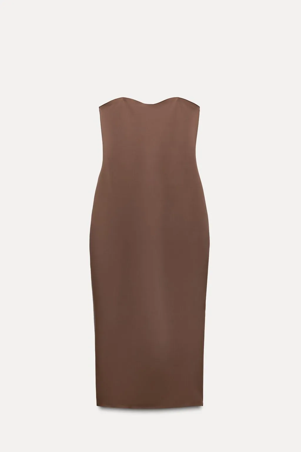 Vestido midi satinado palabra de honor. Bajo acabado con abertura en espalda.