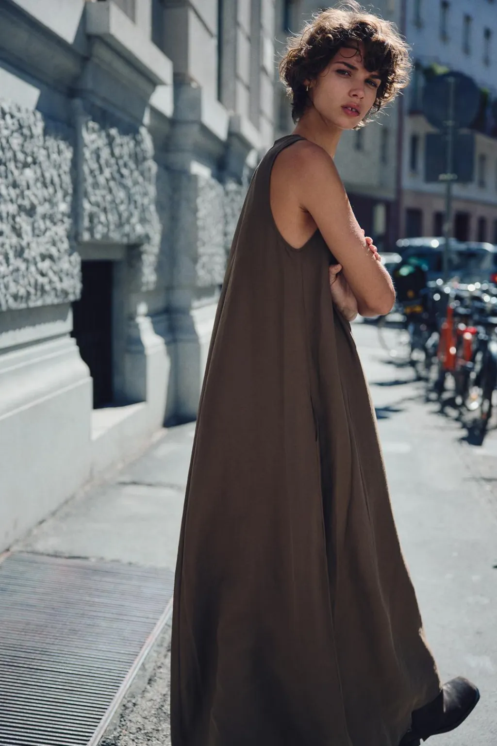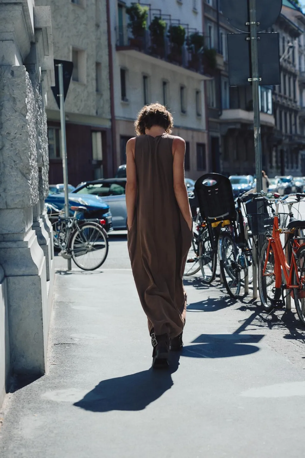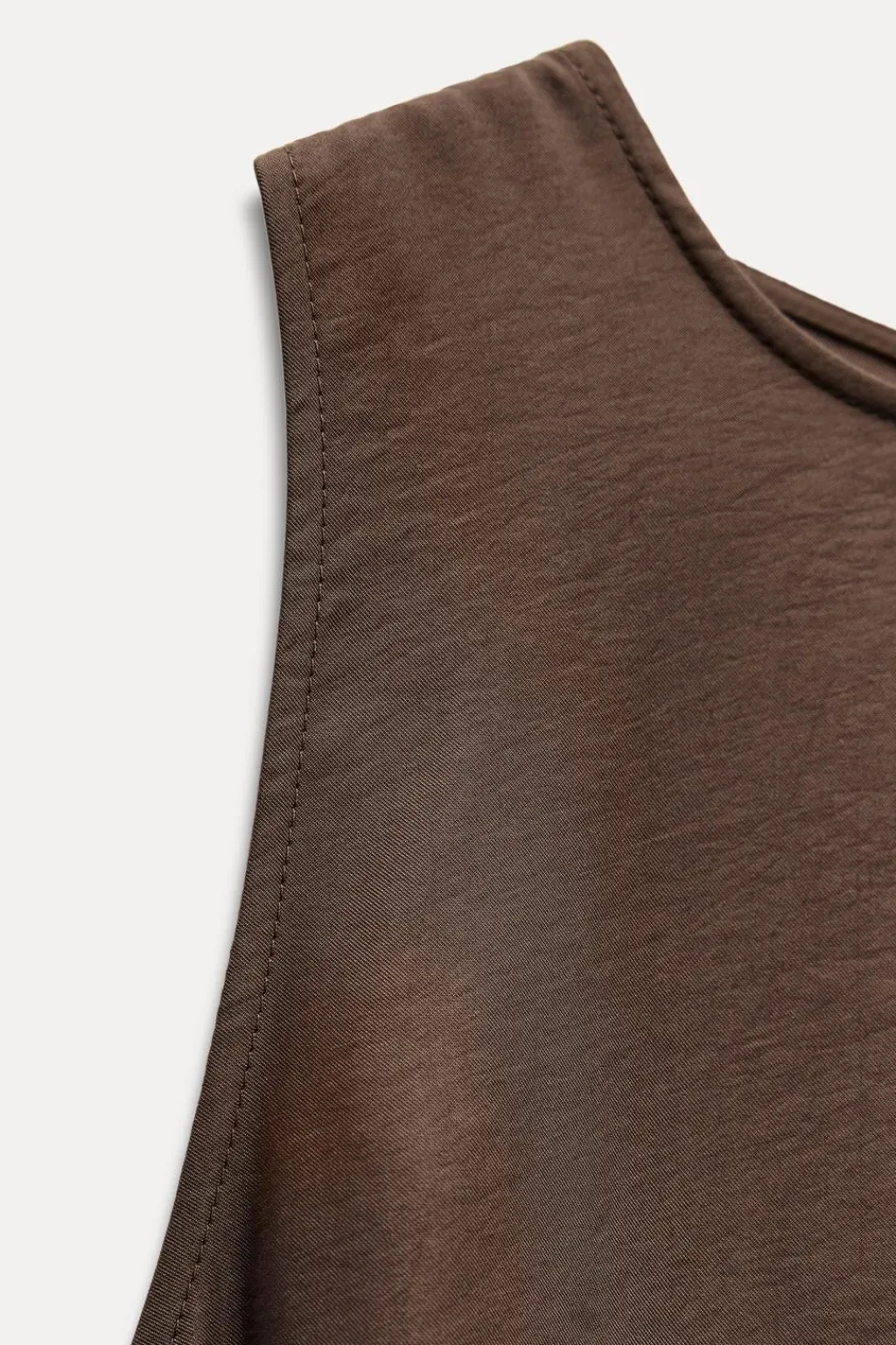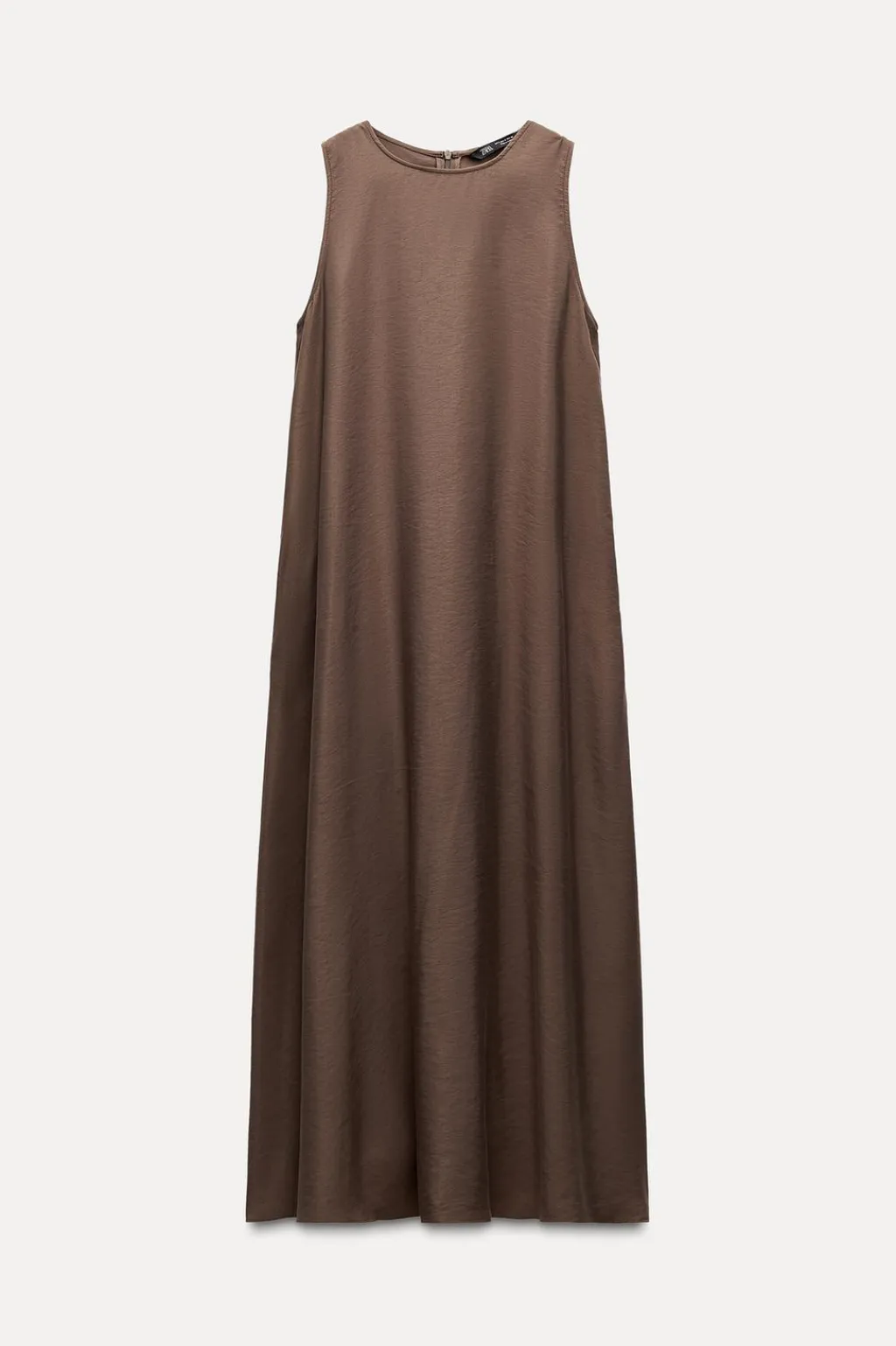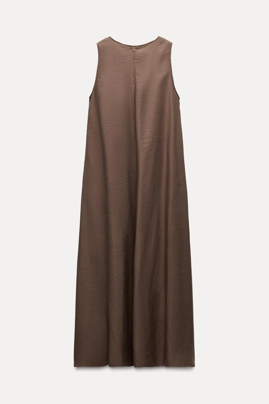 Vestido fluido de cuello redondo y manga sisa. Bolsillos laterales ocultos en costura. Cierre en espalda con cremallera oculta en costura.