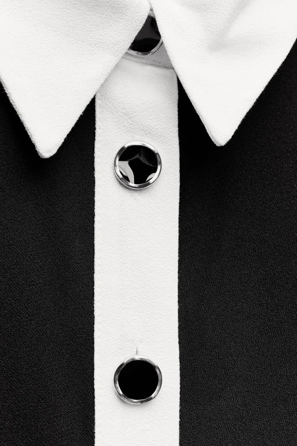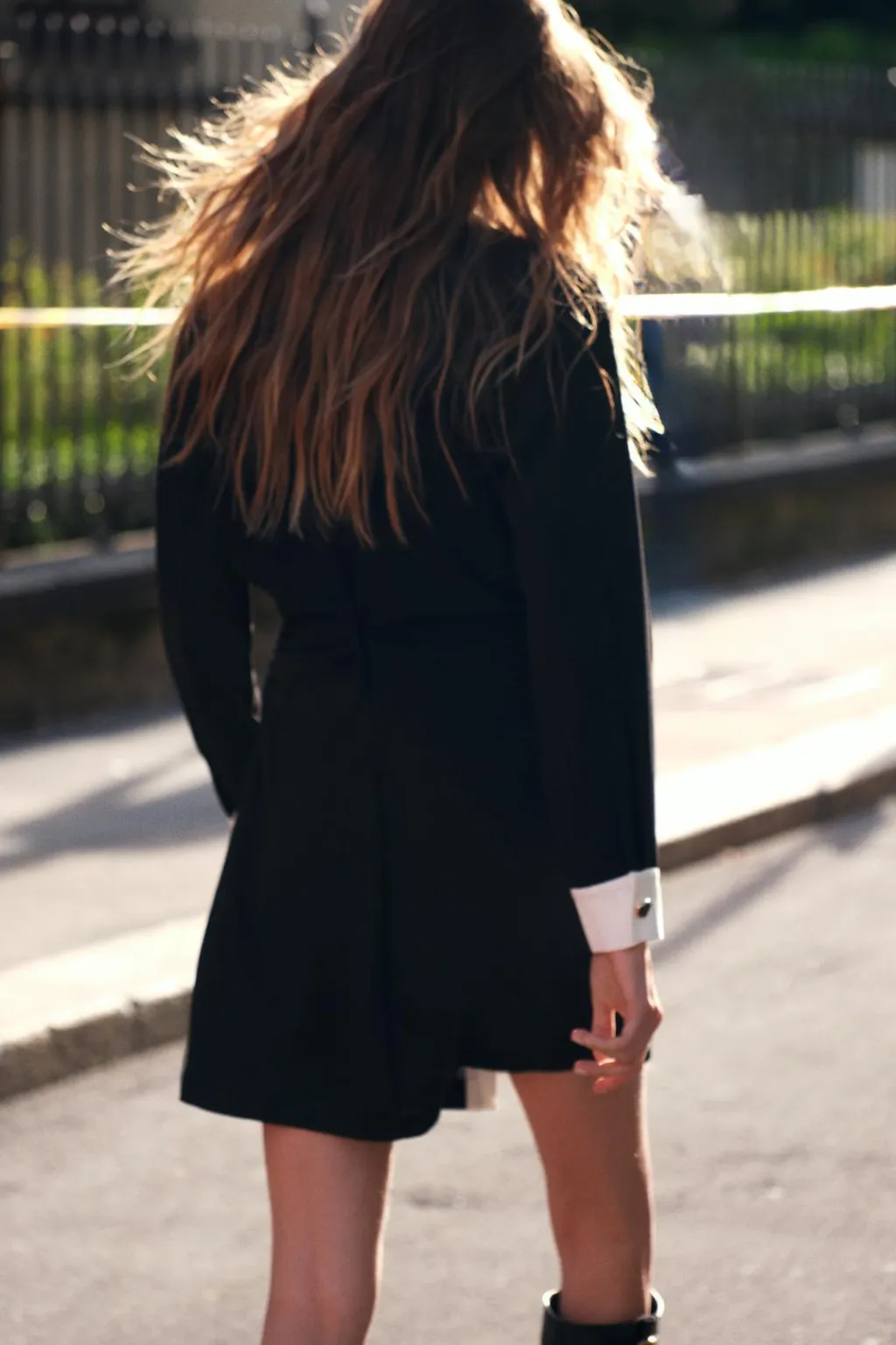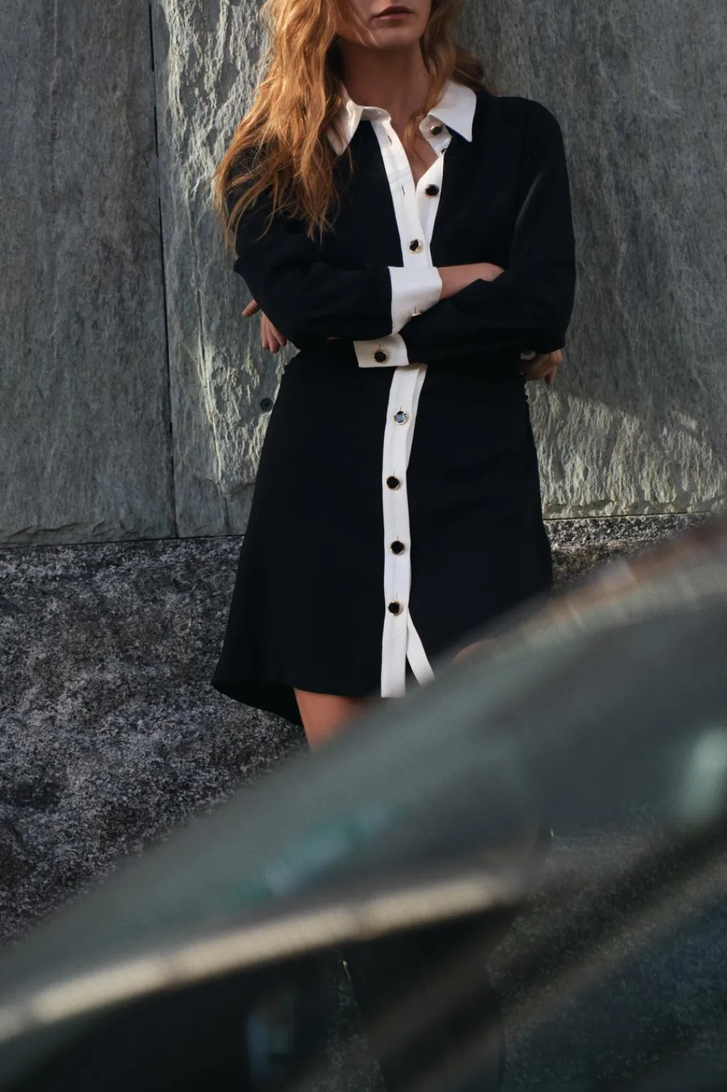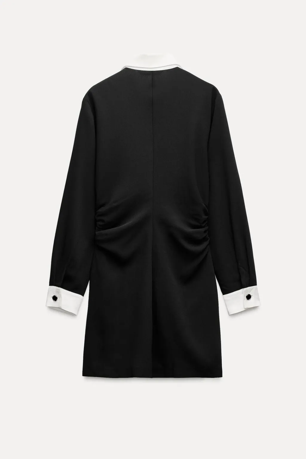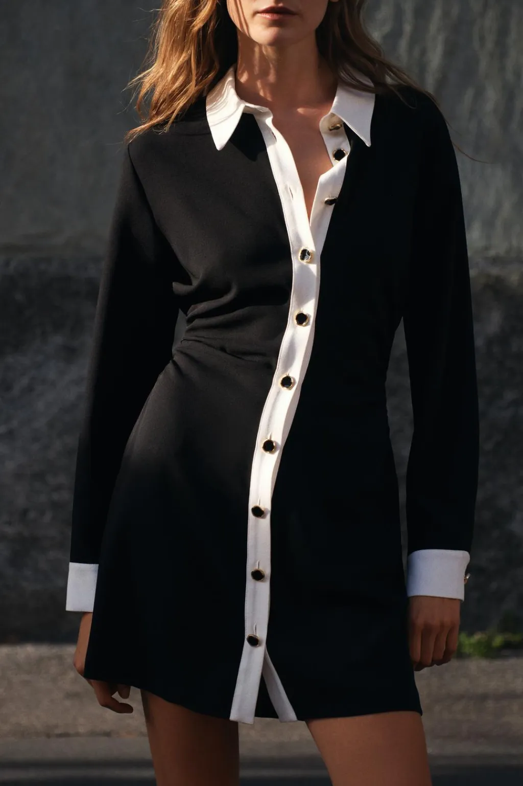 Vestido de cuello solapa y manga larga. Cintura entallada con frunces laterales. Cierre frontal con botones.