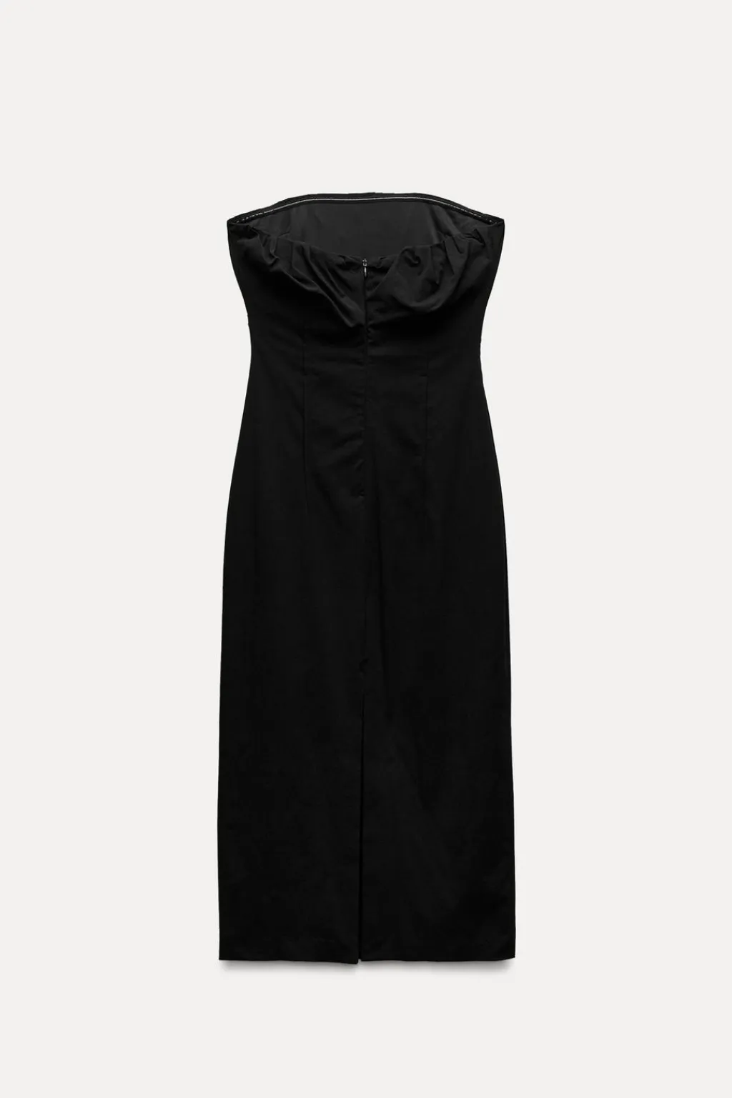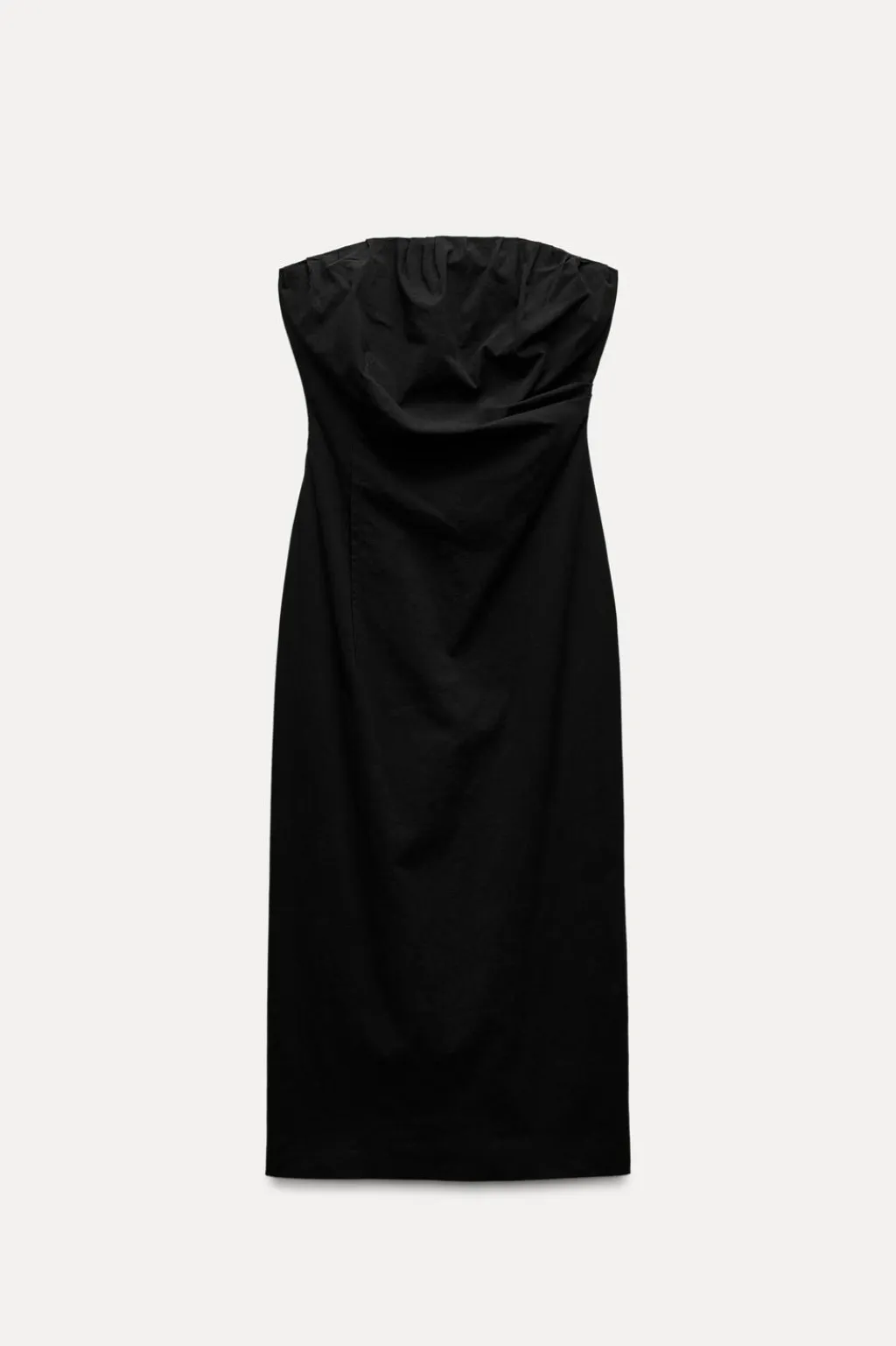 Vestido midi palabra de honor confeccionado en hilatura con mezcla de algodón. Detalle de tejido drapeado. Cierre con cremallera oculta en costura.