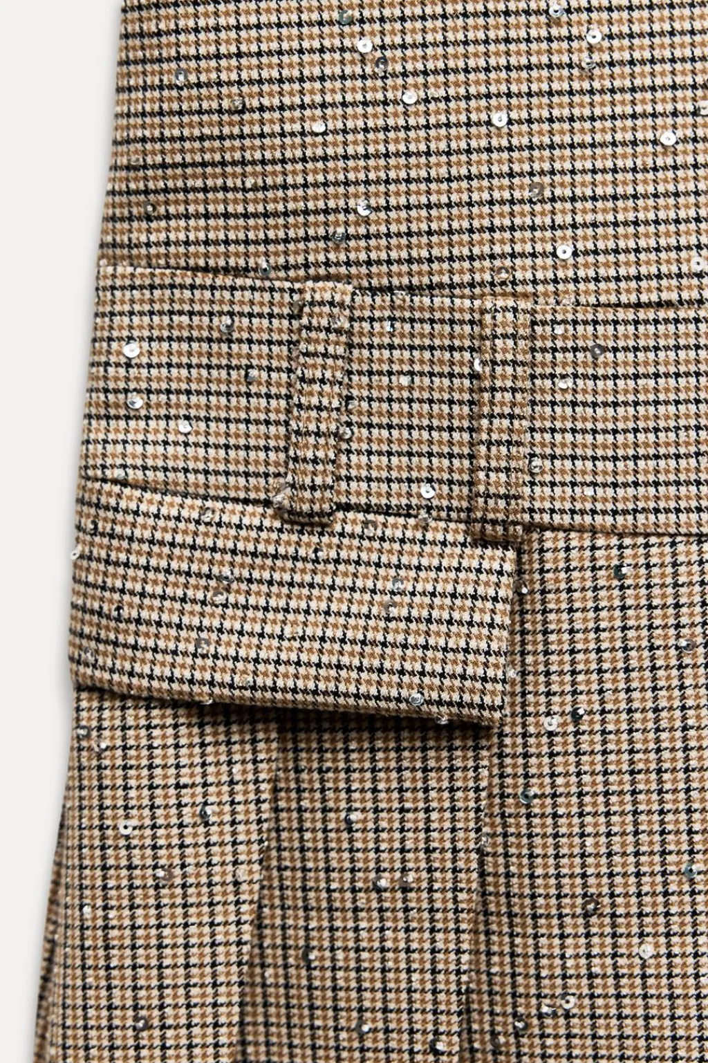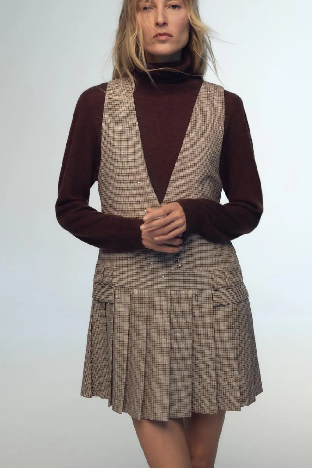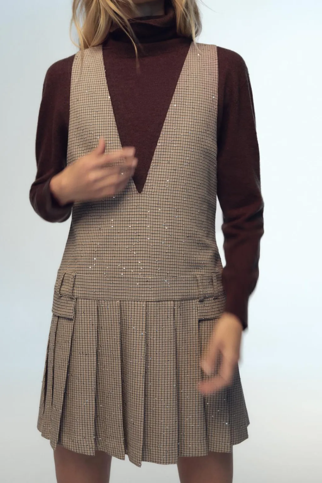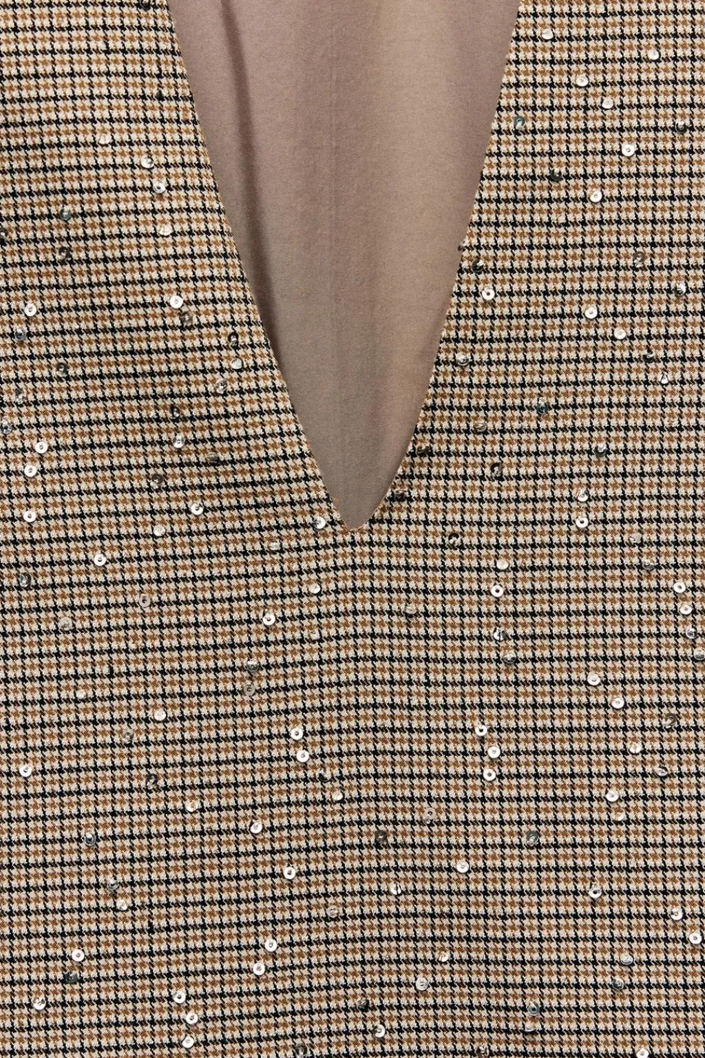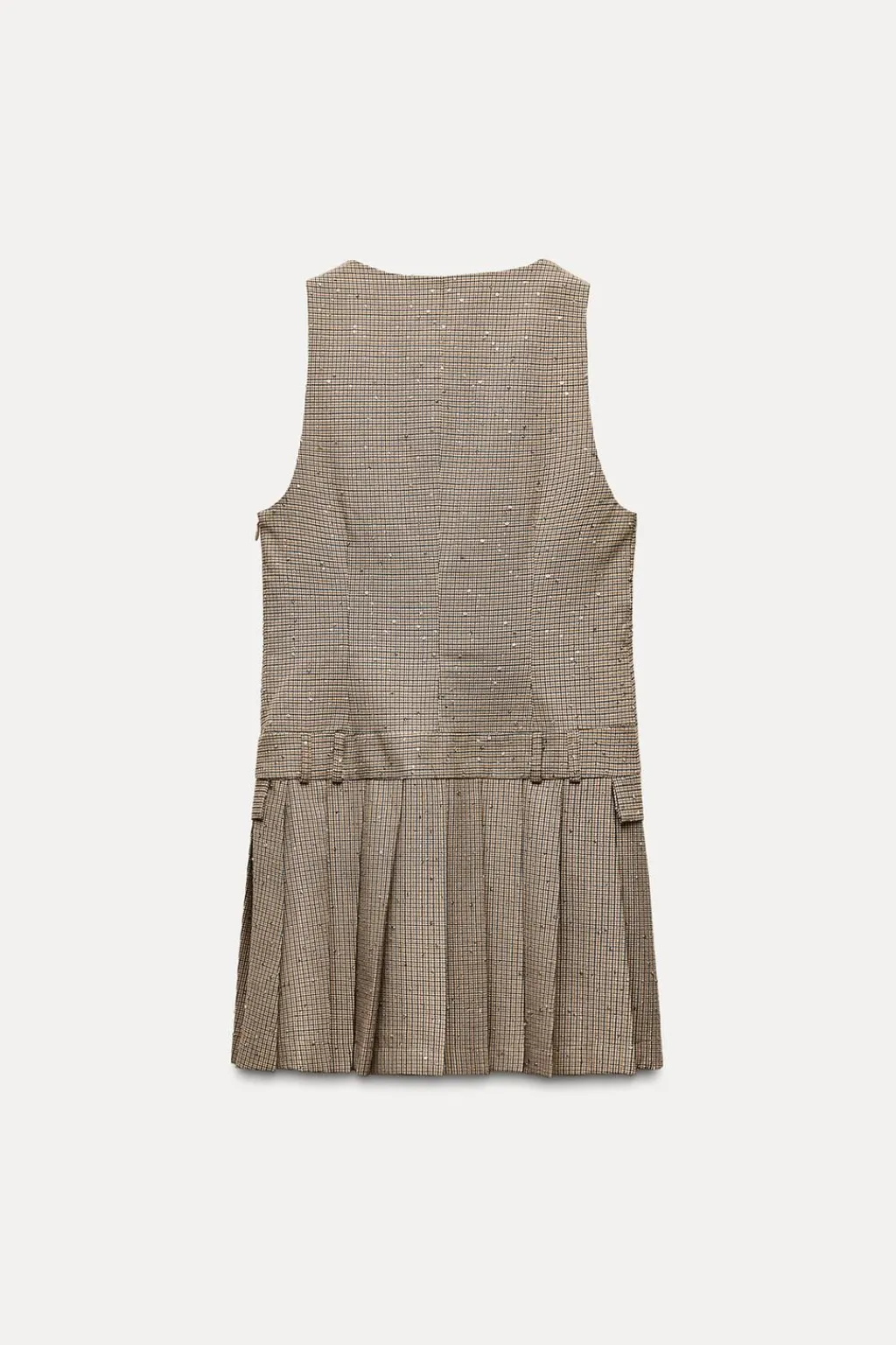 Vestido de escote pico pronunciado y manga sisa. Detalle de falsos bolsillos con solapa delanteros y bajo acabado con pliegues. Aplicación de lentejuelas.
