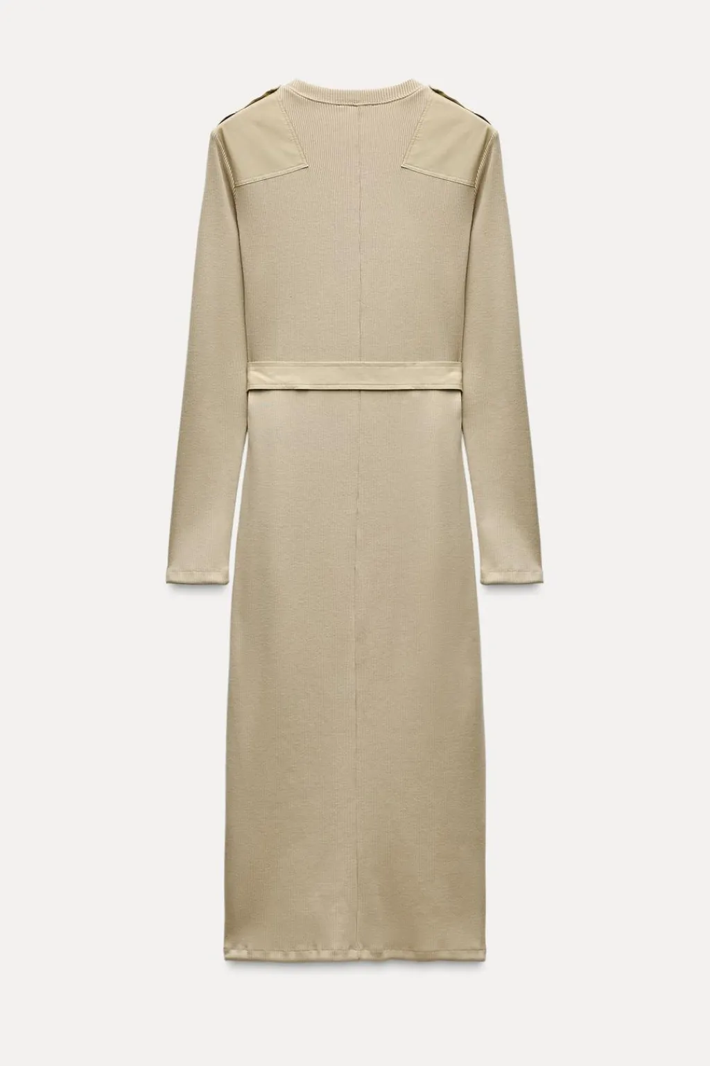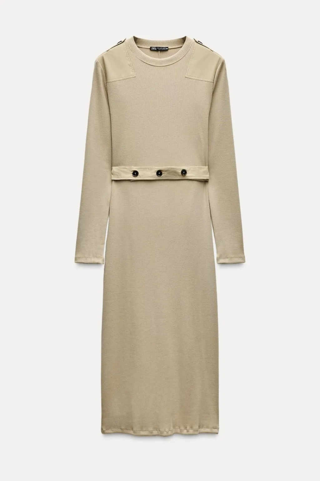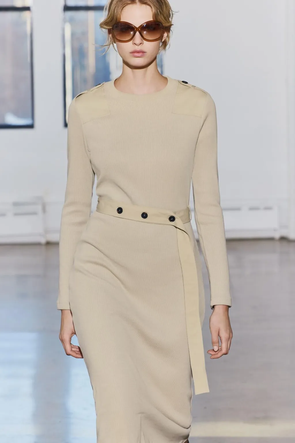 Vestido midi de cuello redondo y manga larga con trabillas en hombros. Cinturón en tejido a tono ajustable con botones. Tejido en rib.