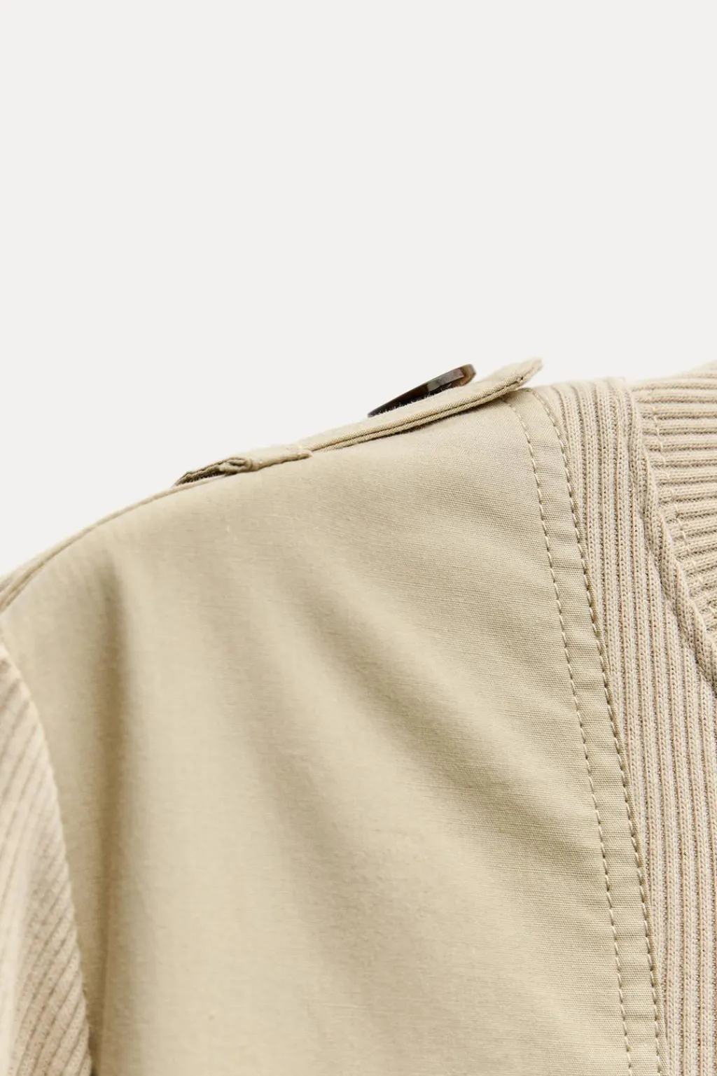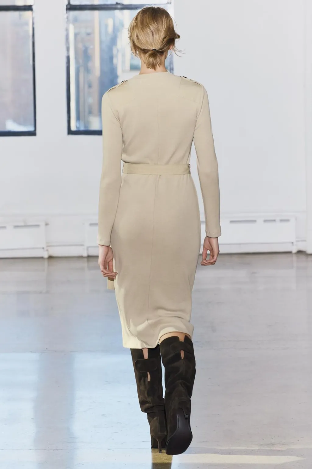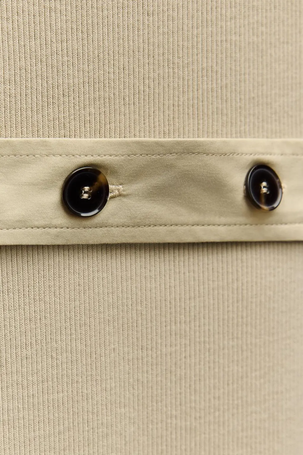 Vestido midi de cuello redondo y manga larga con trabillas en hombros. Cinturón en tejido a tono ajustable con botones. Tejido en rib.