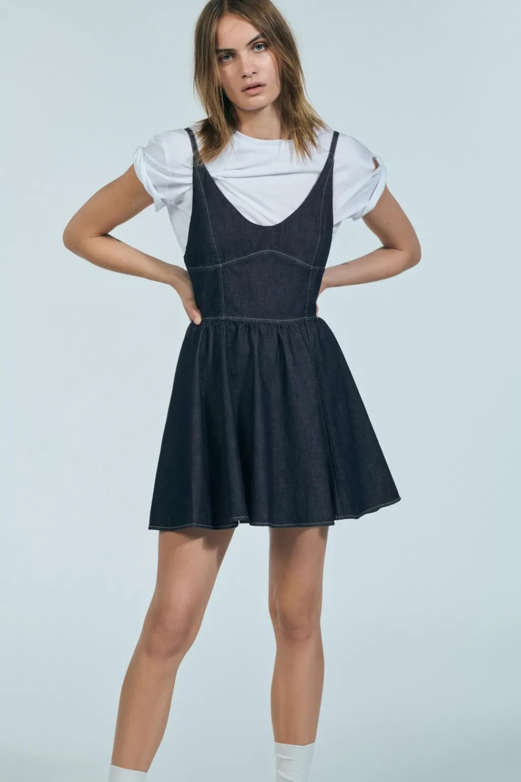 Vestido corto de escote redondo y tirantes finos. Bajo acabado con vuelo. Cierre en espalda con cremallera metálica.