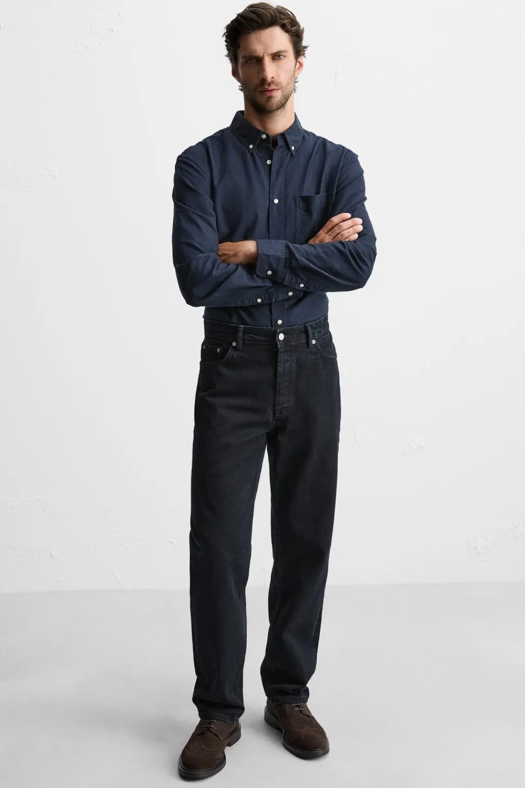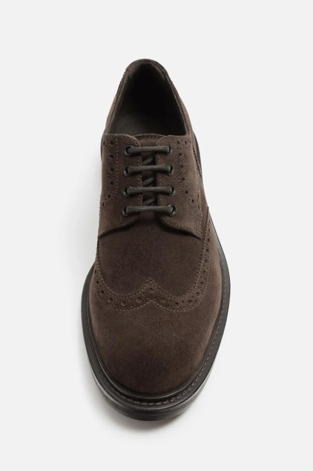 Zapato tipo derby estilo brogue. Parte superior fabricada en piel con acabado serraje con detalles calados. Cordonera con cuatro pasados. Suela a contraste con ligero tacón.