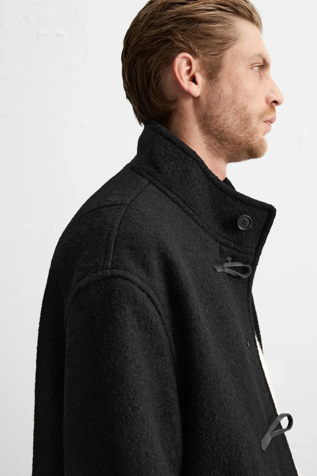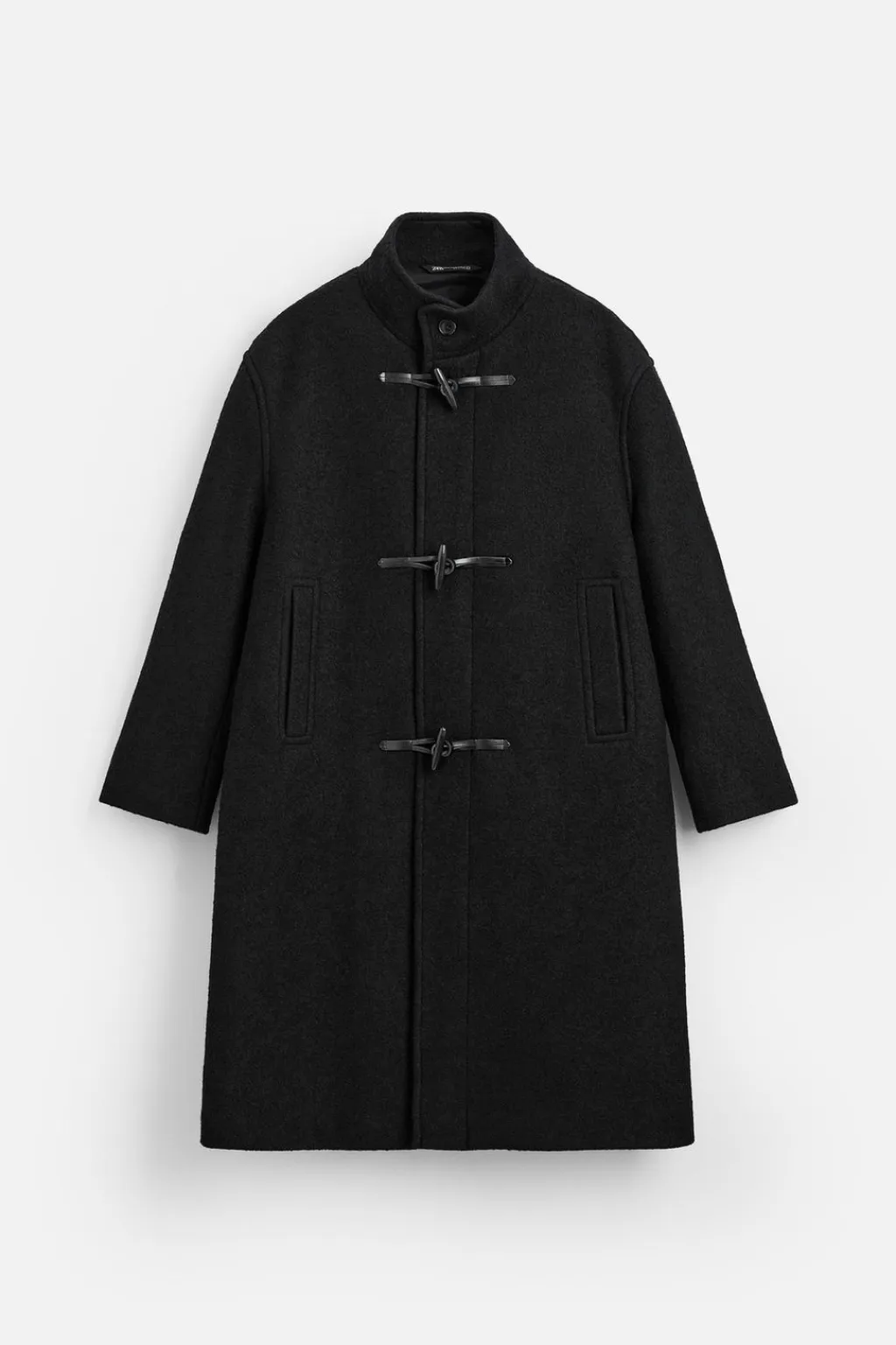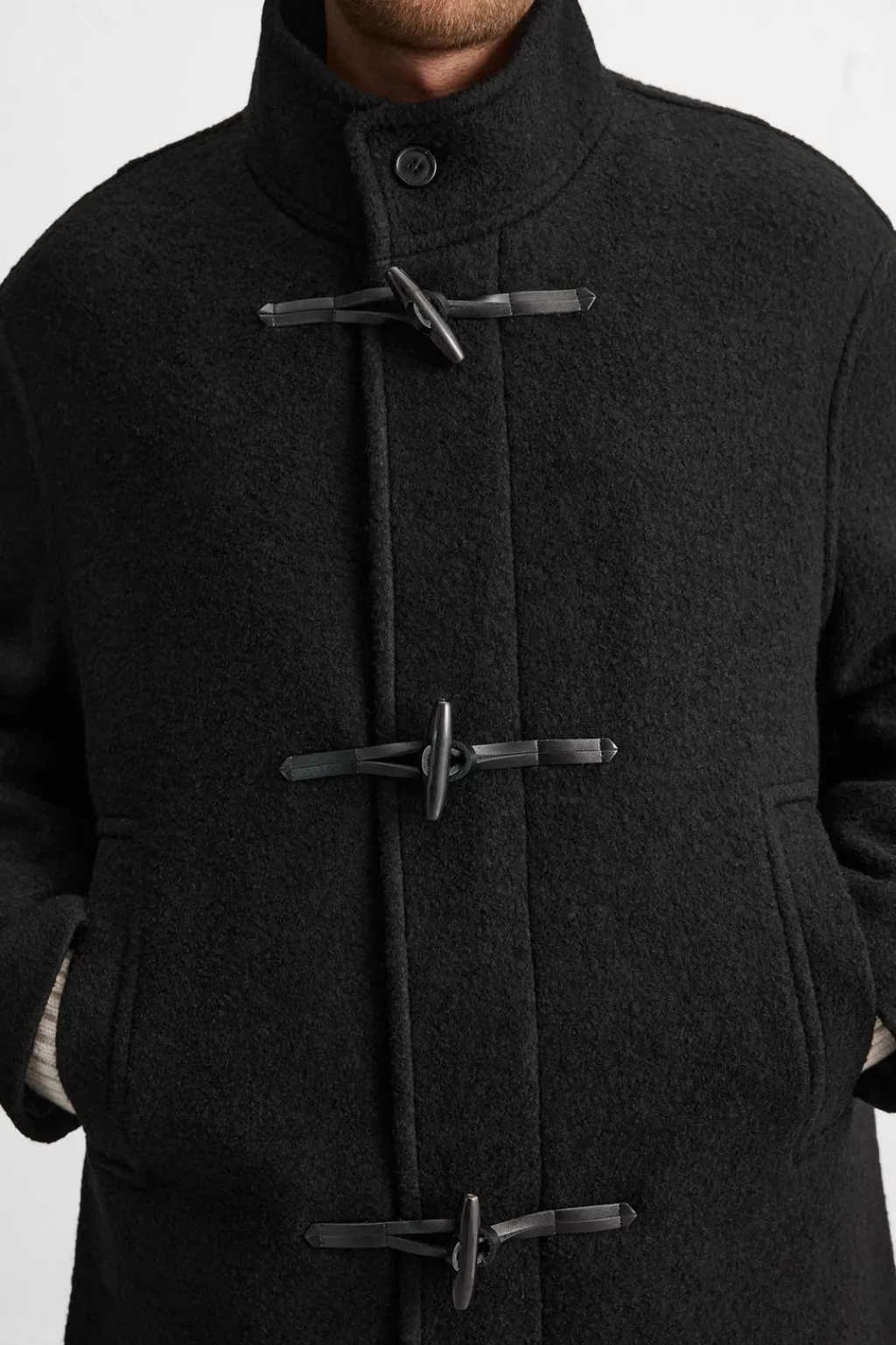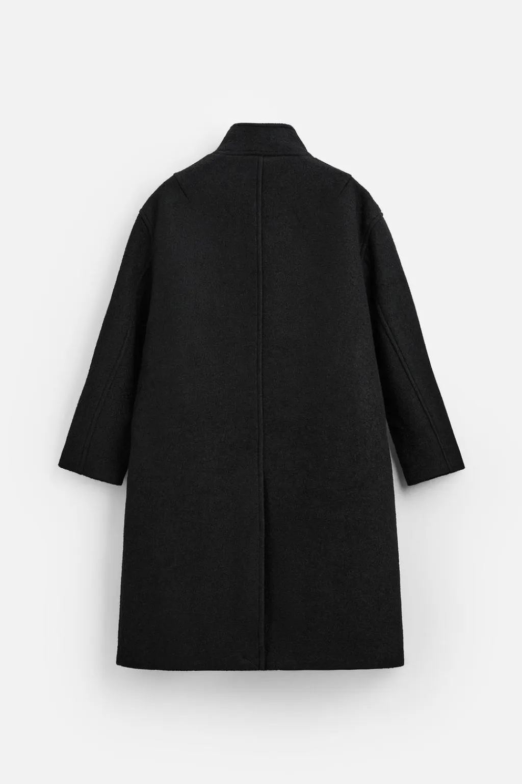 Abrigo regular fit confeccionado en tejido con mezcla de lana. Cuello subido y manga larga. Bolsillos de vivo en cadera y detalle de bolsillo interior. Bajo con abertura central en espalda. Cierre frontal de botonadura oculta por solapa con alamares.