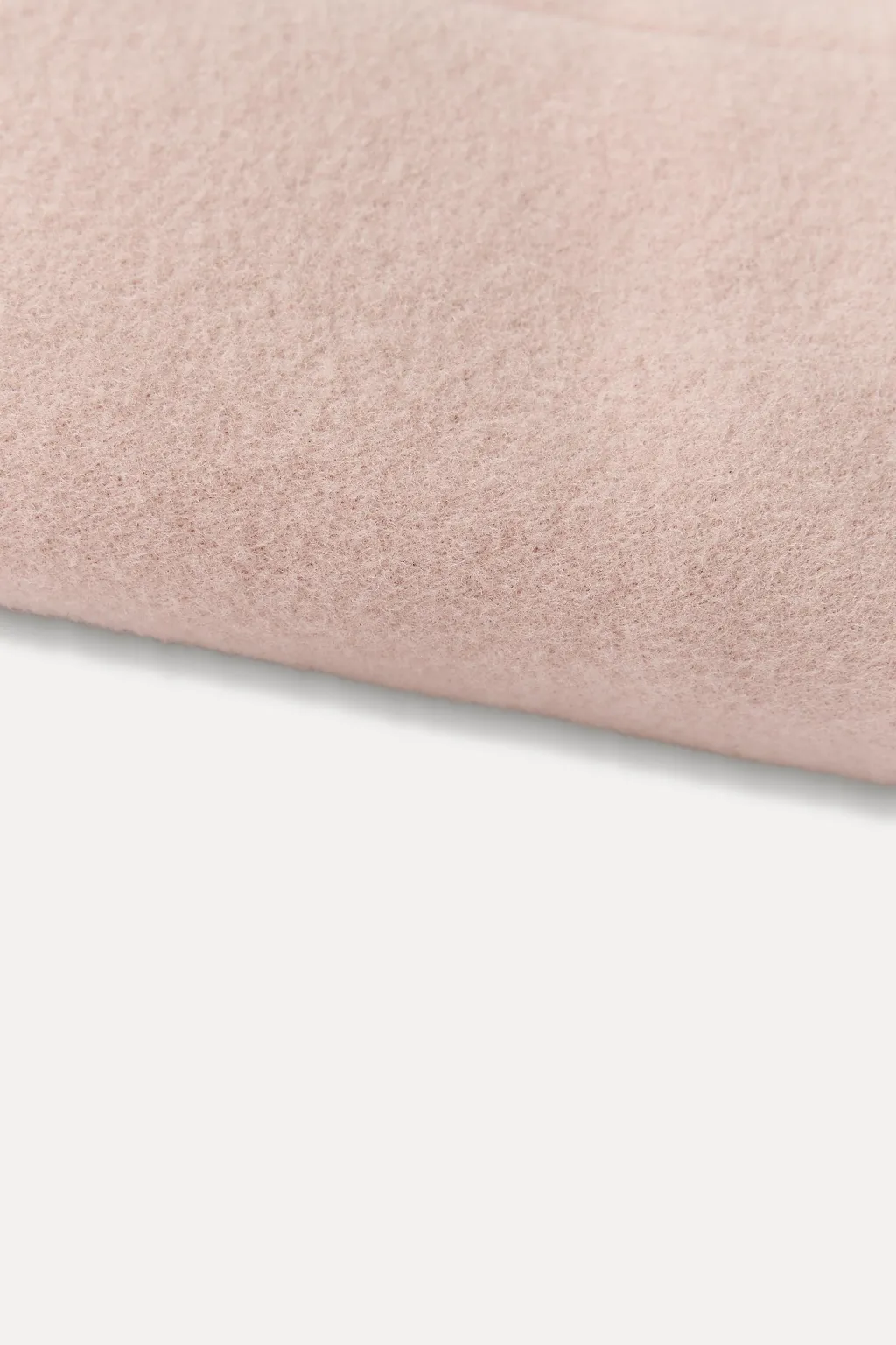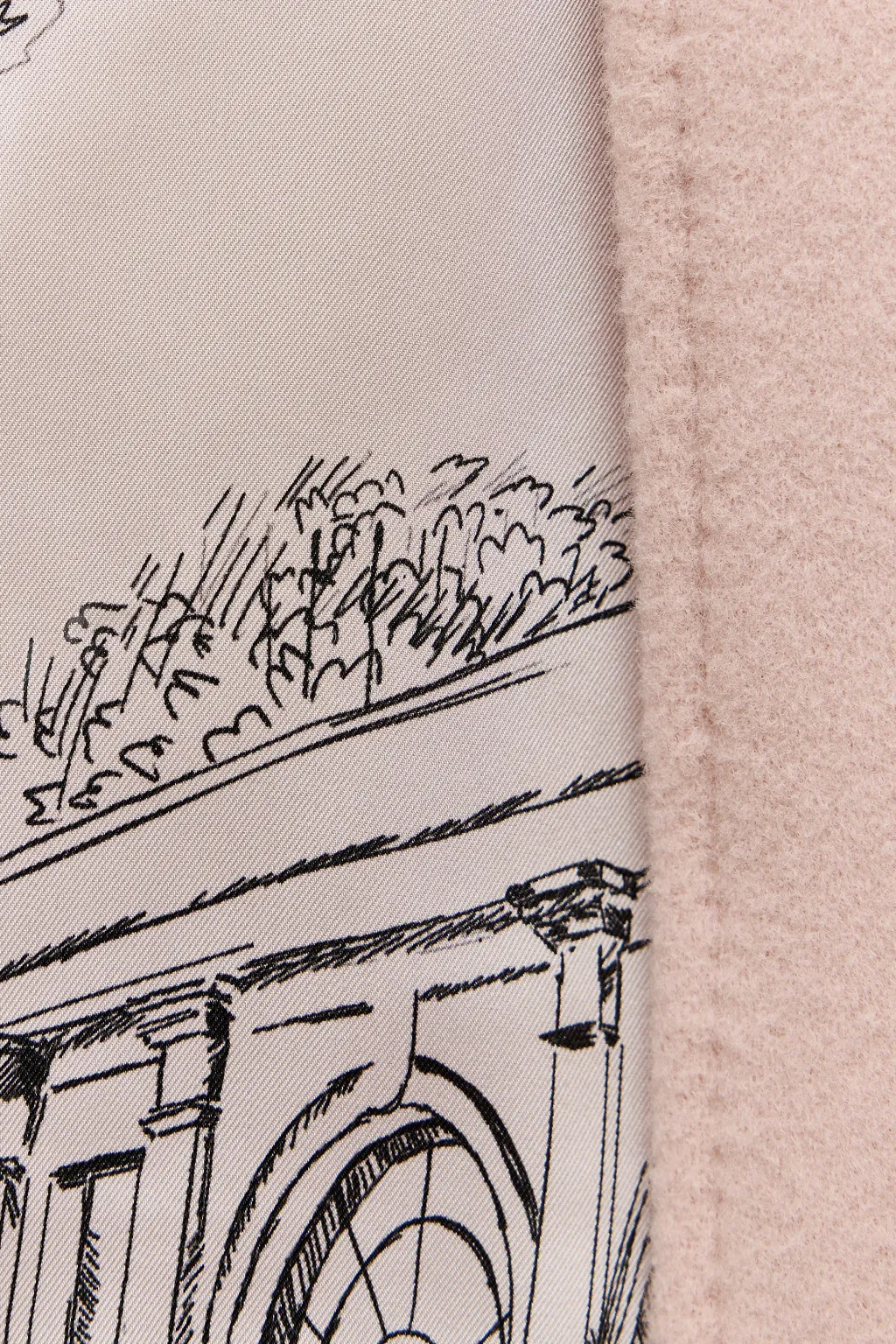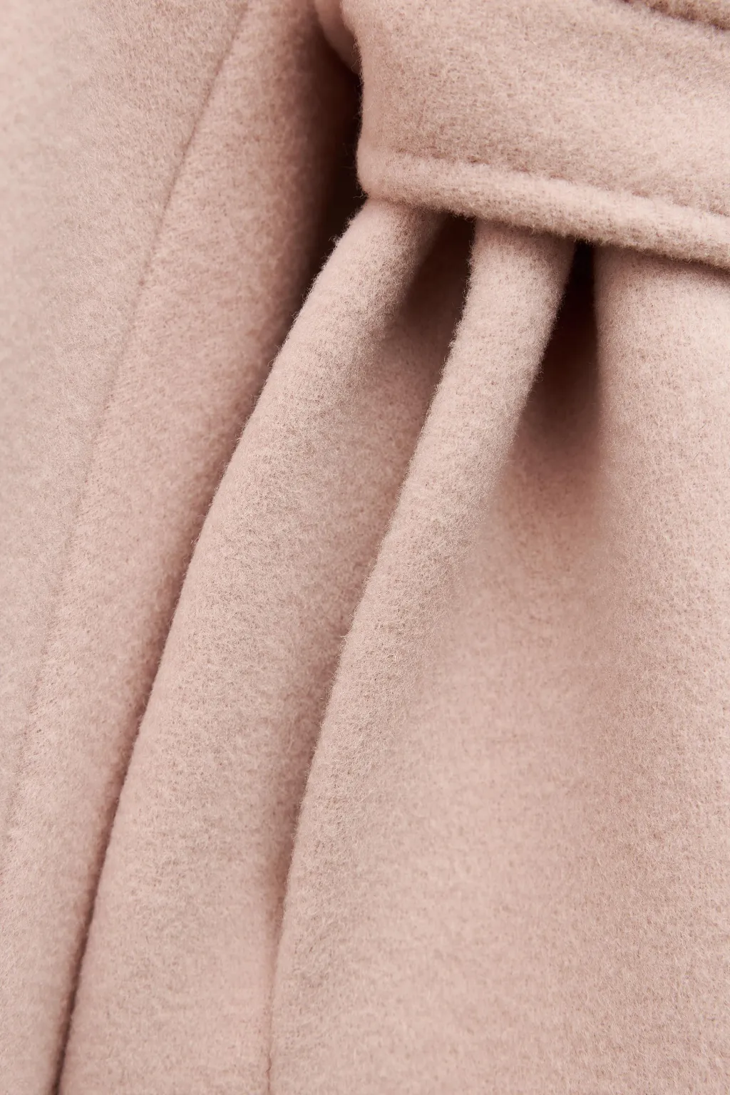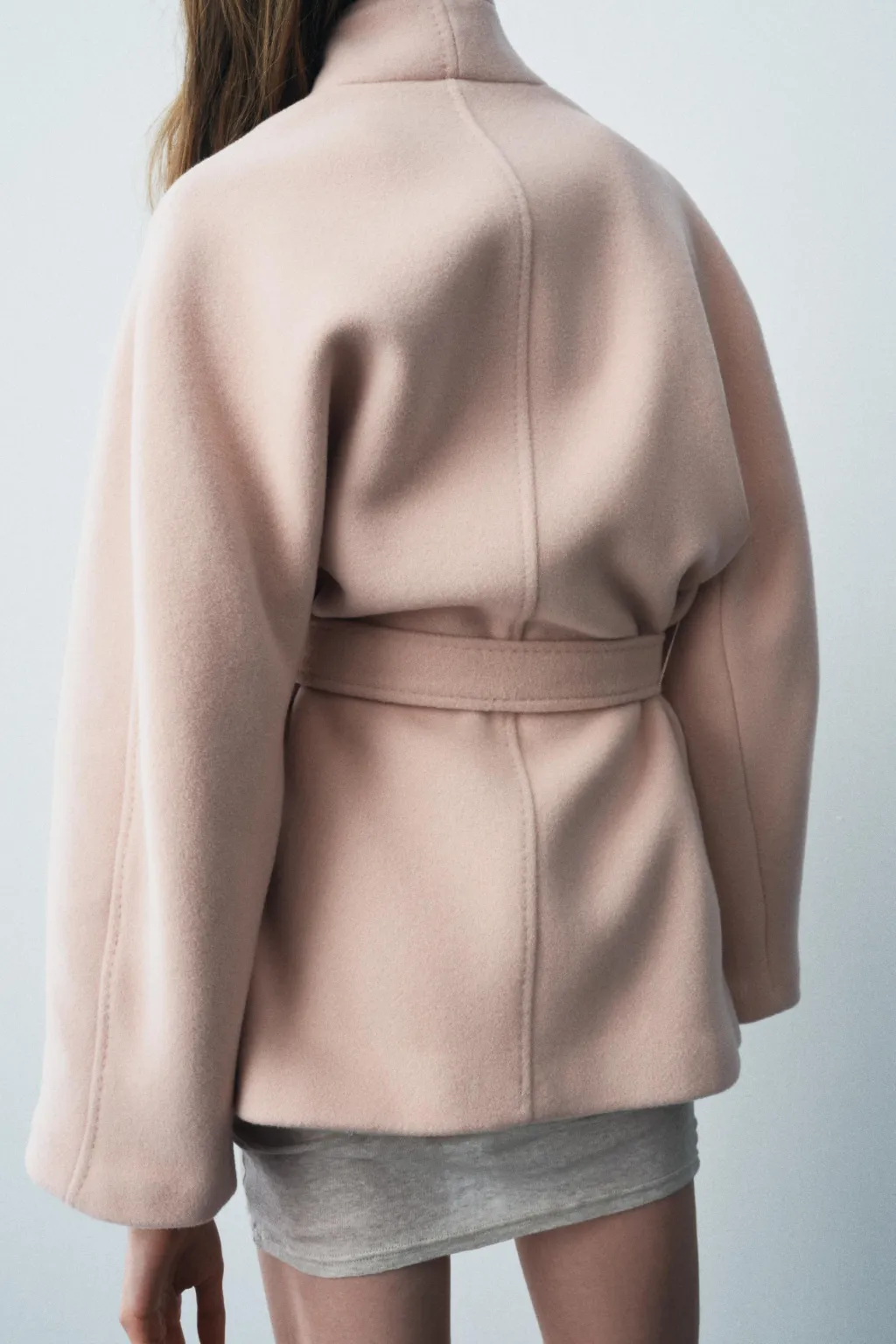 Abrigo corto confeccionado en hilatura con mezcla de lana Manteco. Manga larga. Cinturón en mismo tejido ajustable con lazadas. Forro interior estampado combinado a contraste.