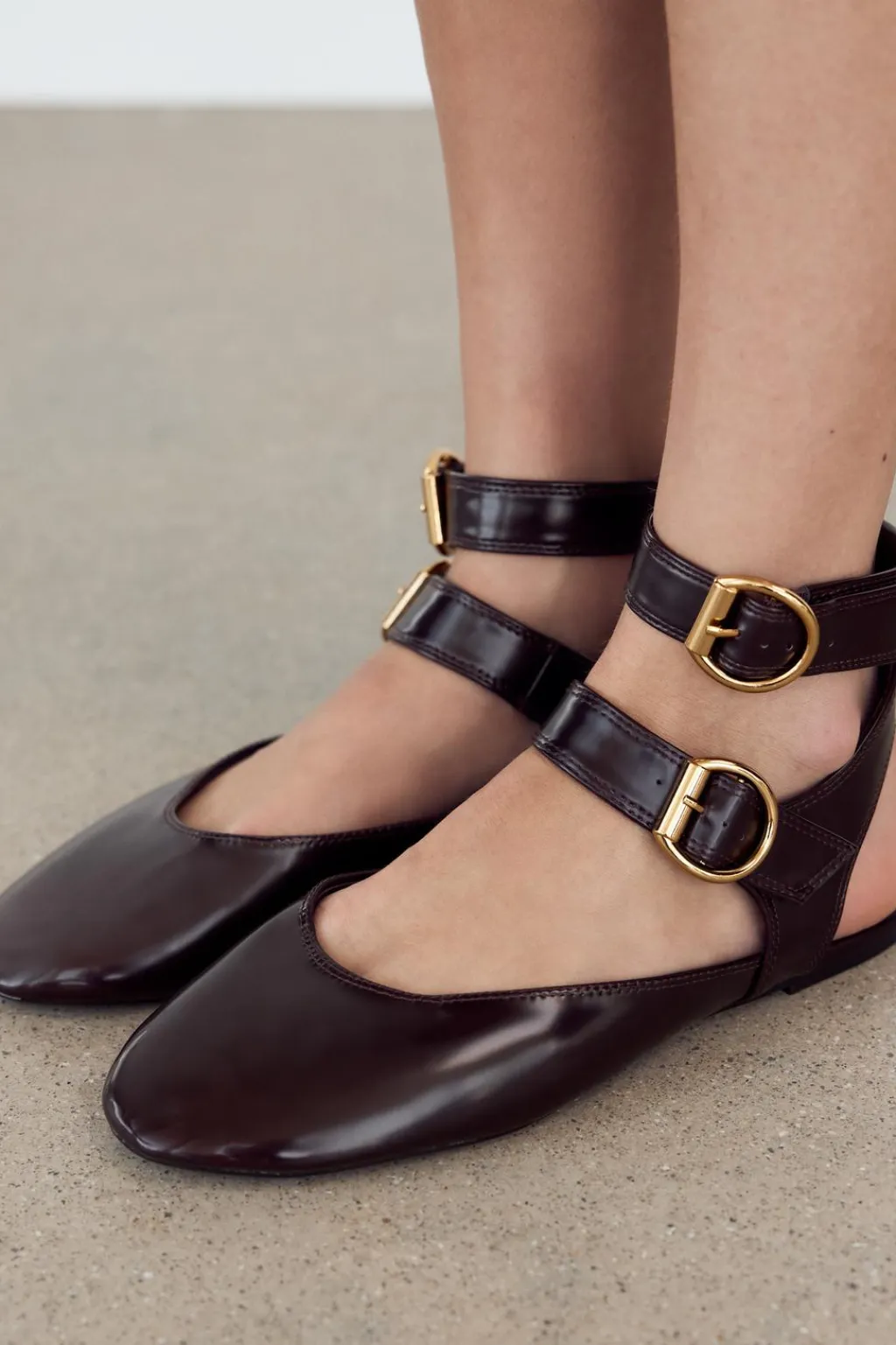 Zapato plano destalonado tipo bailarina. Detalle de doble hebilla en las tiras al tobillo. Acabado en punta redonda.