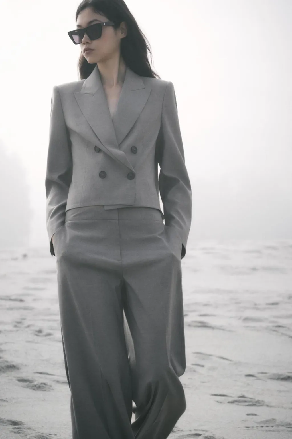 Blazer de cuello solapa y manga larga con hombreras. Cierre frontal cruzado con botones.