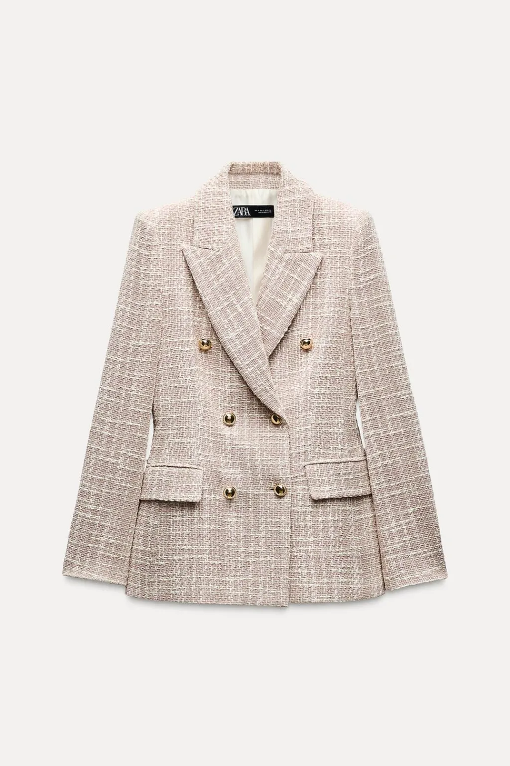 Blazer de cuello solapa y manga larga con hombreras. Bolsillos delanteros con solapa. Cierre frontal cruzado con botones dorados.