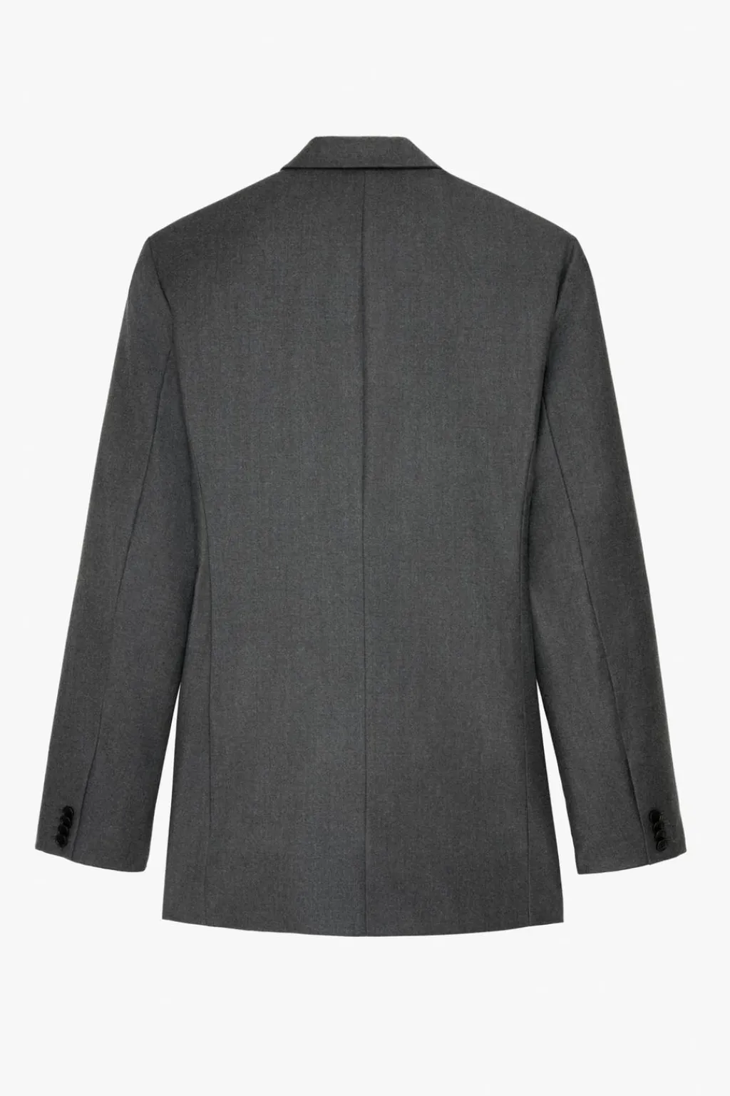 Blazer larga slim fitconfeccionada en tejido de lana de origen italiano. Acabado franela.Cuello con solapas de pico y manga larga acabada en puño con botones. Bolsillos de solapa en cadera. Detalle de bolsillo interior. Cierre frontal de botonadura cruzada.