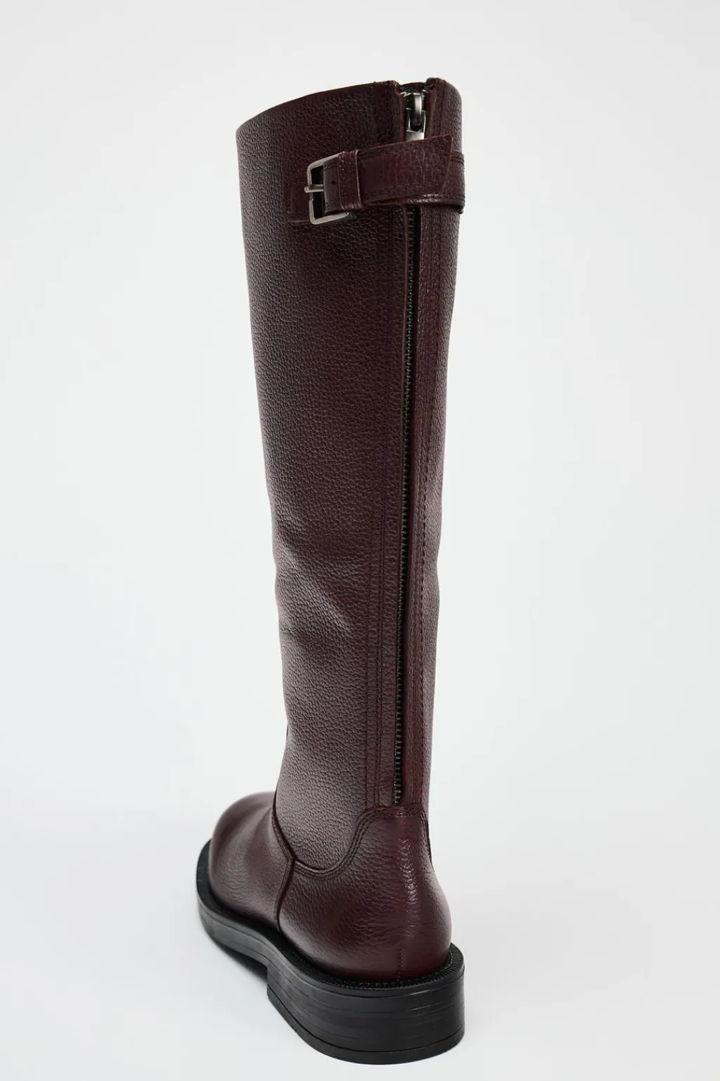 Zapato tipo bota en piel. Detalle de hebilla en la caña. Cierre mediante cremallera trasera. Acabada en punta redonda.