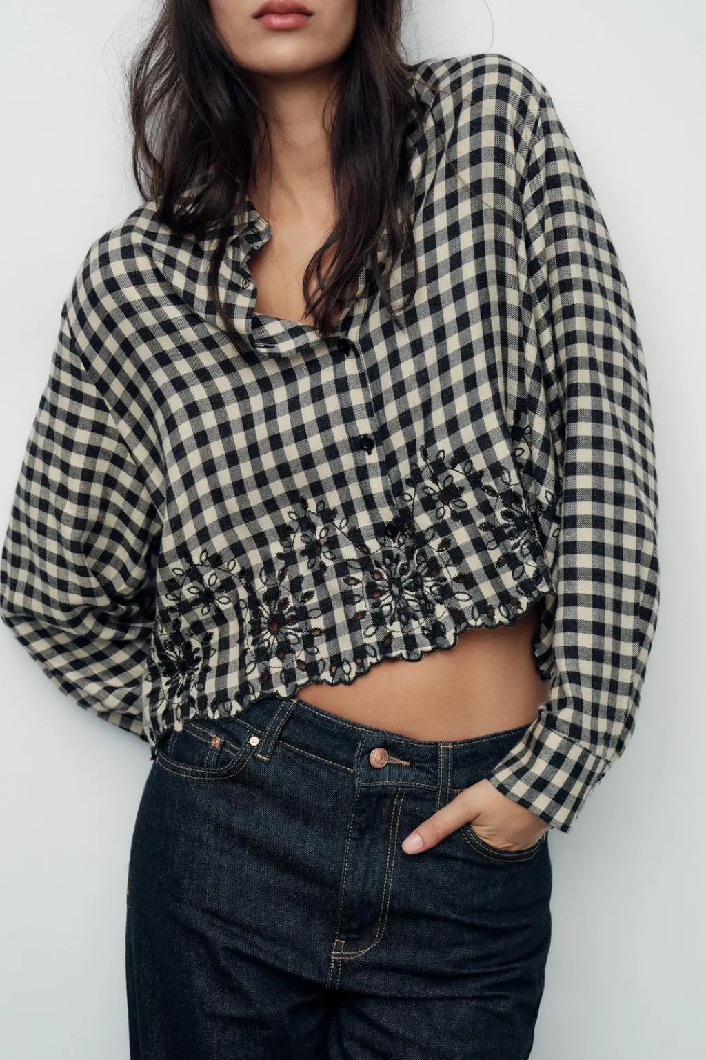 Camisa de cuello solapa y manga larga. Bajo con bordados perforados. Cierre frontal con botones.