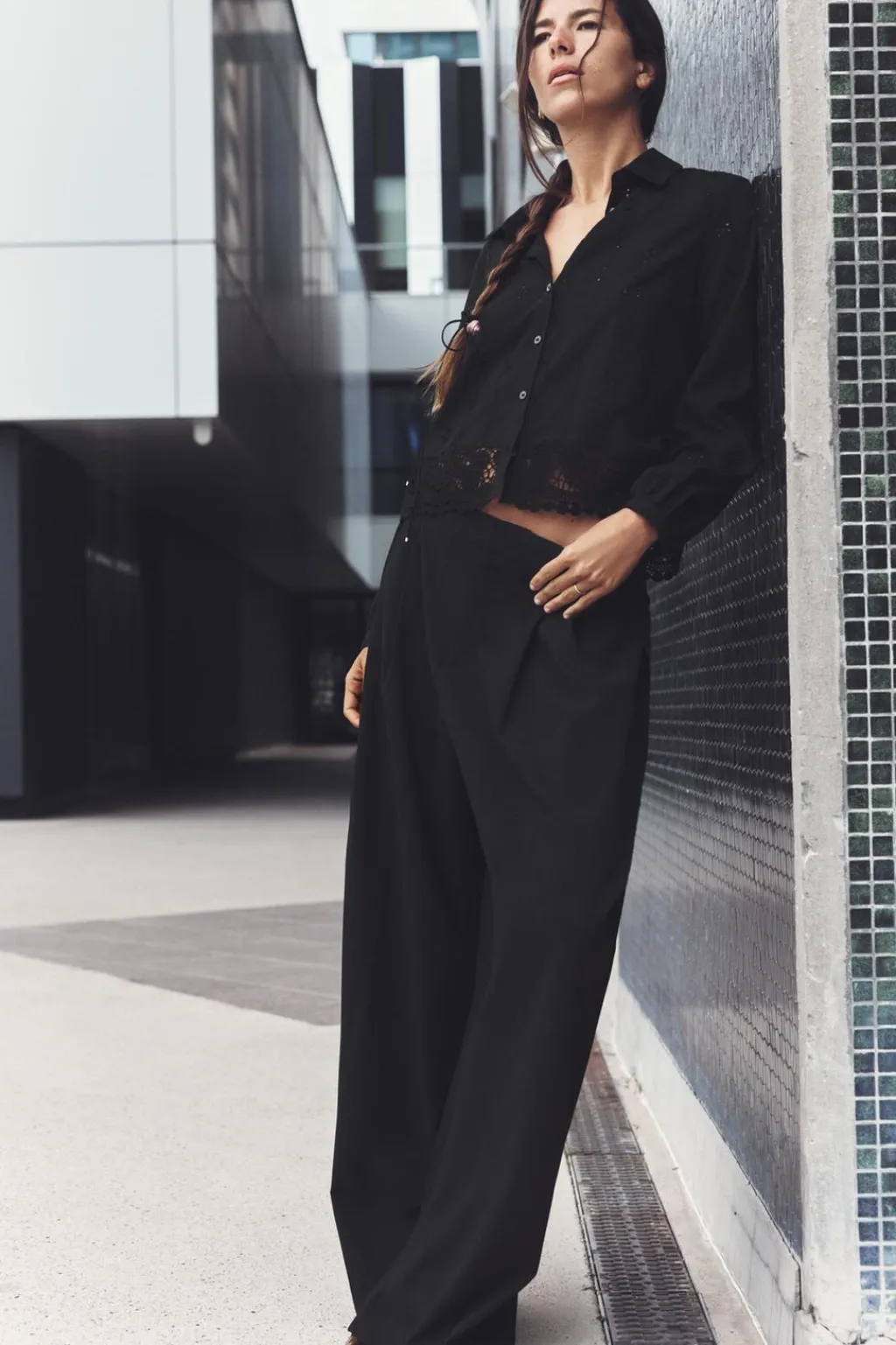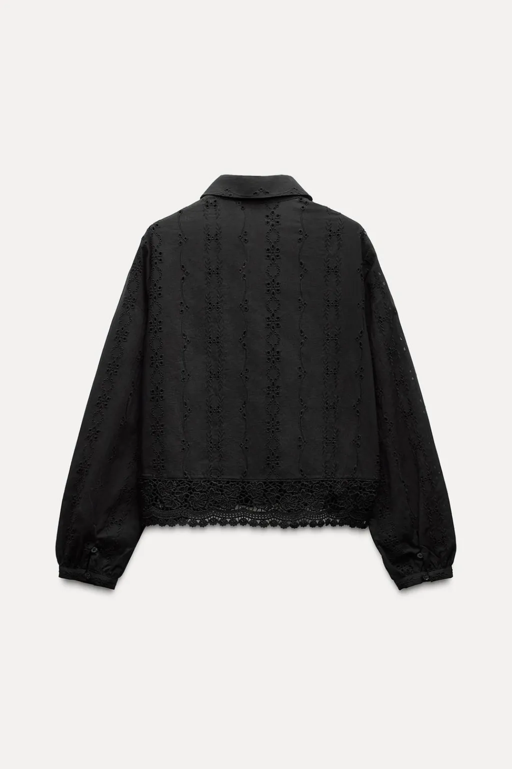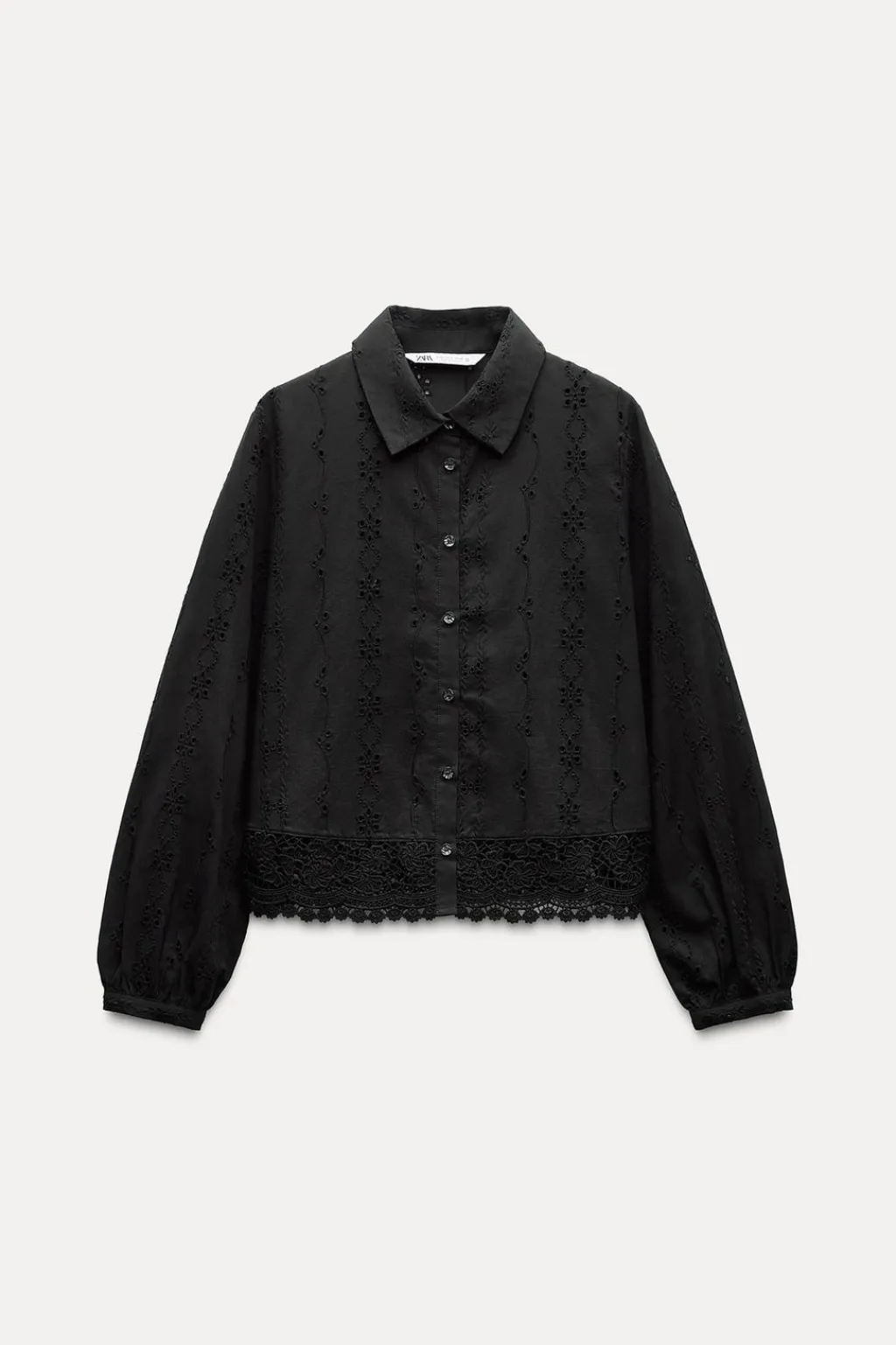 Camisa de cuello solapa y manga larga. Detalle de bordados perforados a tono. Cierre frontal con botones.