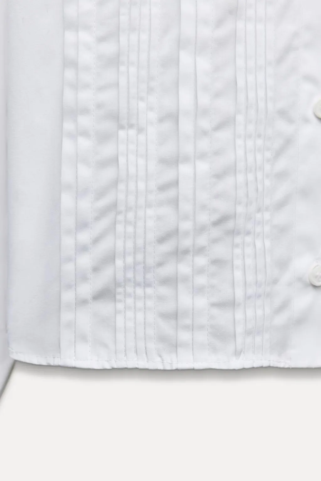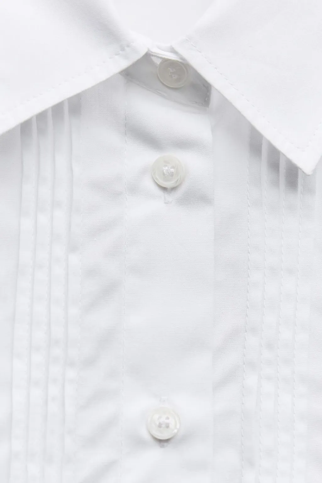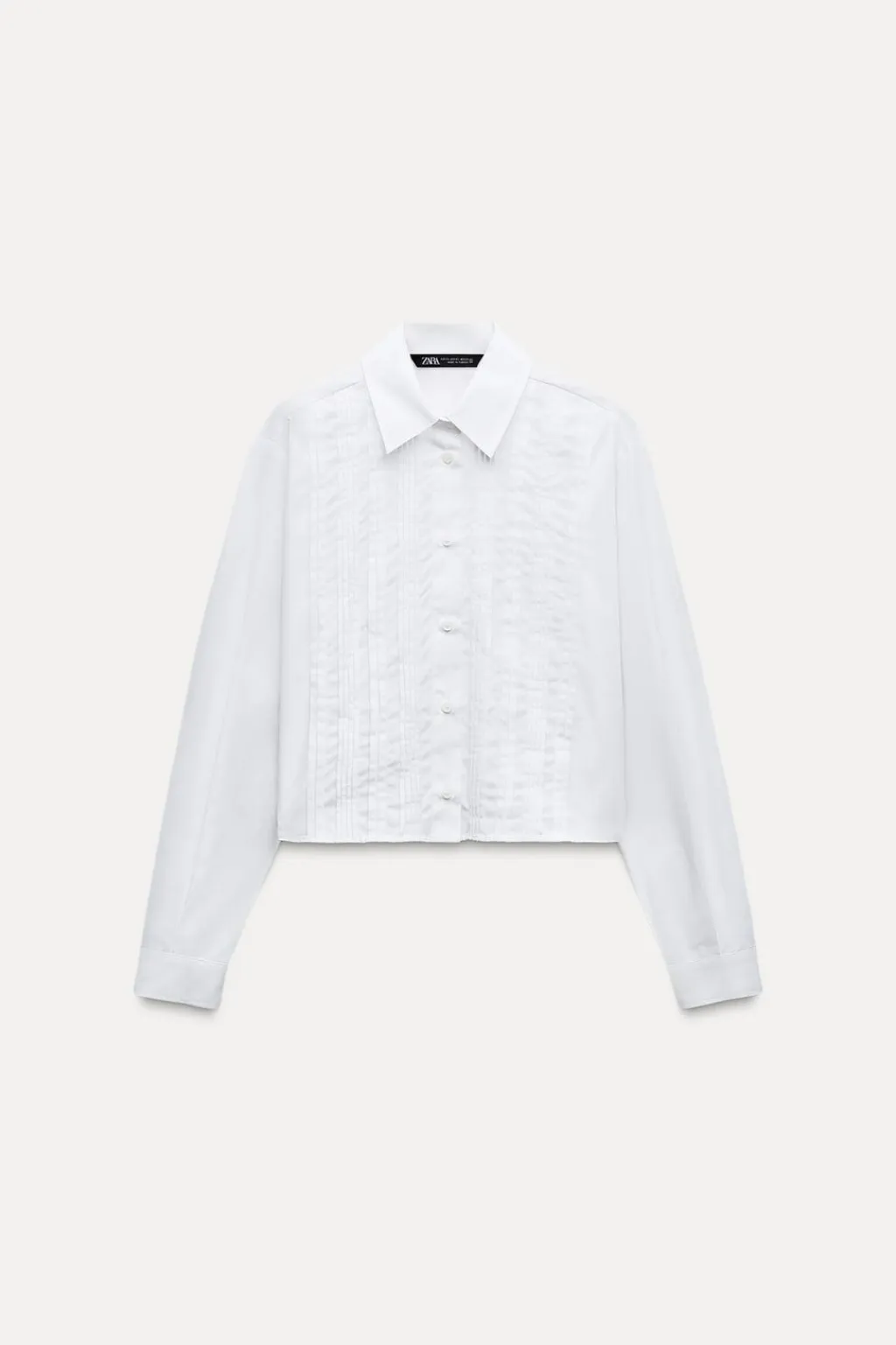 Camisa corta de cuello solapa y manga larga. Detalle de jaretas delanteras. Cierre frontal con botones.