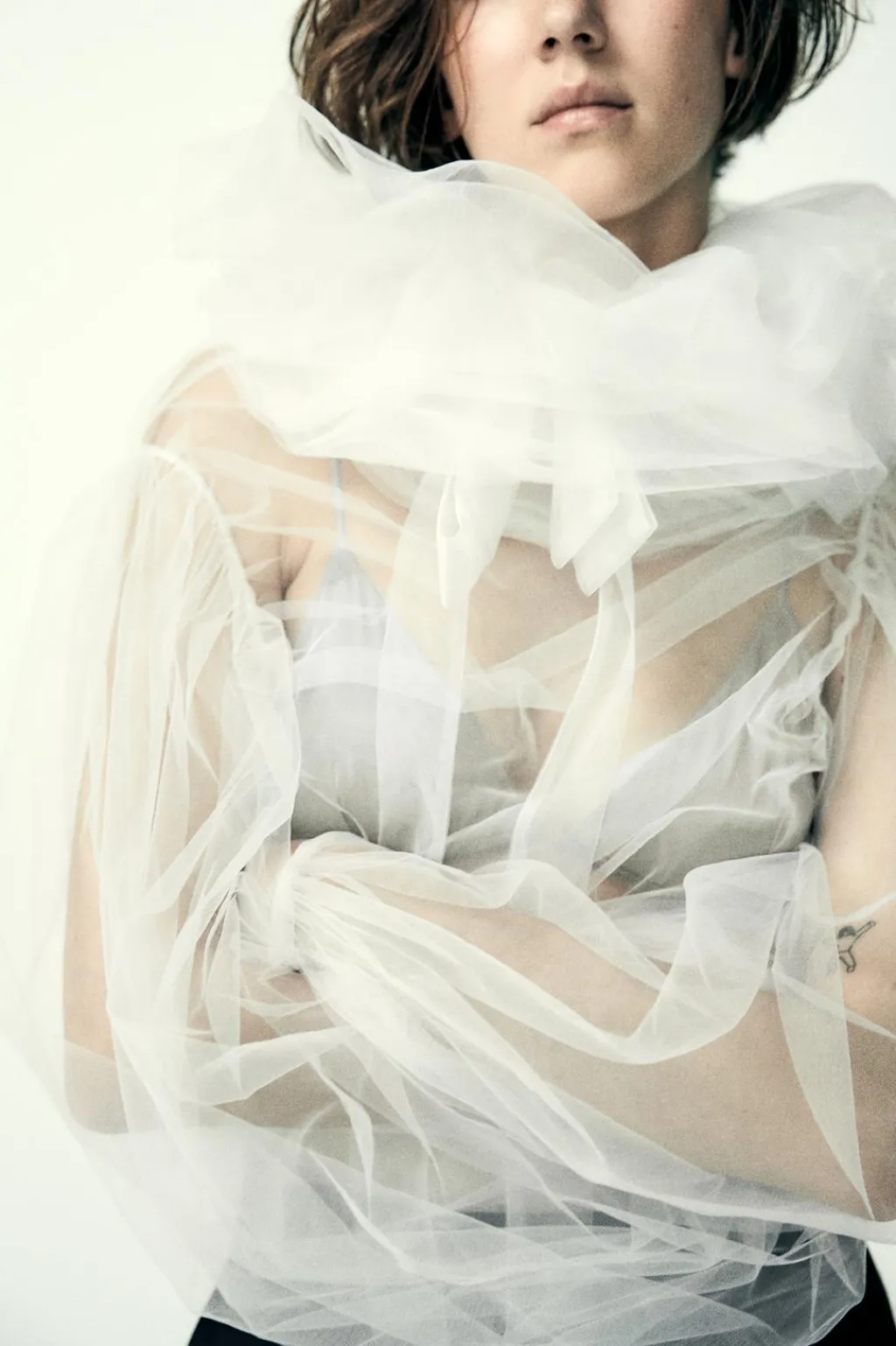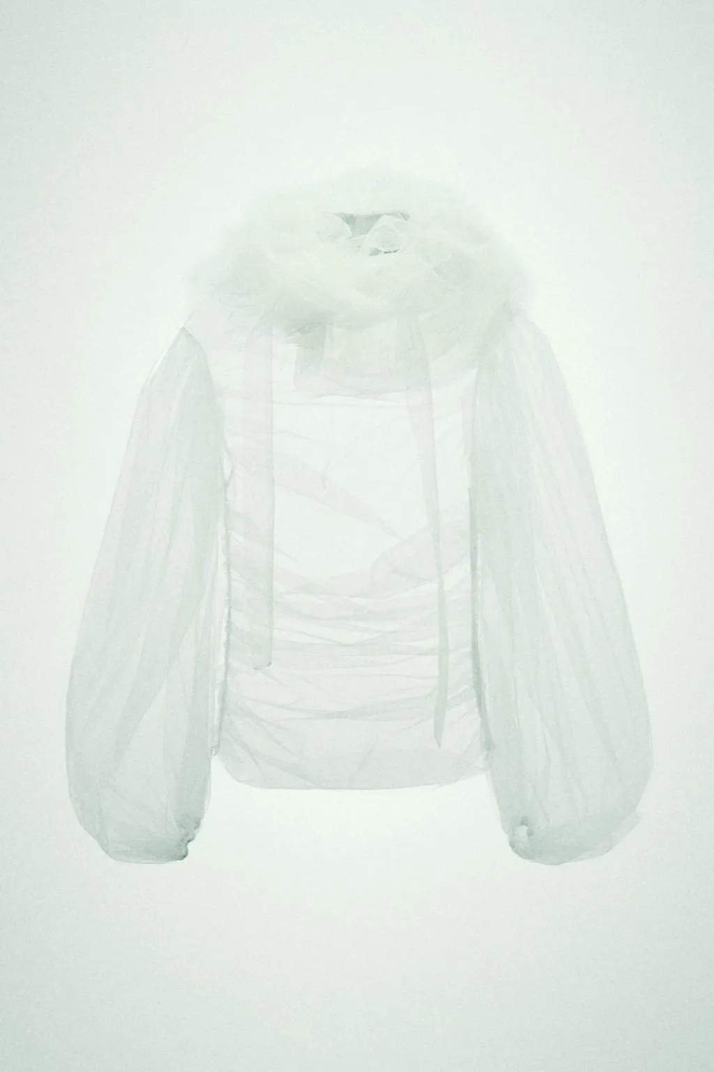 Camisa semitransparente de cuello redondo y manga larga acabada en elástico. Detalle de maxi cuello con volumen. Cierre en cuello con botones y lateral con cremallera oculta en costura.
