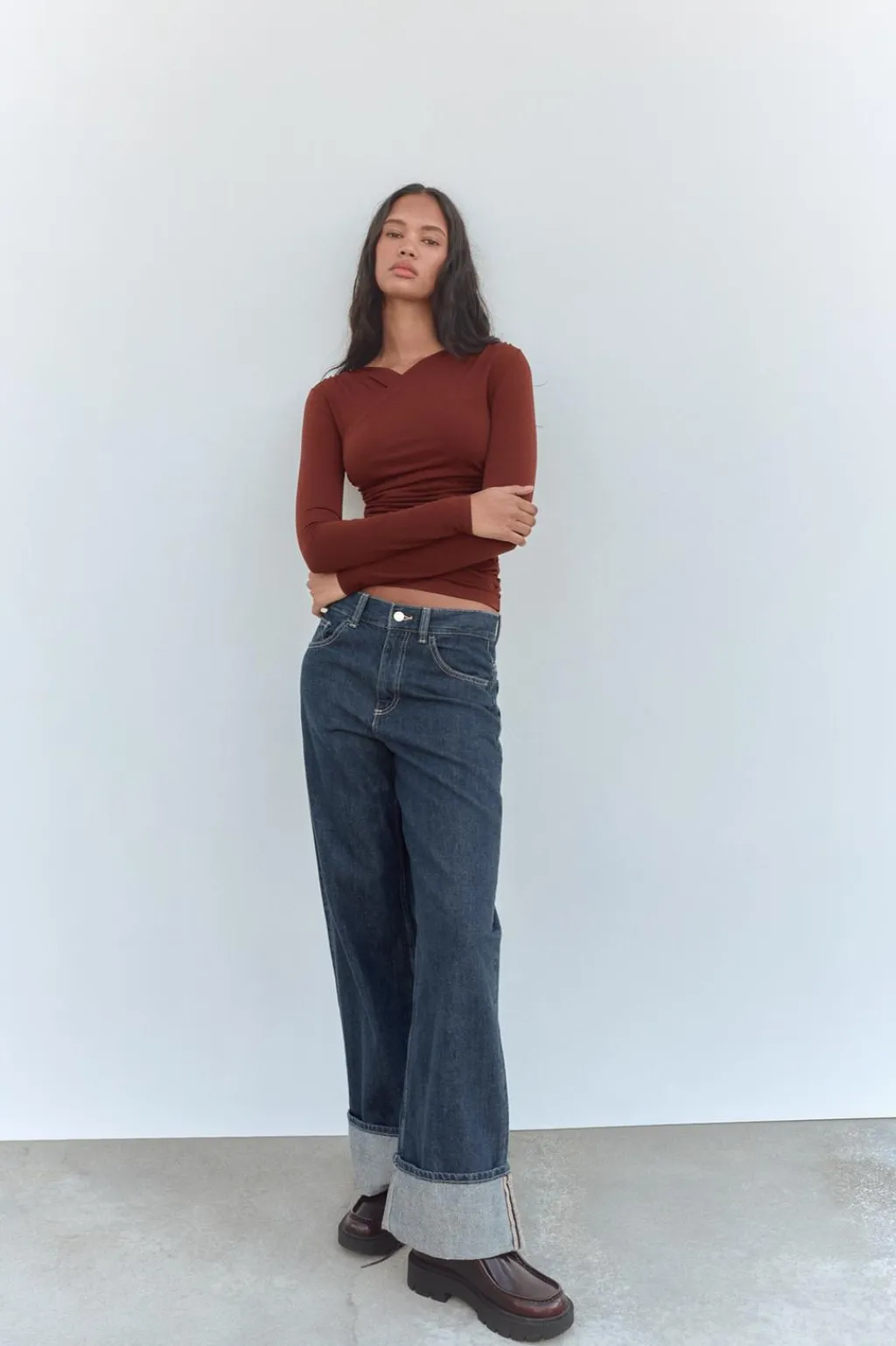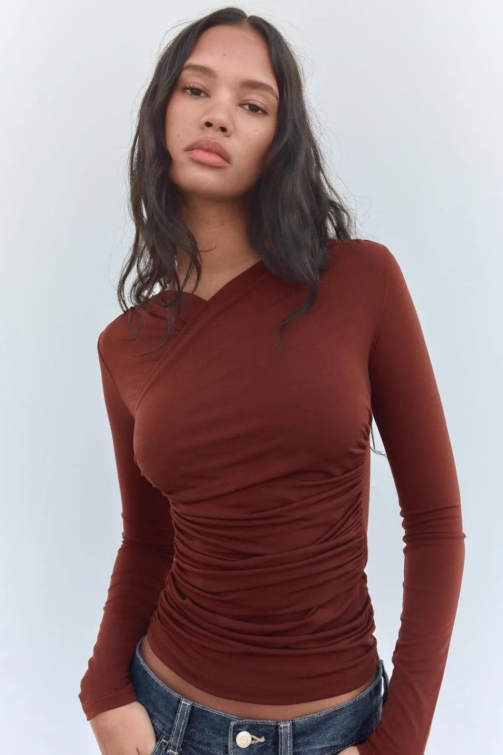 Camiseta de escote pico cruzado y manga larga. Detalle de tejido drapeado. Bajo asimétrico.
