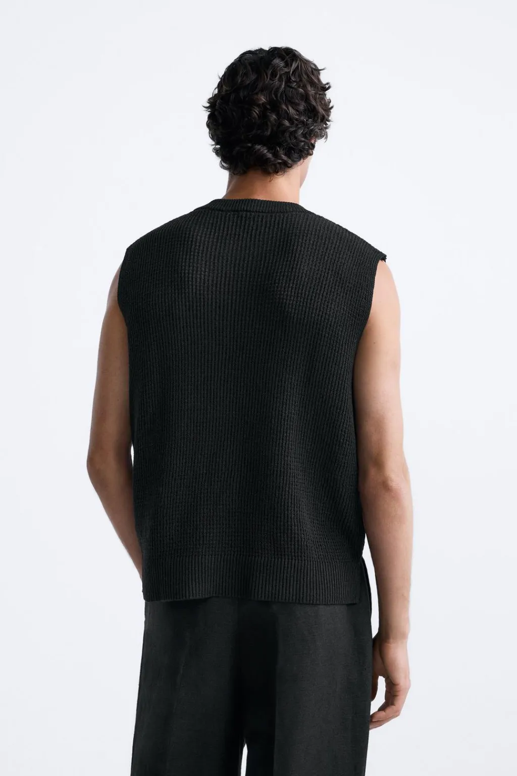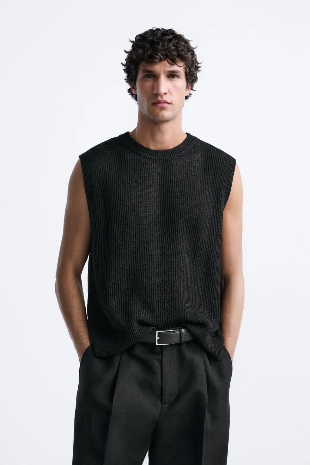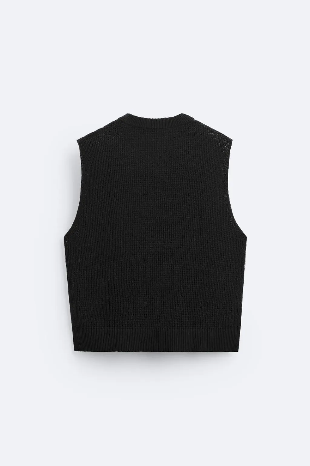 Camiseta de punto tejido con estructura abierta. Cuello redondo y manga sisa. Acabados en rib.