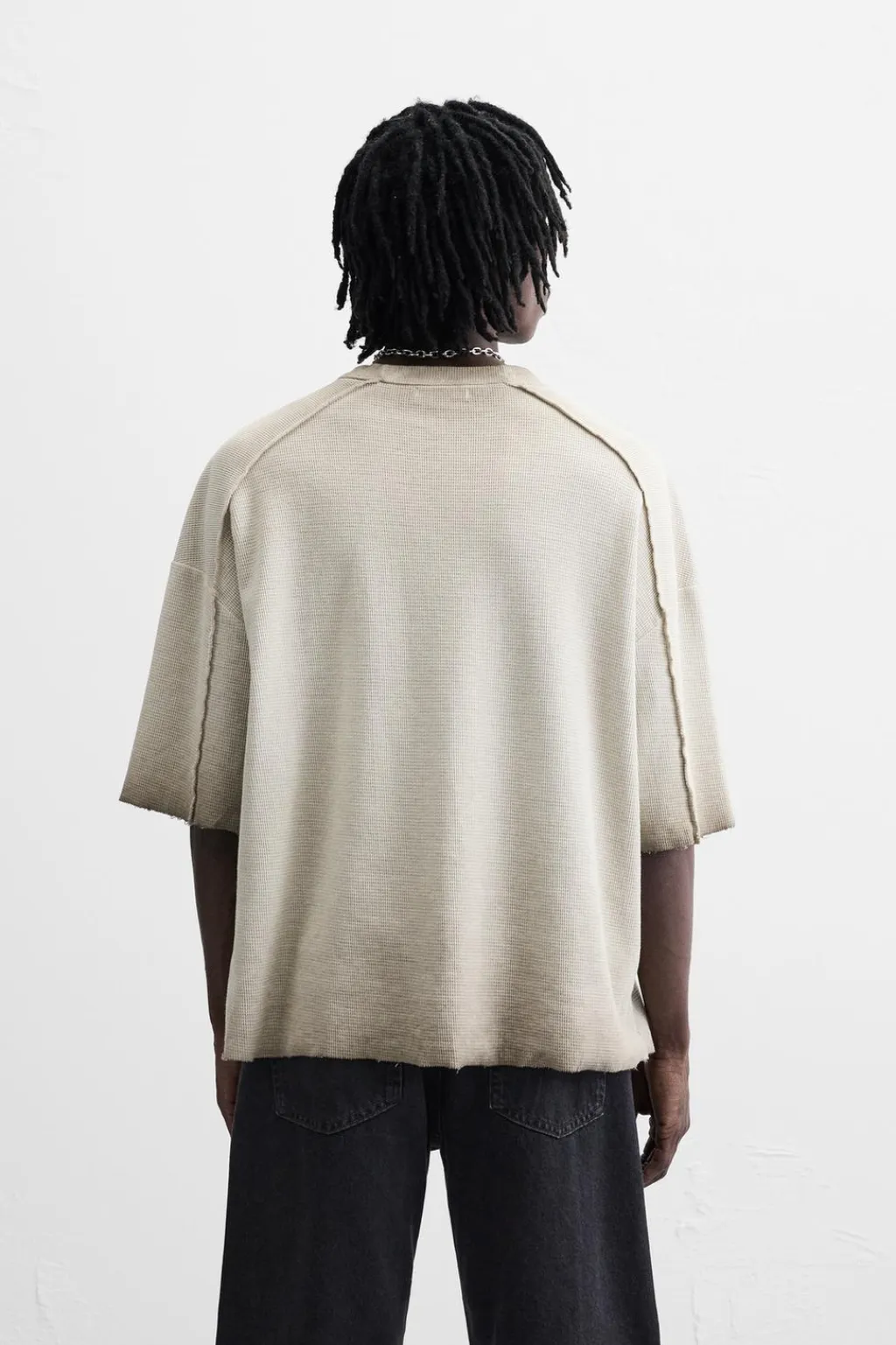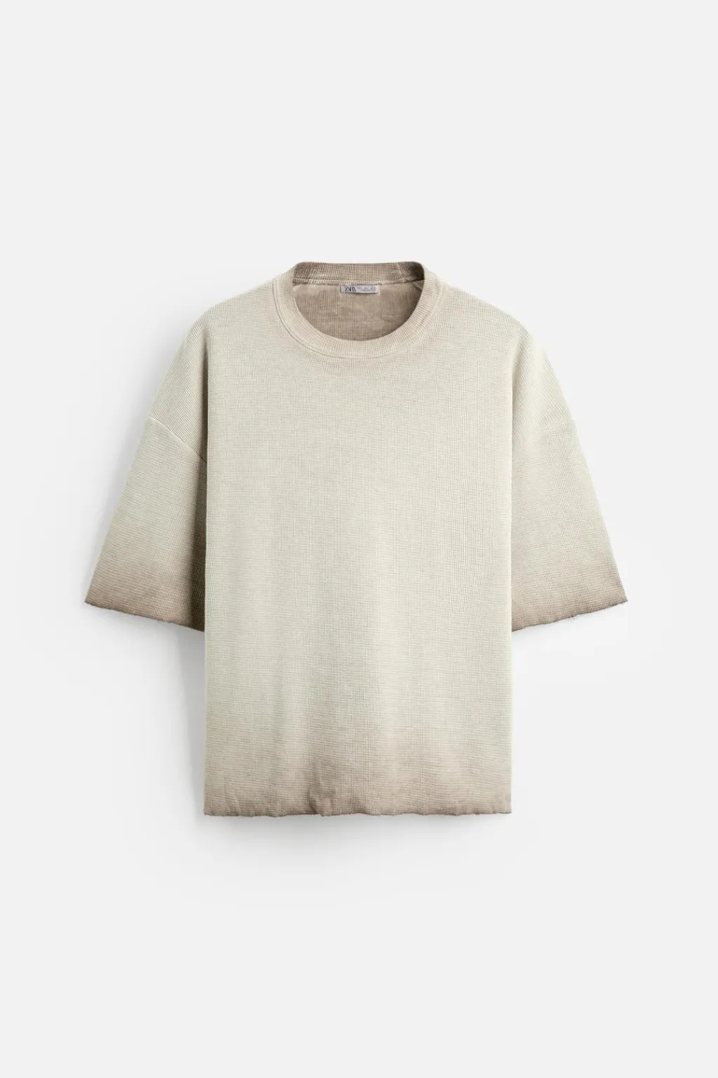 Camiseta de punto tejida en hilatura de algodón. Cuello redondo y manga corta. Estampación efecto spray irregular en toda la prenda.