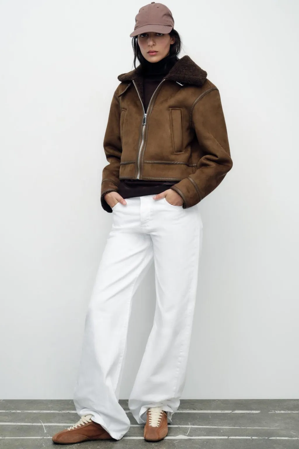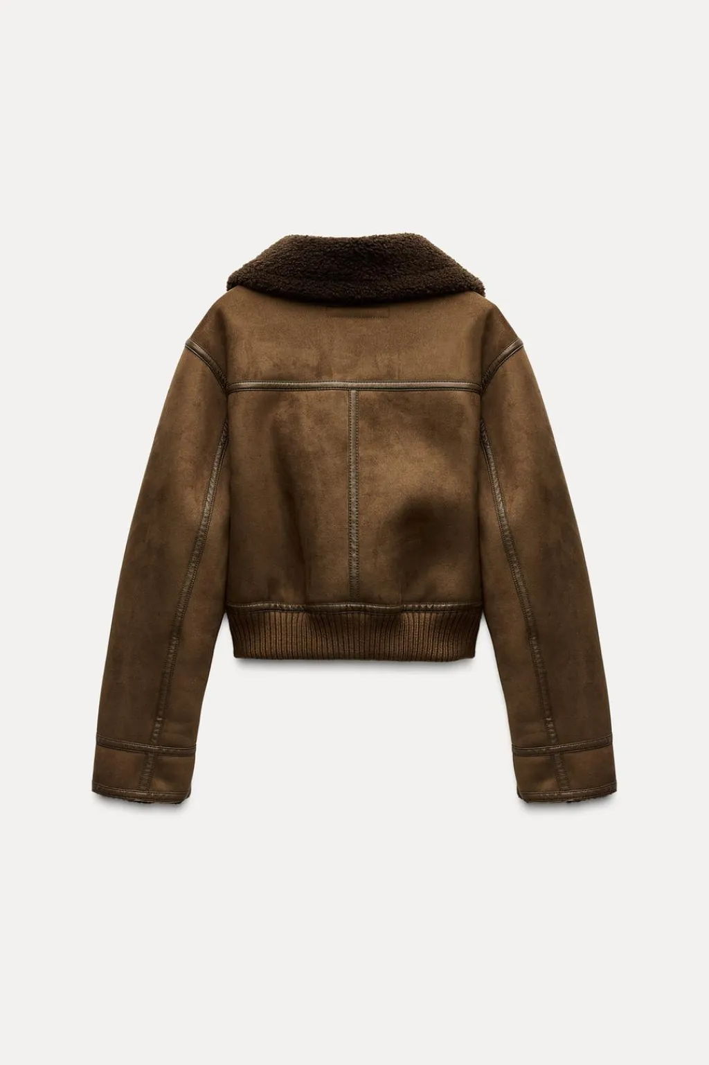Cazadora de cuello solapa con trabilla y manga larga. Bolsillos delanteros de vivo. Detalle de tejido interior combinado en borreguillo y vivos acabados en efecto piel. Cierre frontal con cremallera.