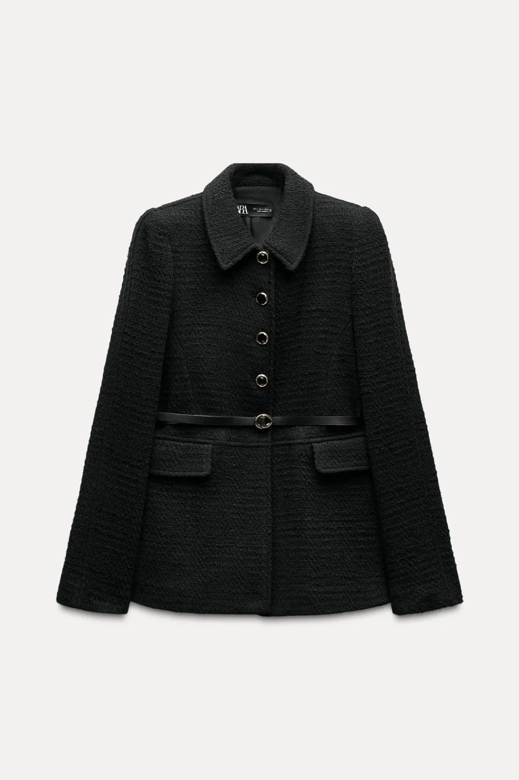 Cazadora de cuello solapa y manga larga con hombreras. Falsos bolsillos delanteros con solapa. Cierre frontal con botones y cinturón.