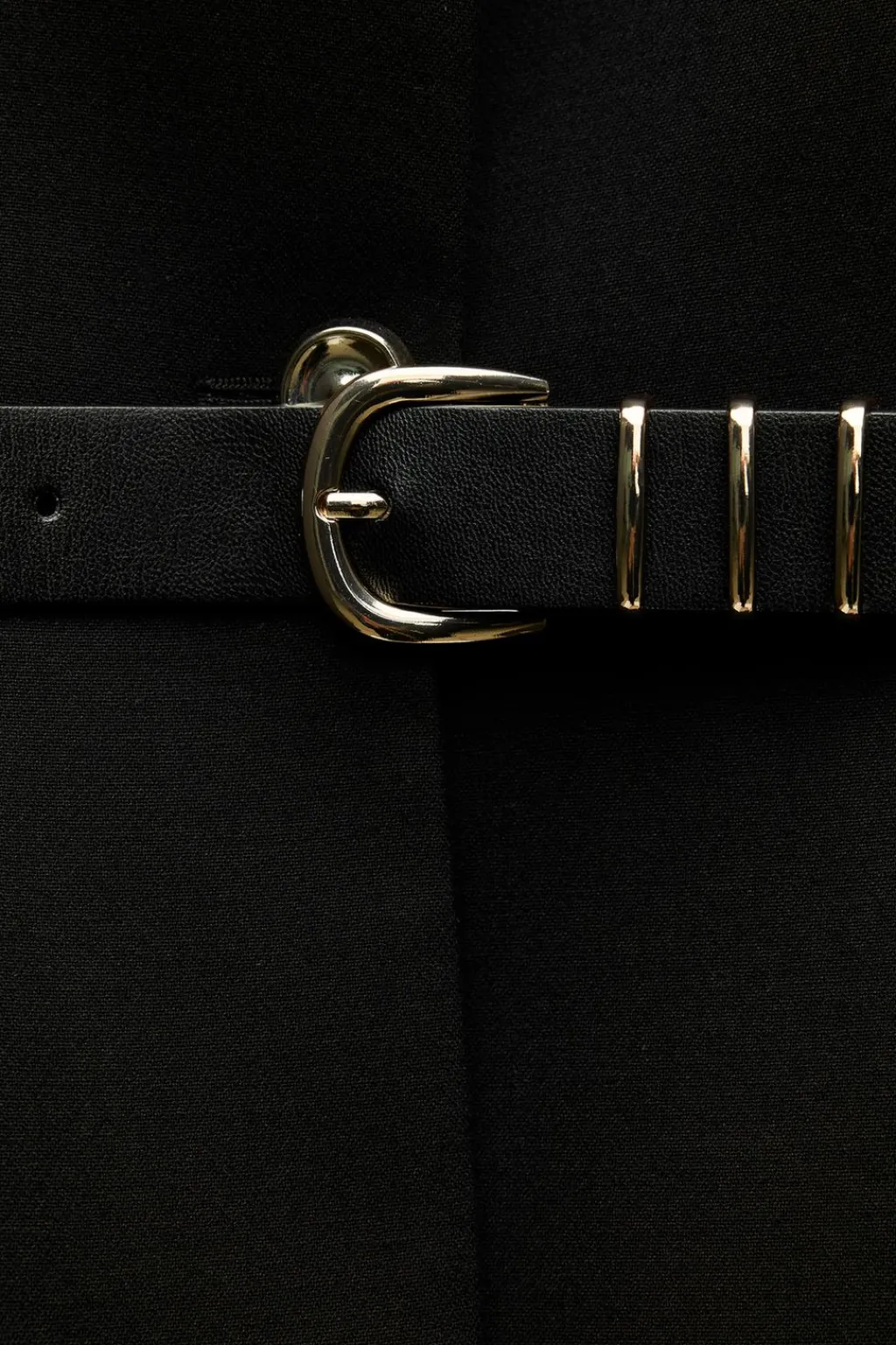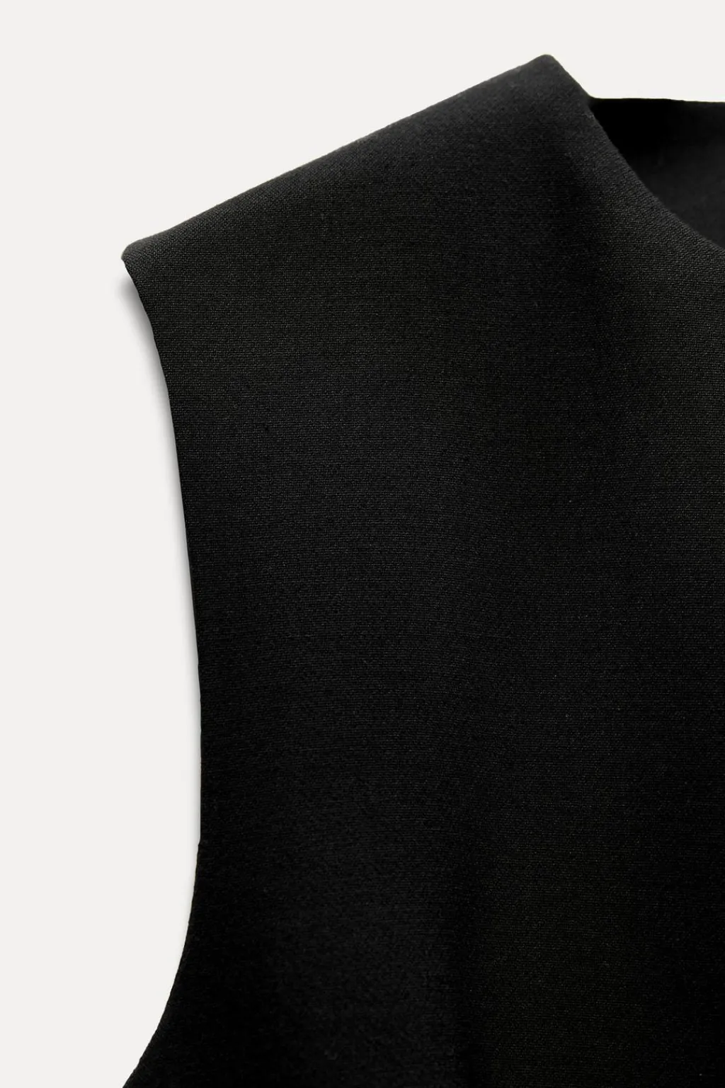Chaleco de cuello redondo y manga sisa. Cierre frontal con botones dorados y cinturón.