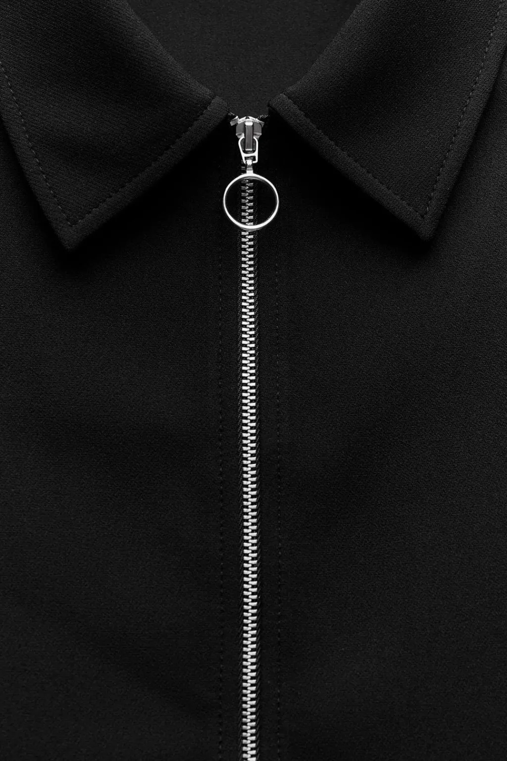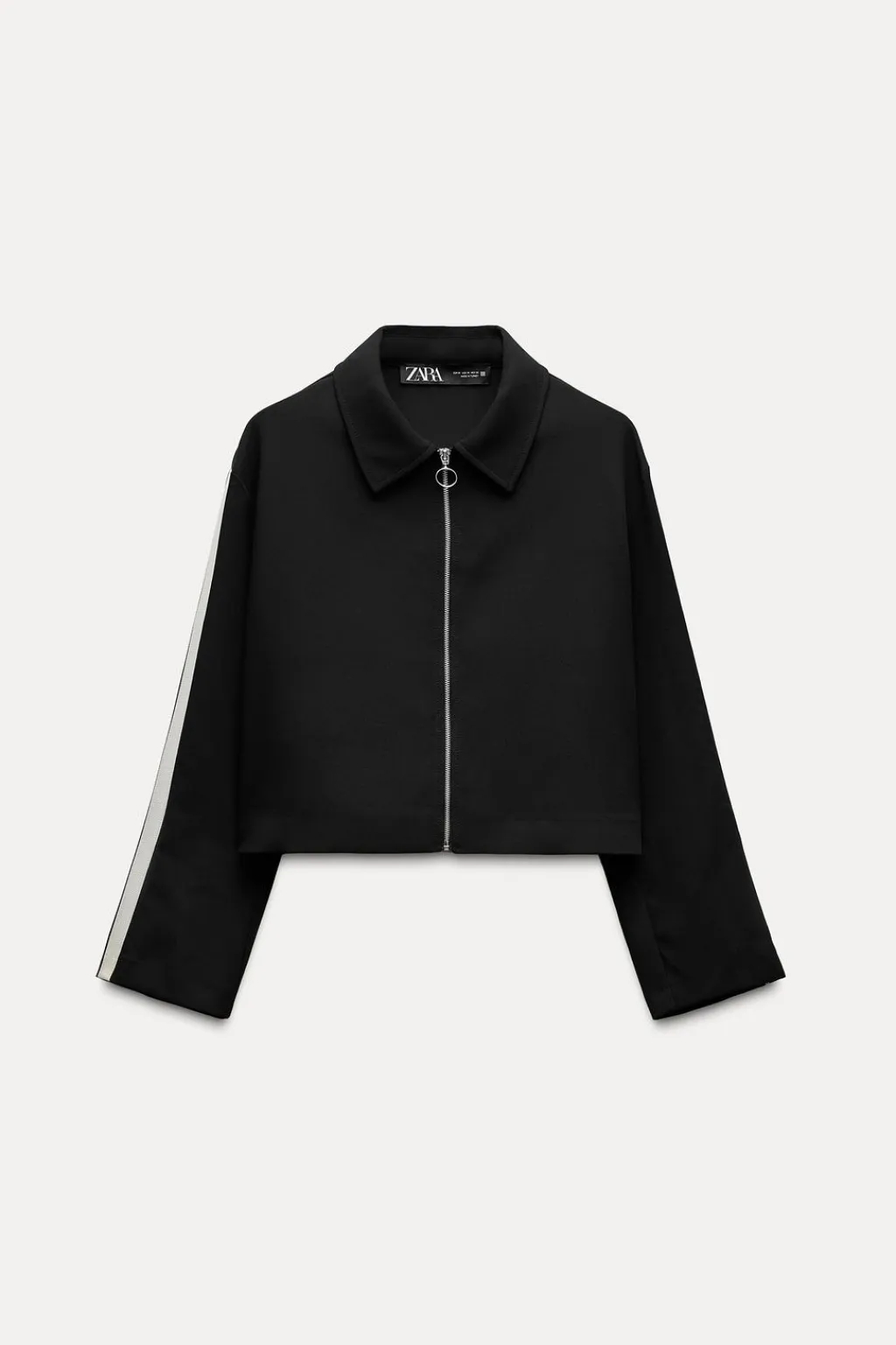 Chaqueta de cuello solapa y manga larga. Detalle de bandas combinadas a contraste. Cierre frontal con cremallera metálica.
