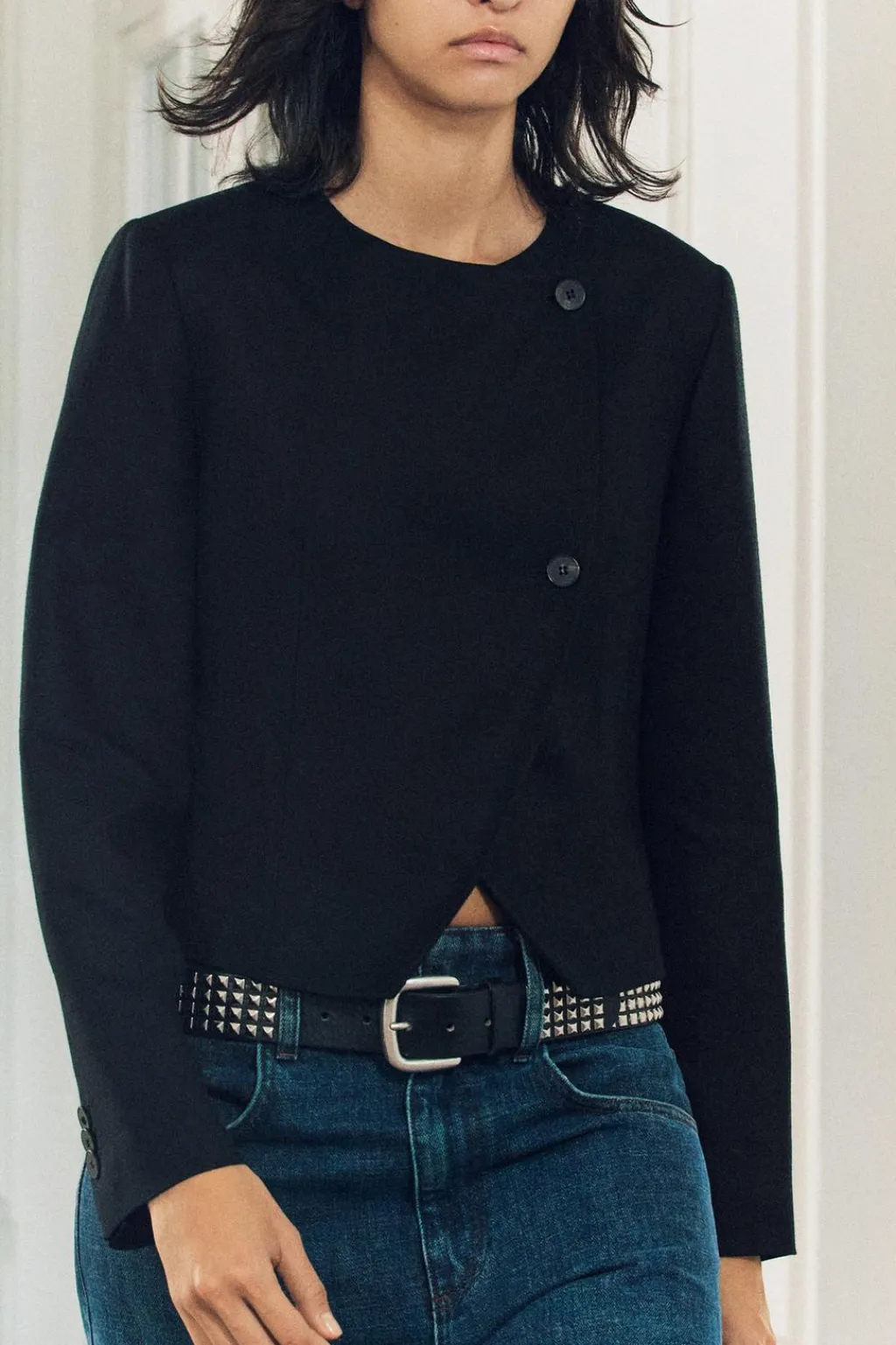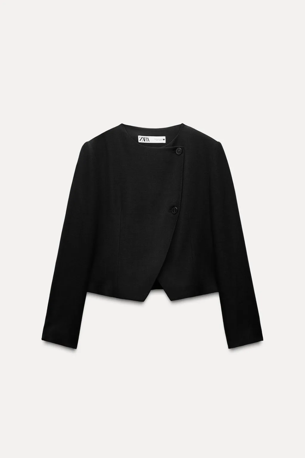 Chaqueta corta de cuello redondo y manga larga con hombreras. Forro interior combinado a contraste. Cierre frontal cruzado con botones.