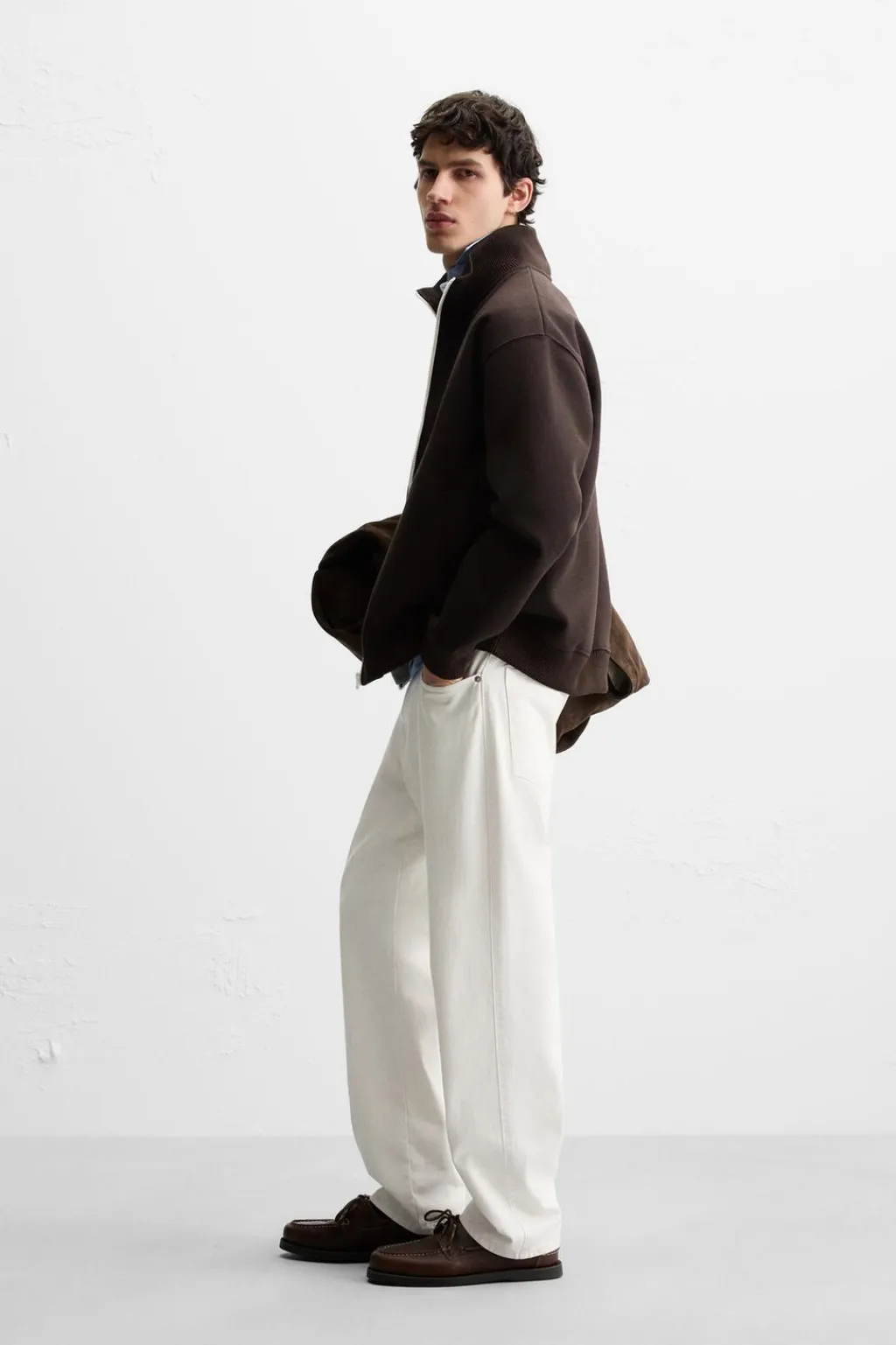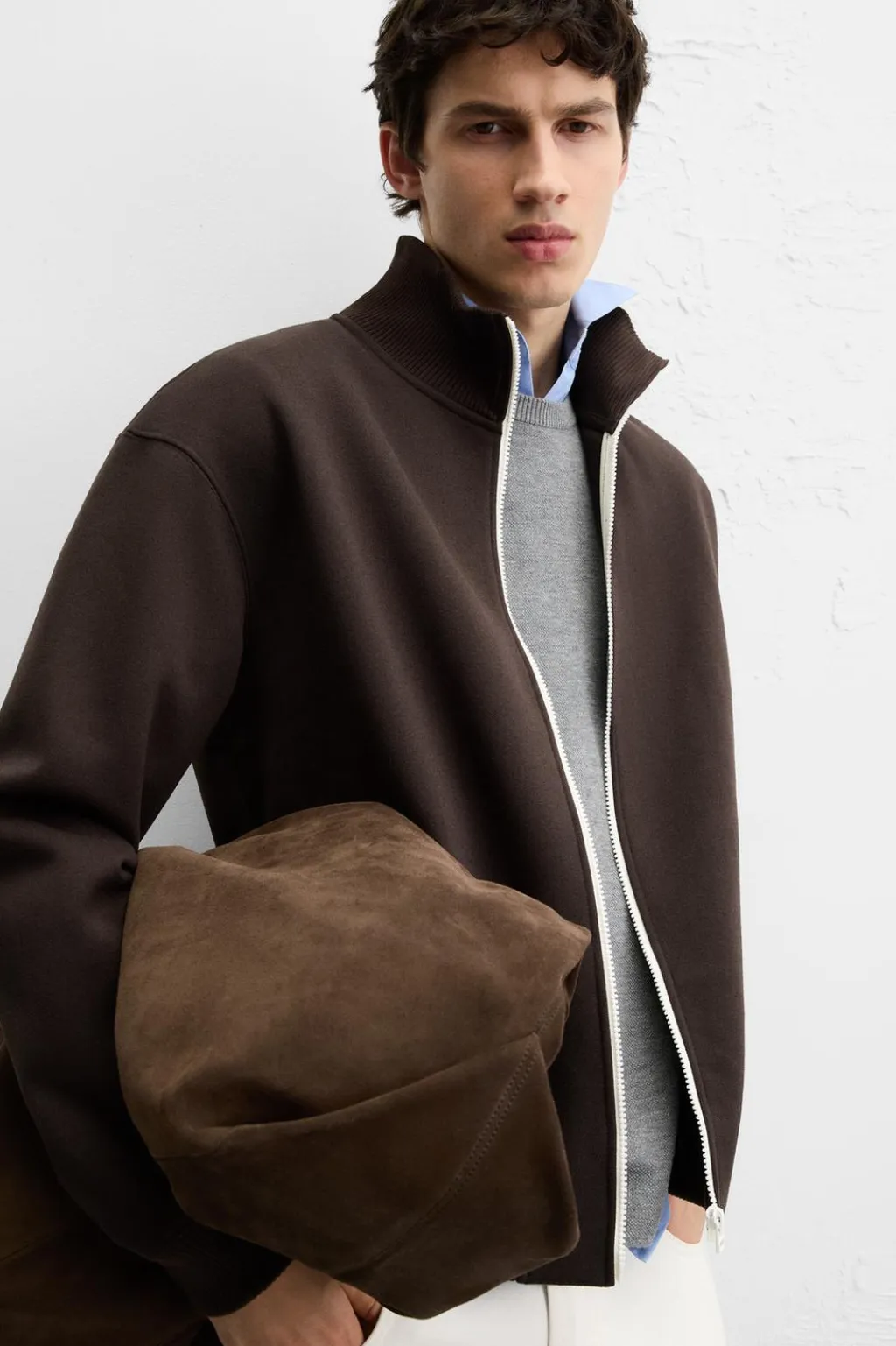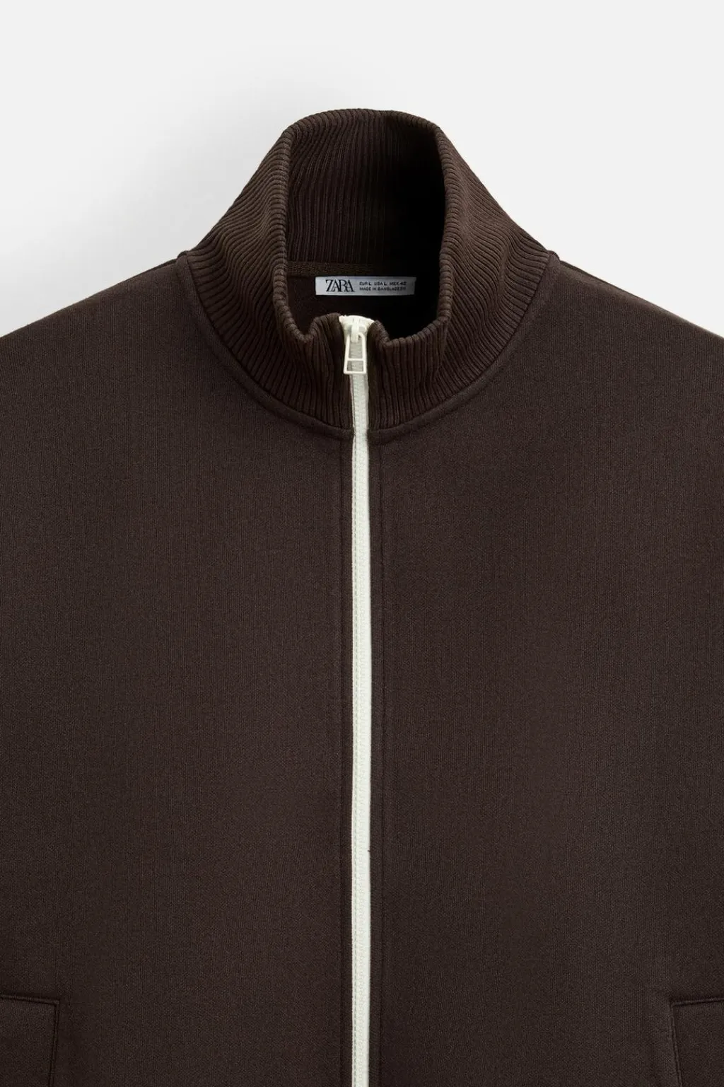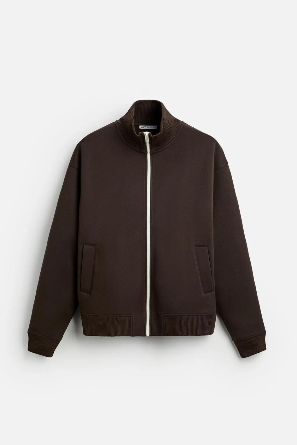 Chaqueta regular fit confeccionada en tejido compacto. Cuello subido y manga larga. Bolsillos de vivo en cadera. Cierre frontal con crelallera combinada a contraste..