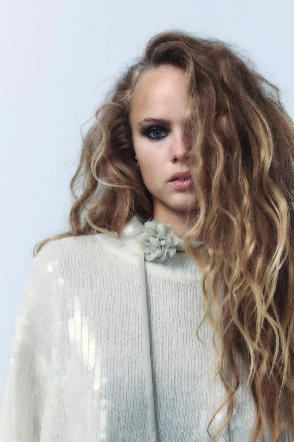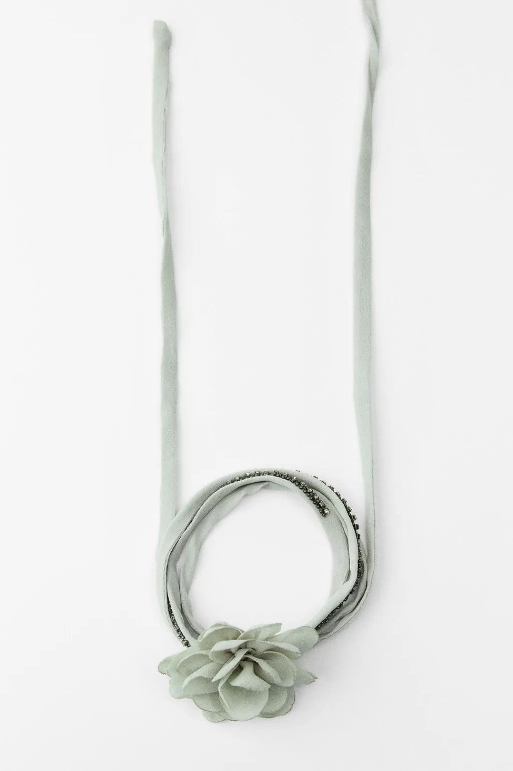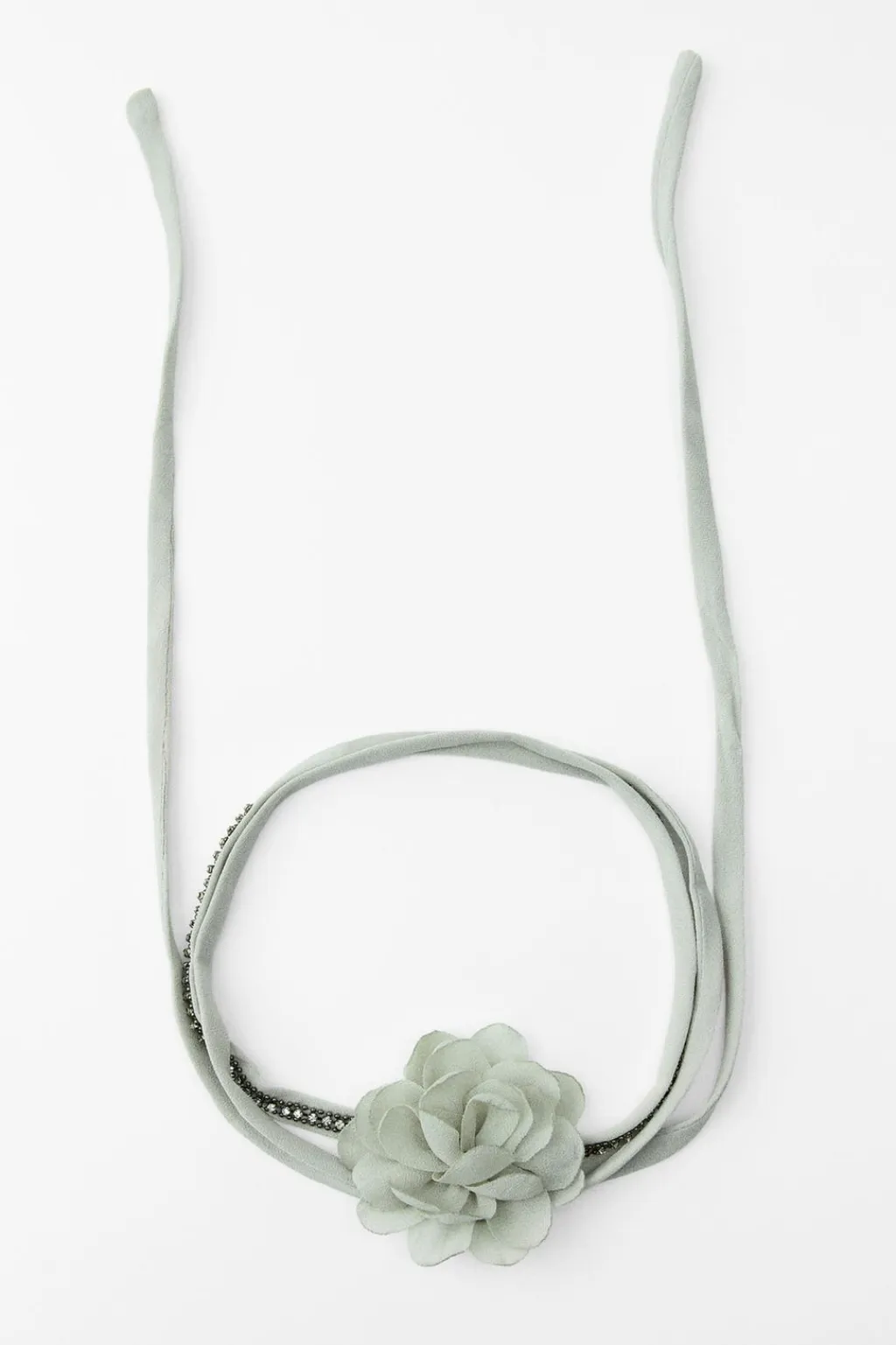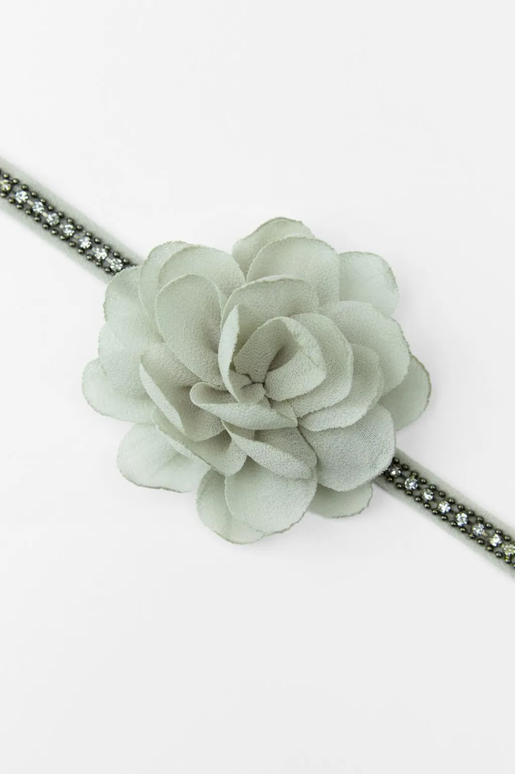 Collar tipo choker confeccionado en tejido con aplicación de joyas y flor en relieve combinada a tono. Cierre con lazada.