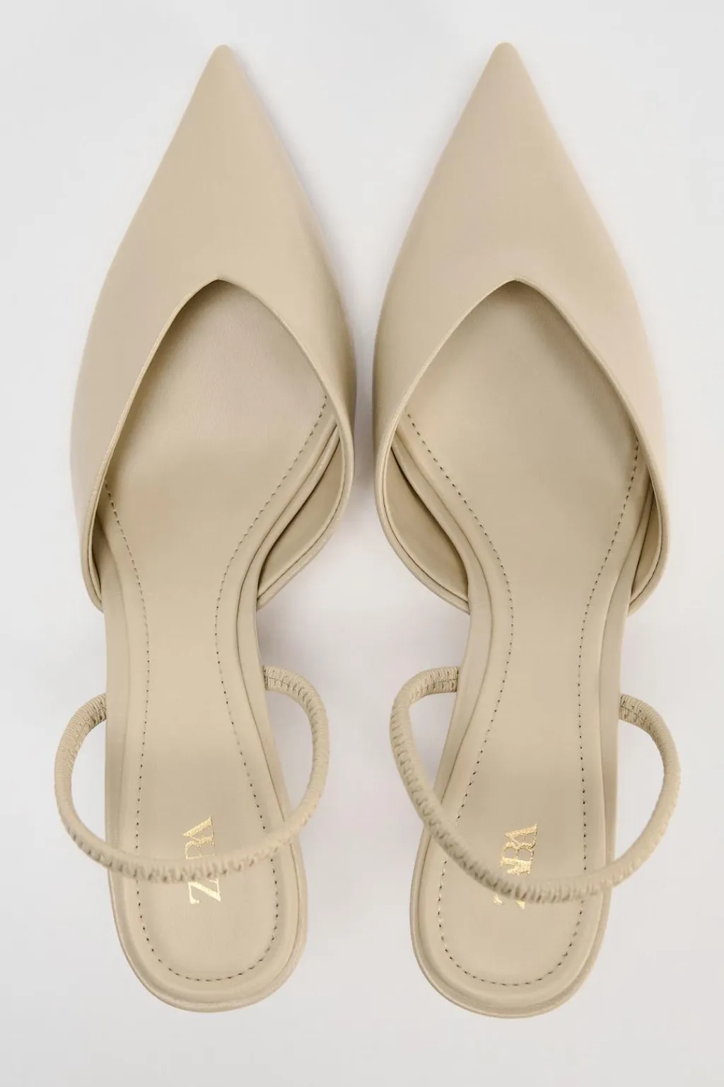 Zapato destalonado con tacón fino. Acabado en punta. Tira trasera elástica.