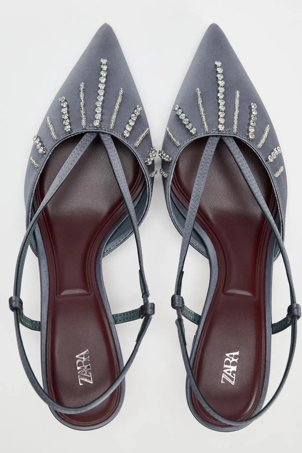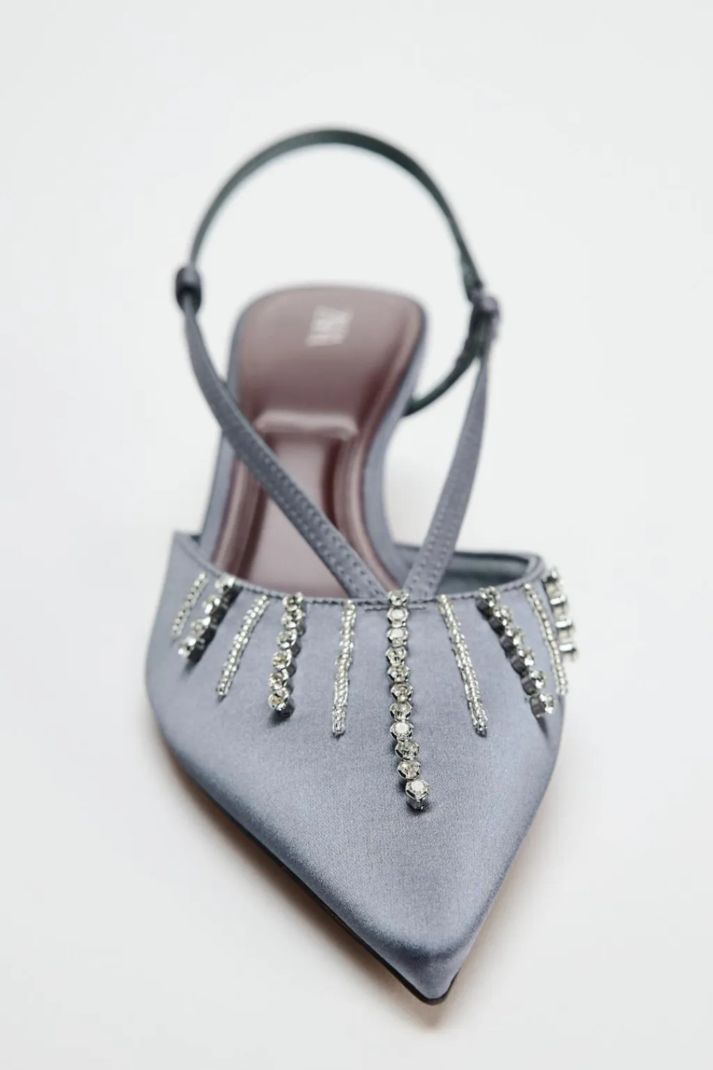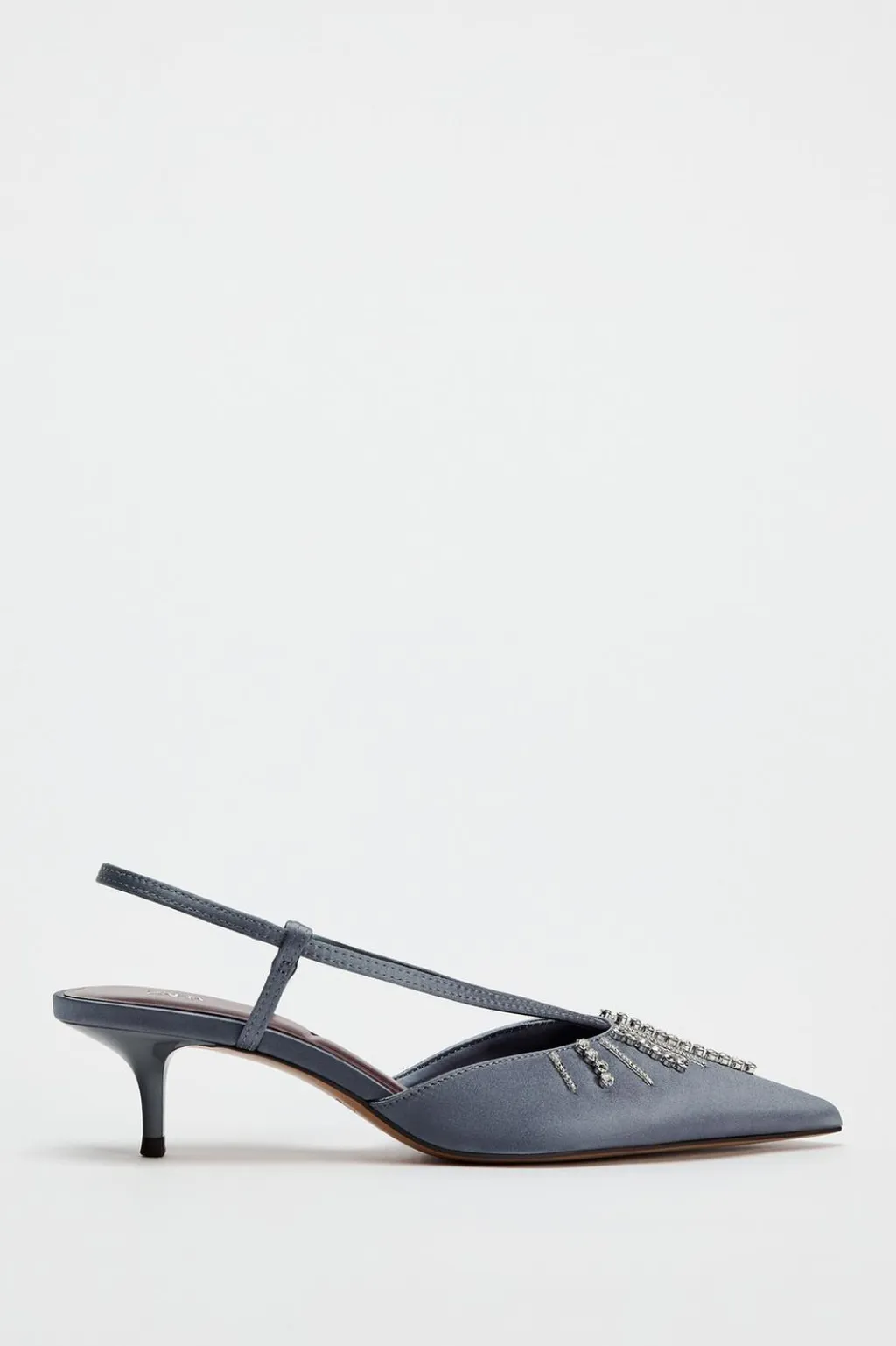 Zapato tipo destalonado tacón. Detalle de pedrería en la parte delantera. Tira trasera ajustable. Acabado en punta.