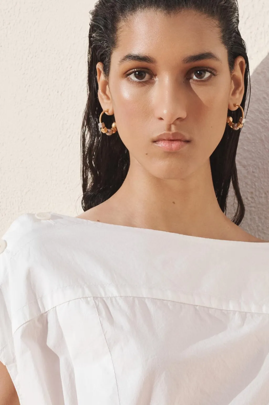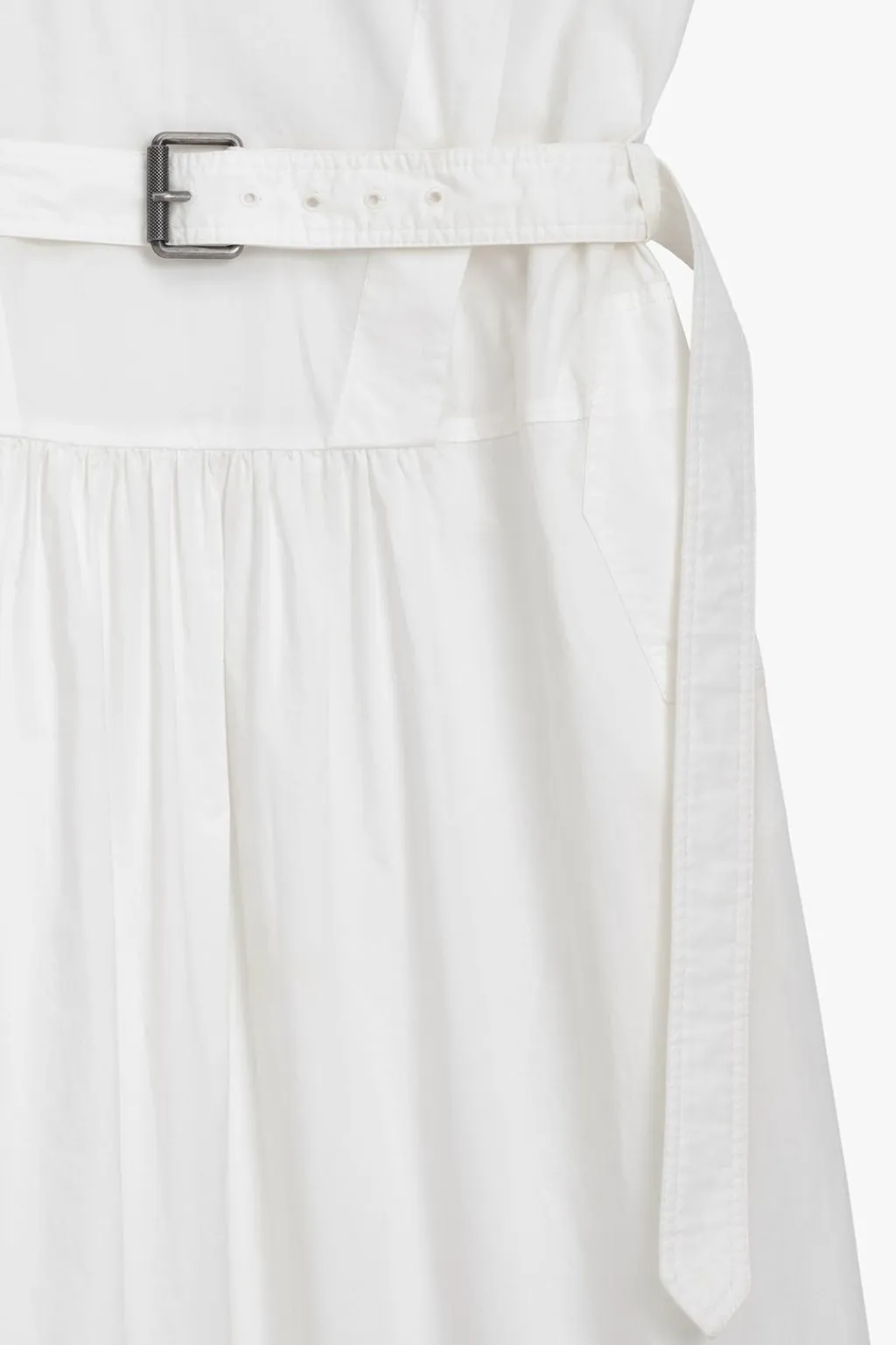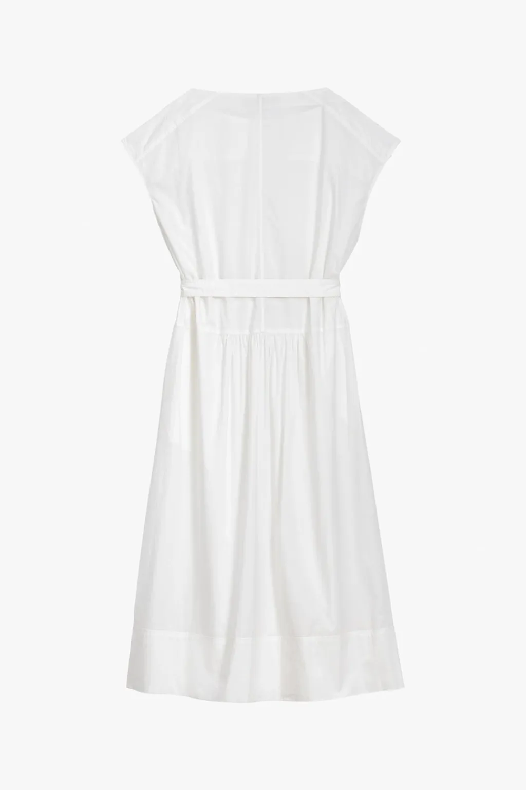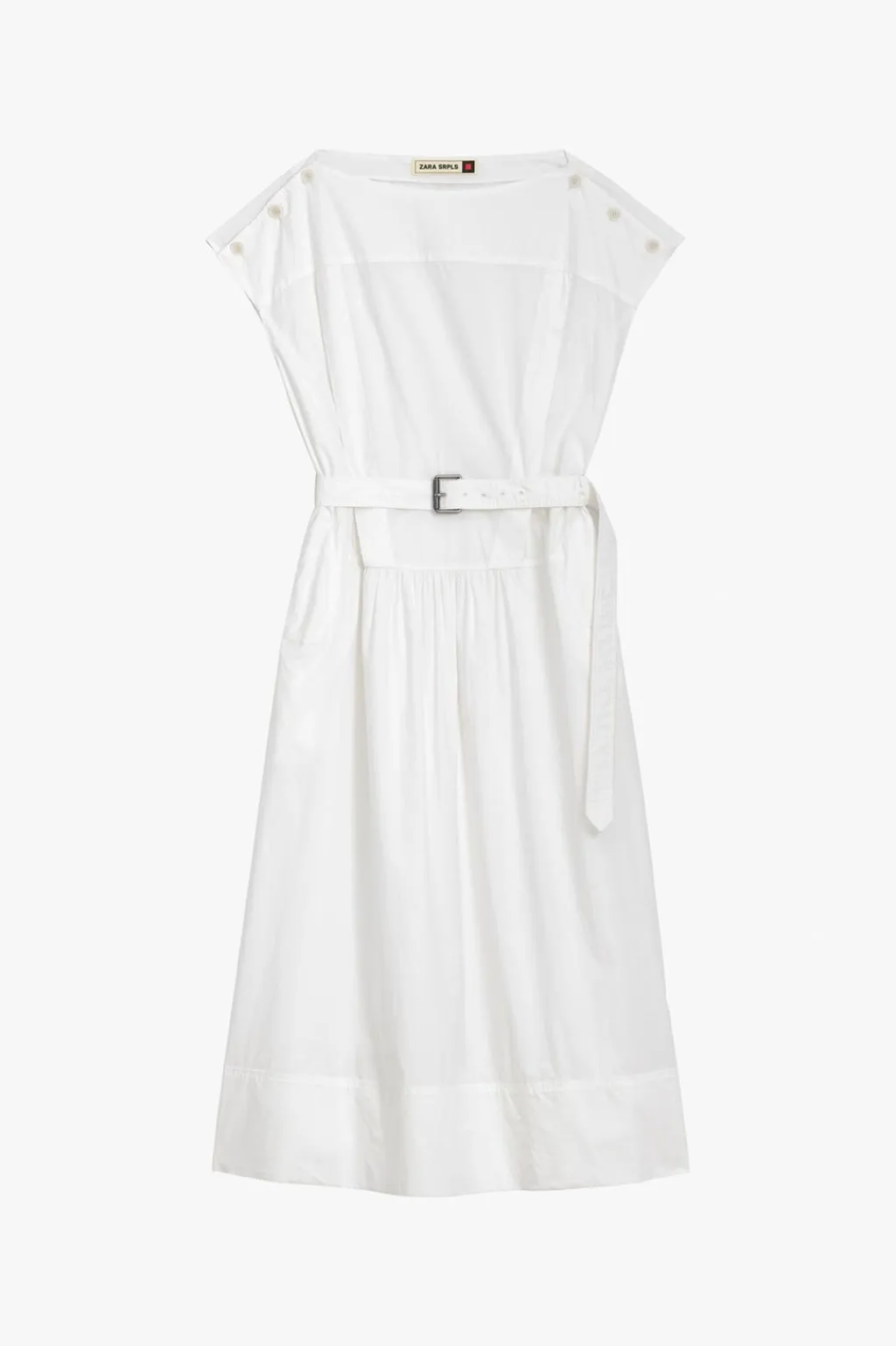 Vestido midi confeccionado en hilatura de algodón 100%. Cuello barco y manga corta con botones en hombros. Bolsillos laterales ocultos en costura. Cinturón en mismo tejido ajustable con hebilla metálica. Detalle de pespuntes marcados combinados a tono. Bajo acabado en volumen.