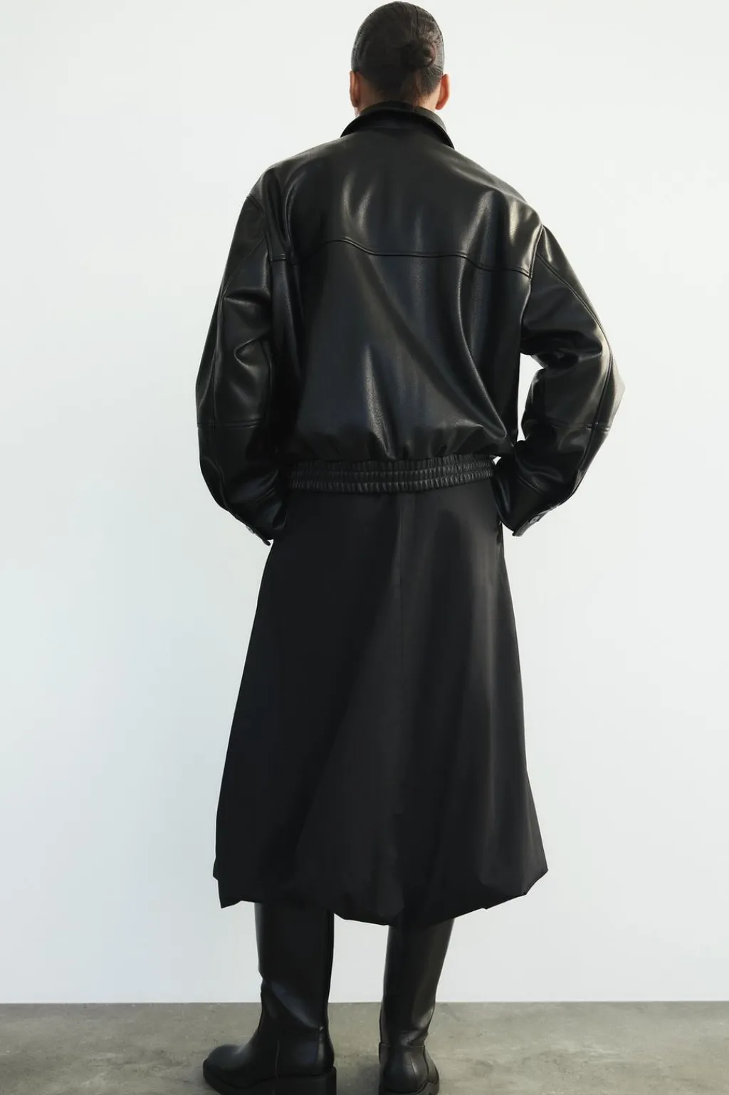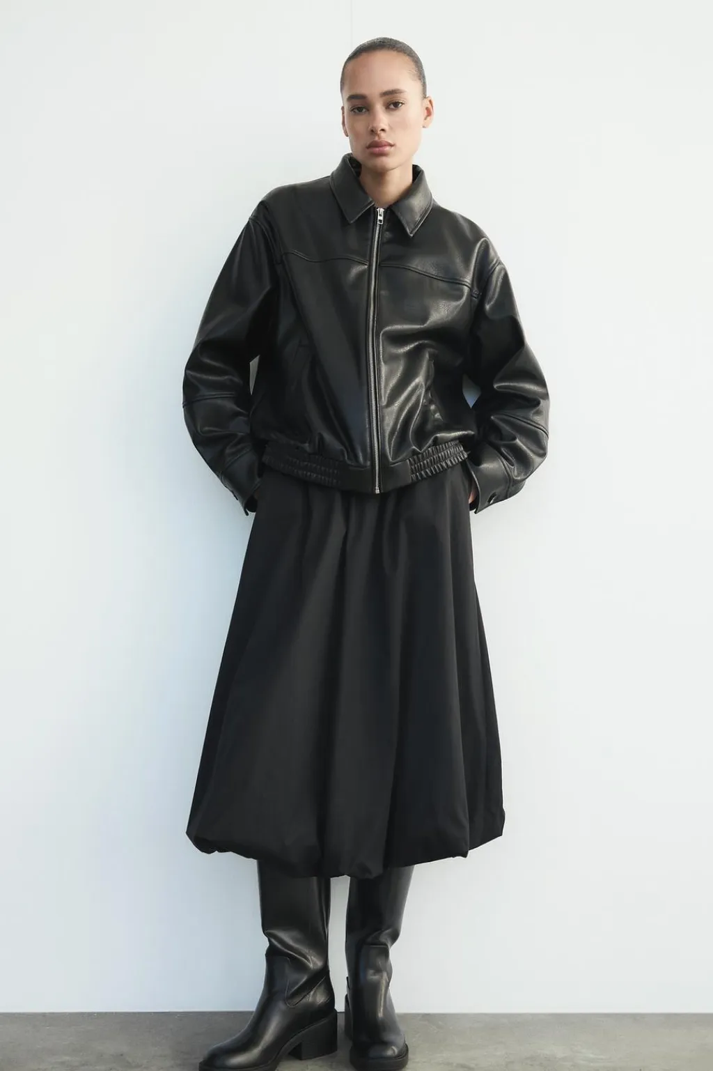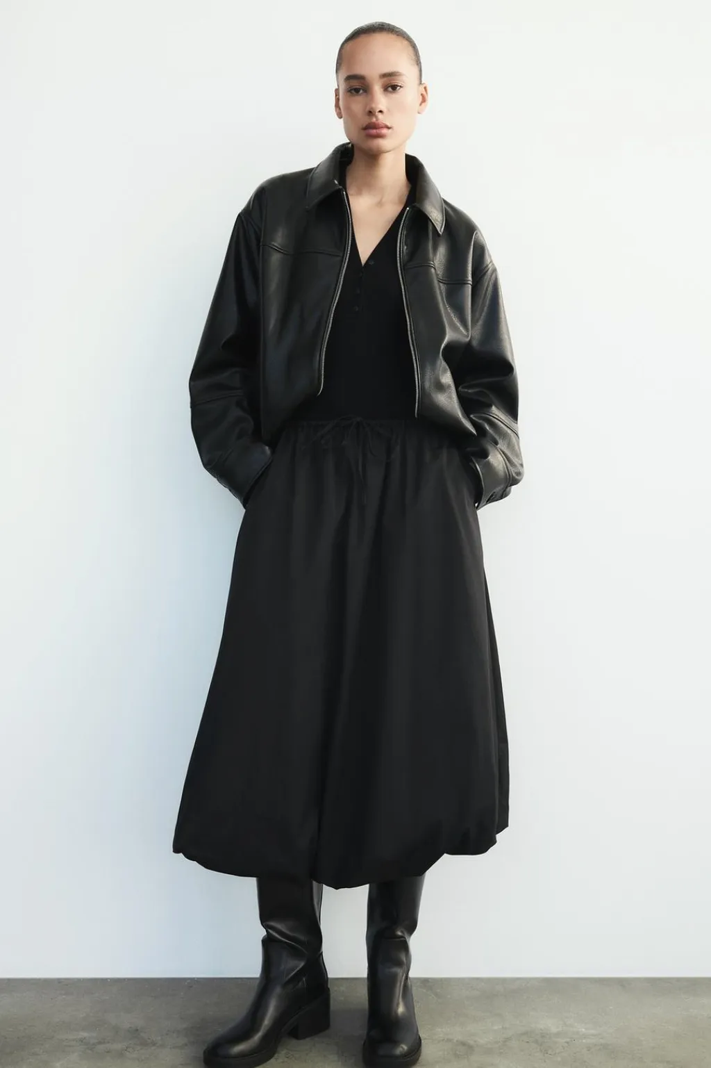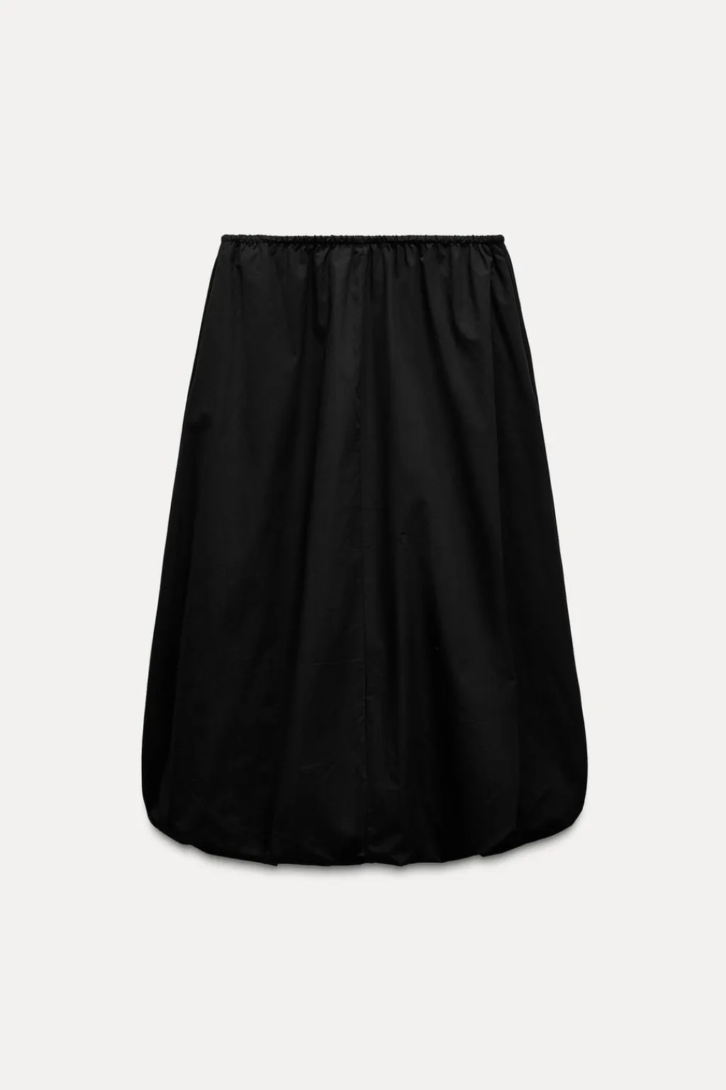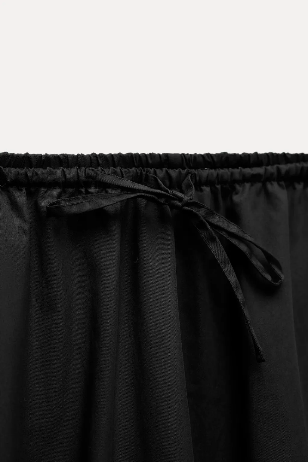 Falda midi de tiro medio con cintura elástica y lazada. Bolsillos laterales ocultos en costura. Forro interior. Bajo acabado globo.