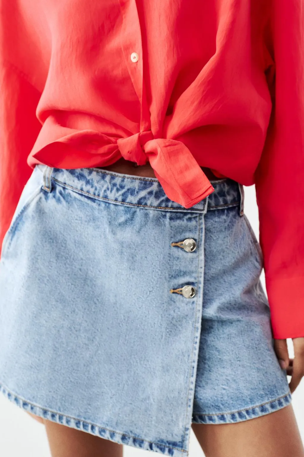Falda pantalón de tiro alto con bolsillos delanteros y bolsillos de plastrón en espalda. Efecto lavado. Cierre frontal cruzado con cremallera oculta y botones metálicos.
