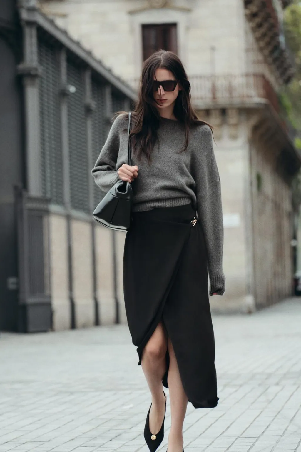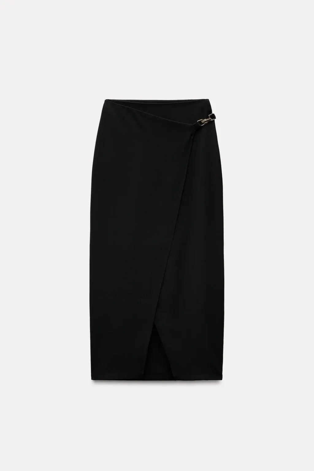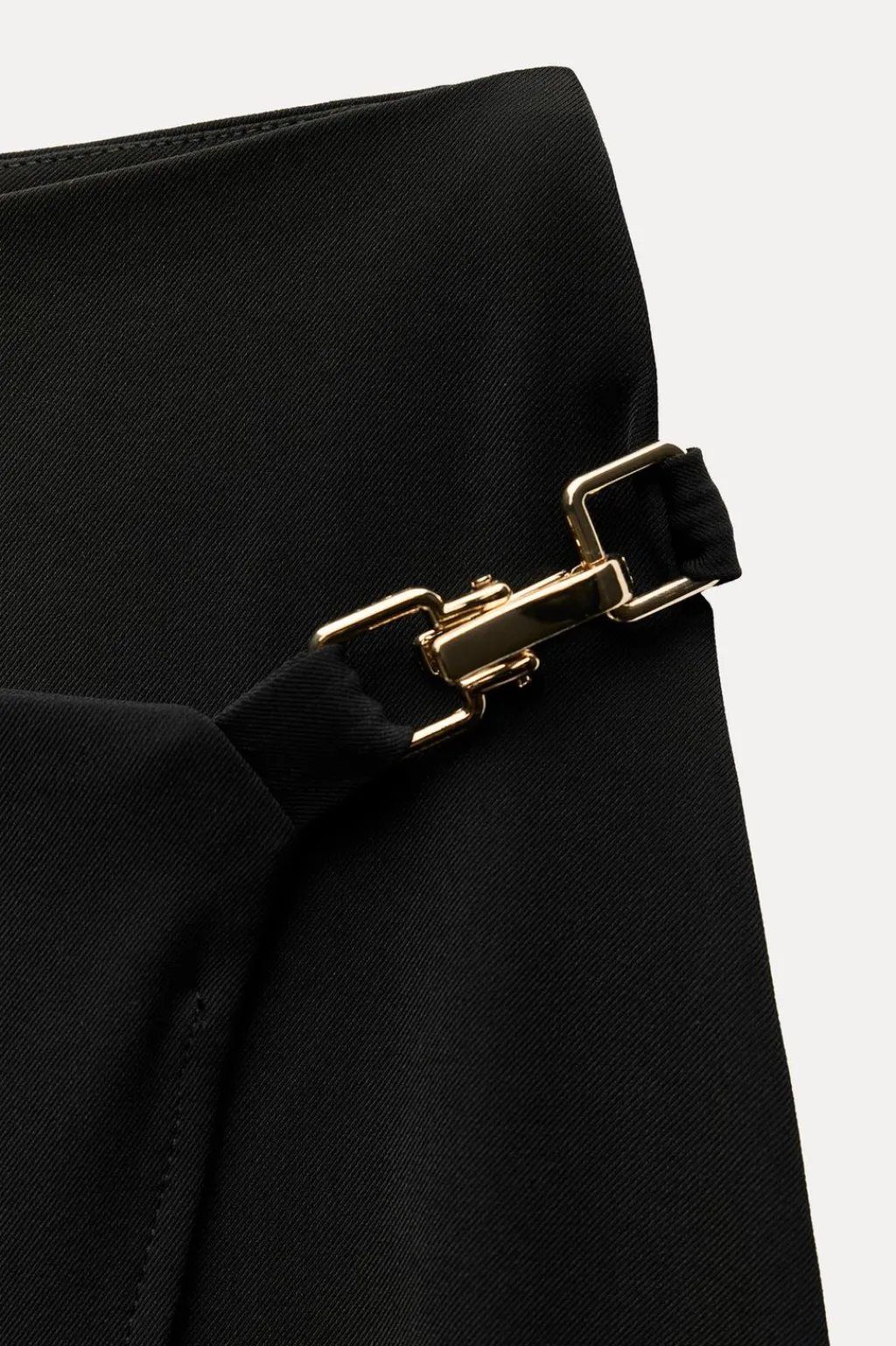 Falda de tiro alto con abertura frontal. Cierre cruzado con botón interior oculto y aplique dorado con clip.