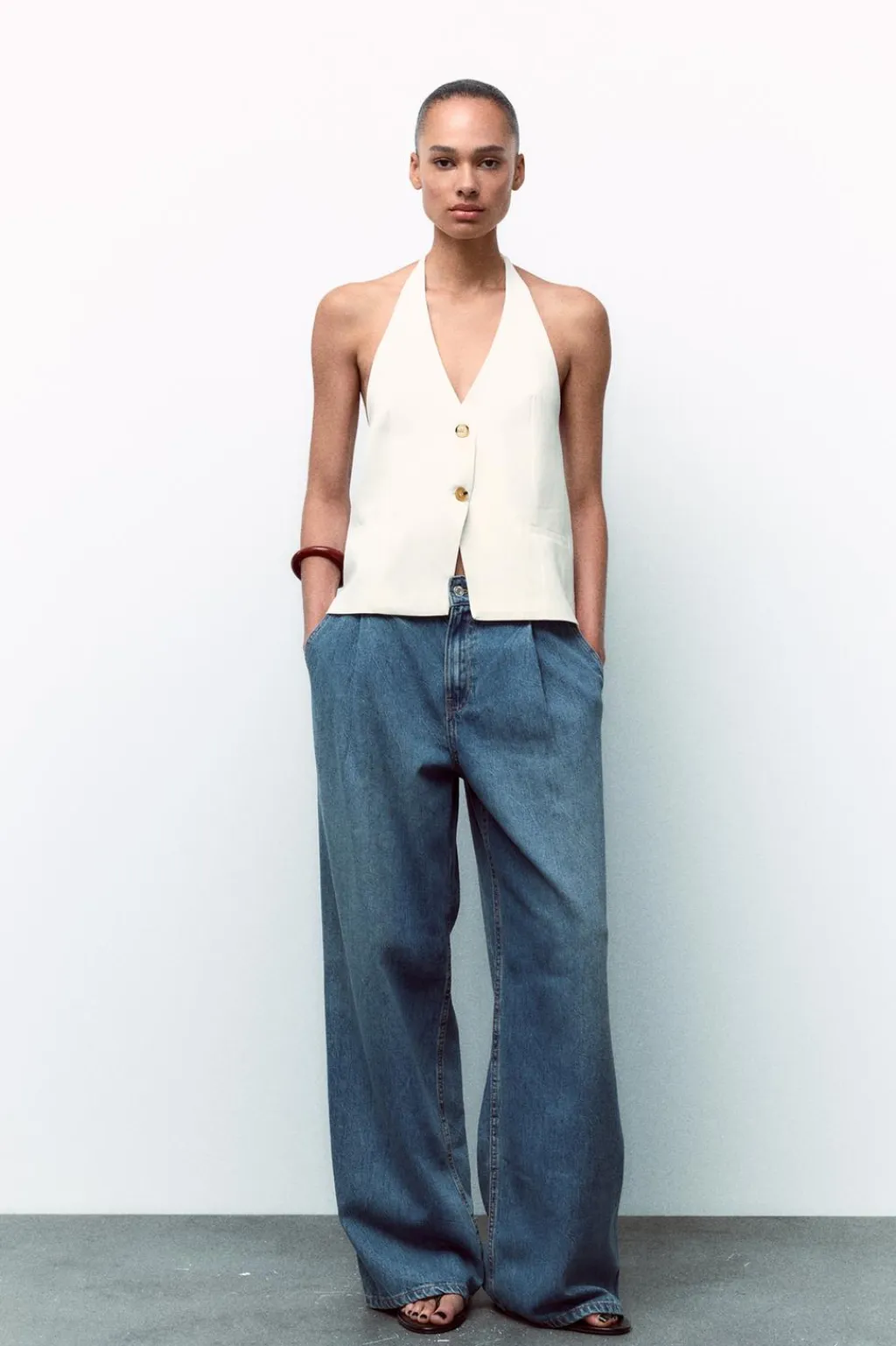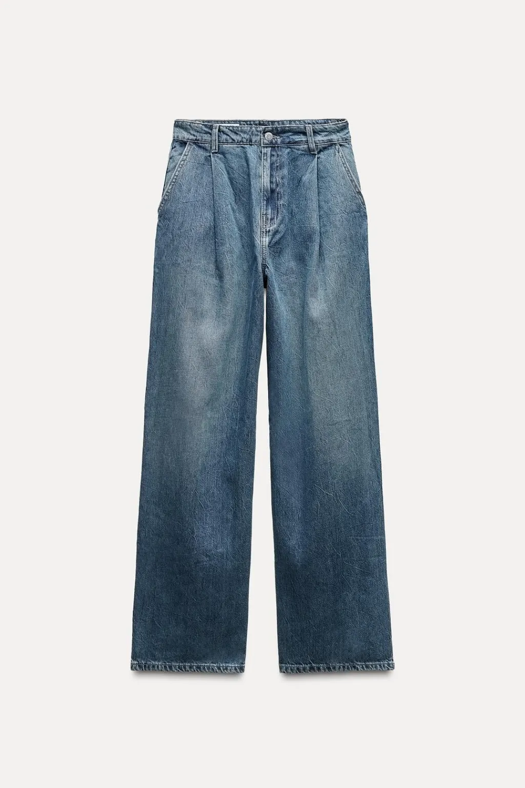 Jeans de tiro alto con trabillas. Bolsillos laterales y de vivo en espalda. Detalle de pinzas en delantero. Cierre frontal con cremallera y botón.