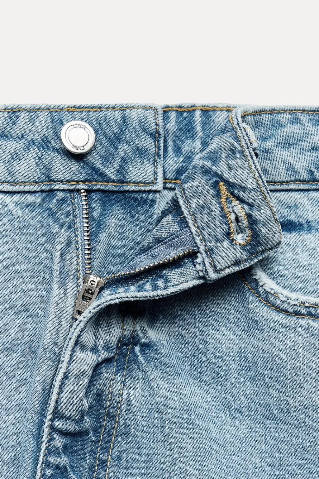 Jeans tobillero de tiro alto con cinco bolsillos. Efecto lavado. Cierre frontal con cremallera y botón.