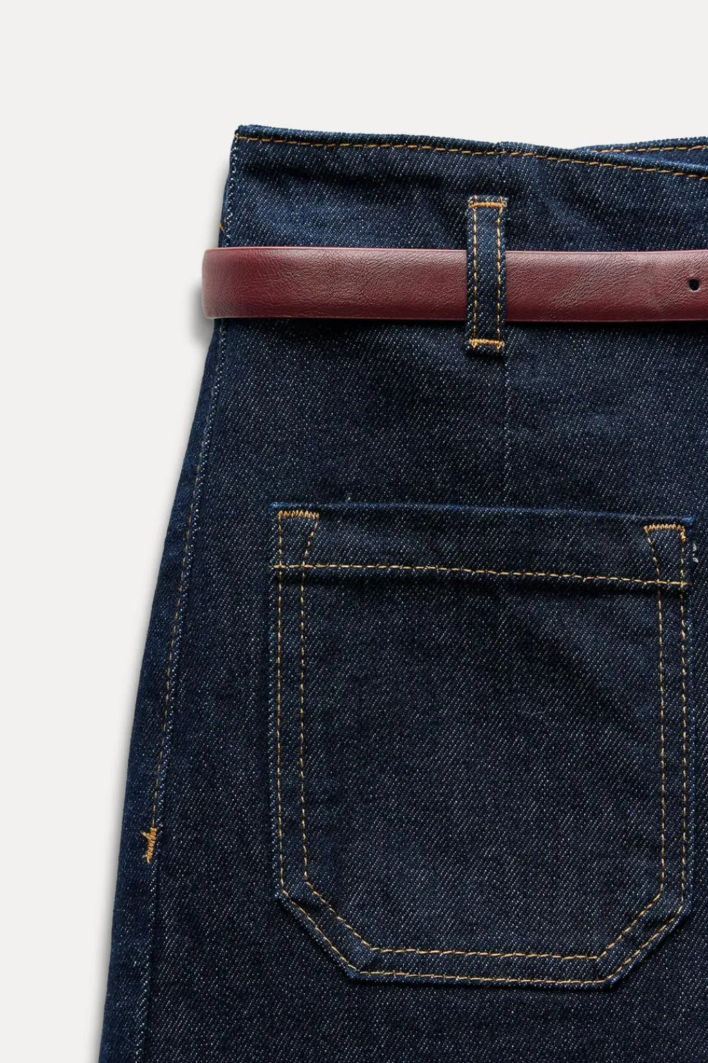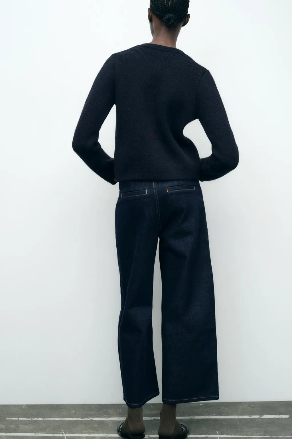 Jeans de tiro alto con bolsillos delanteros de plastrón y falsos bolsillos de vivo en espalda. Pernera ancha y corta. Cierre frontal con cremallera y botón.