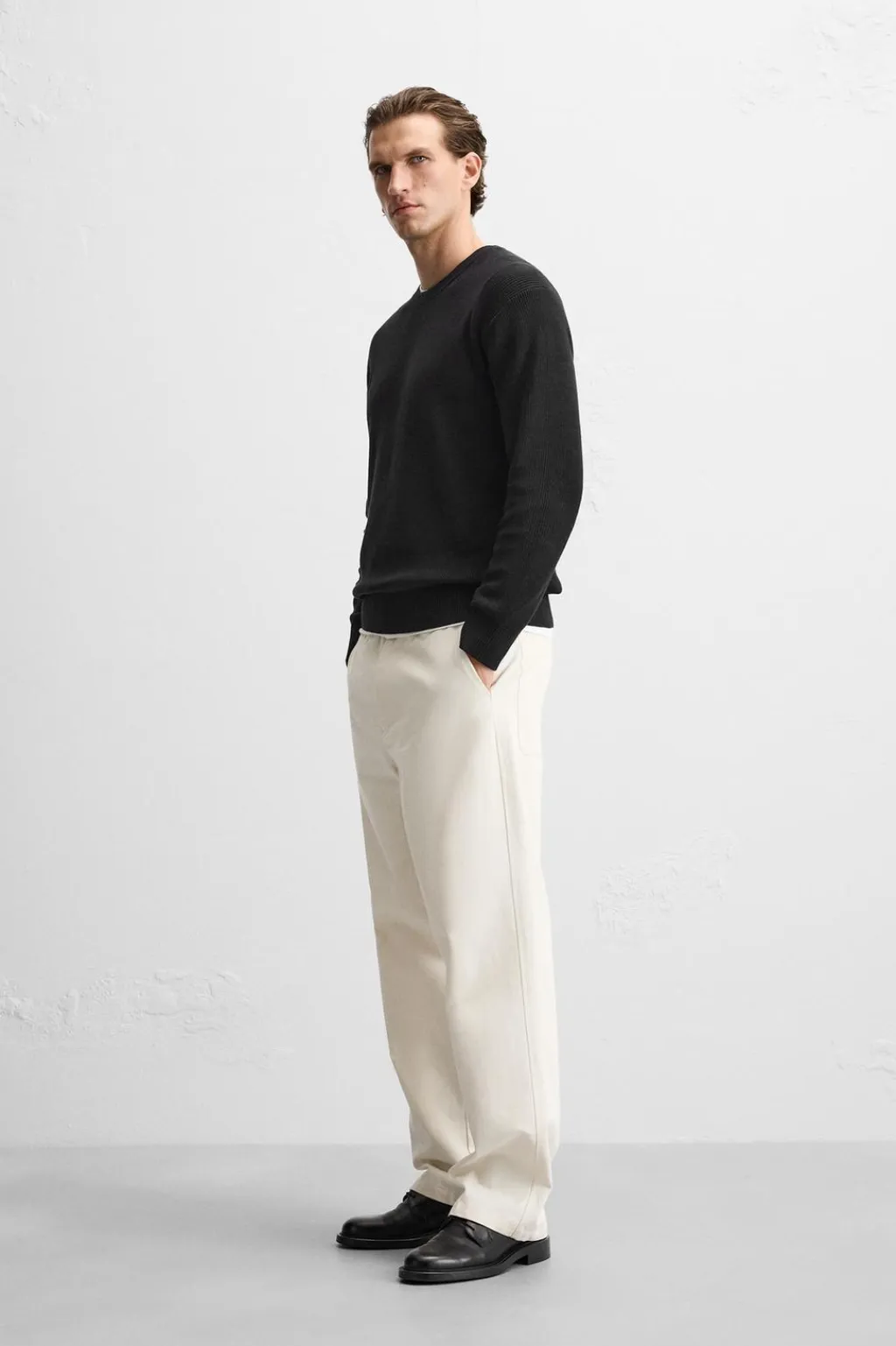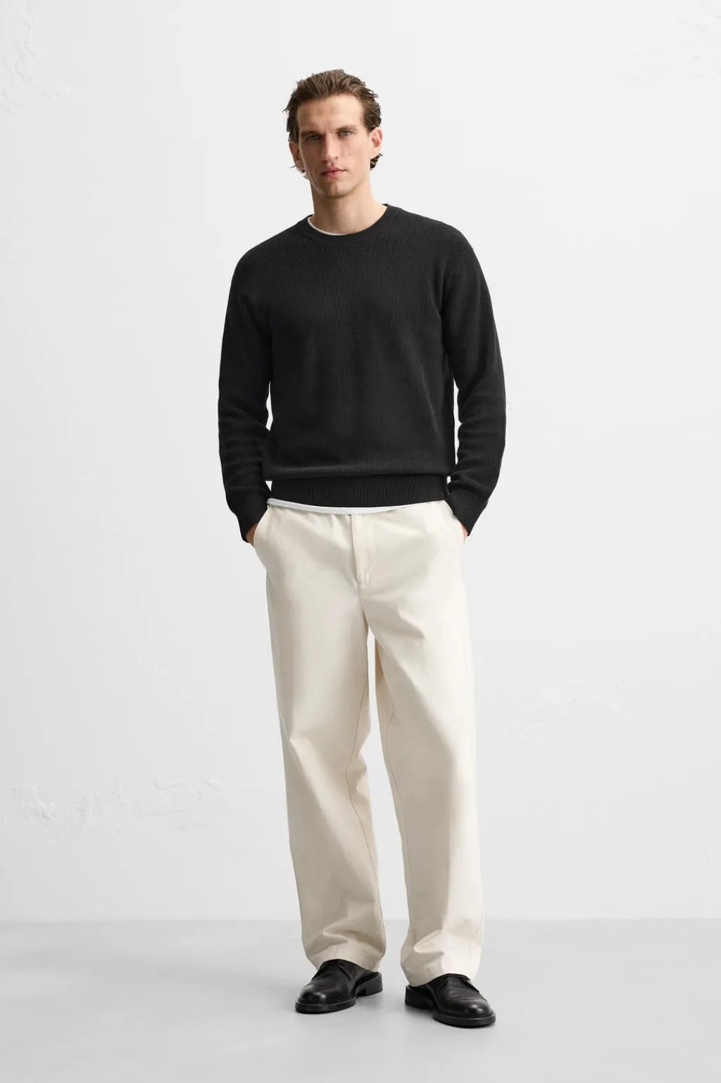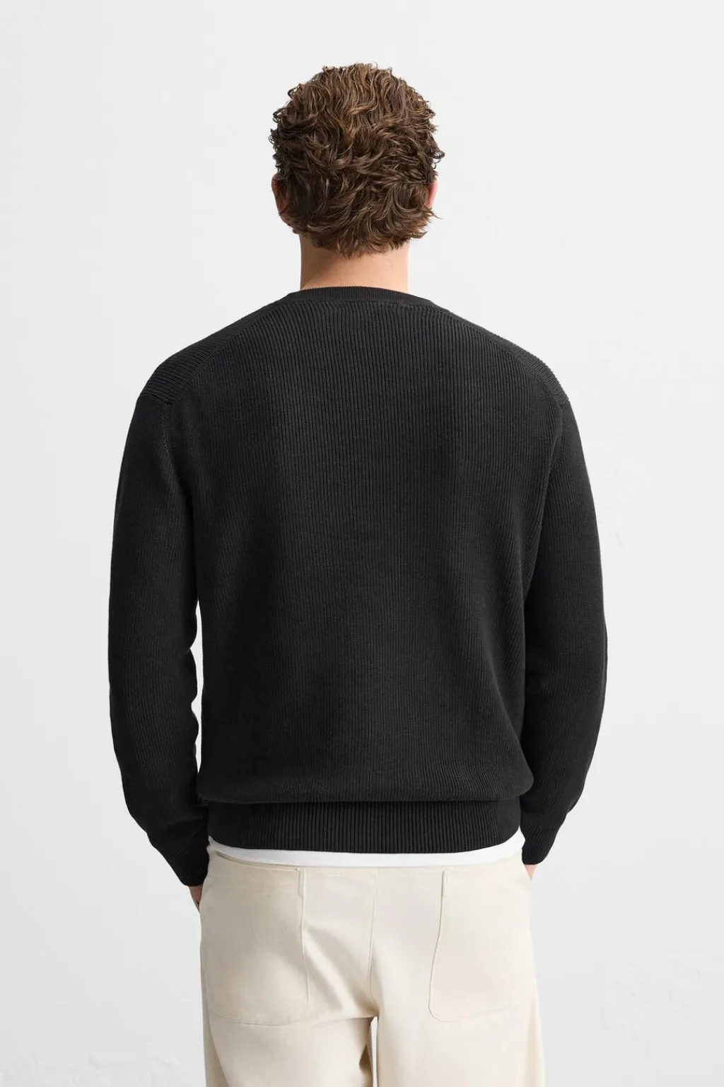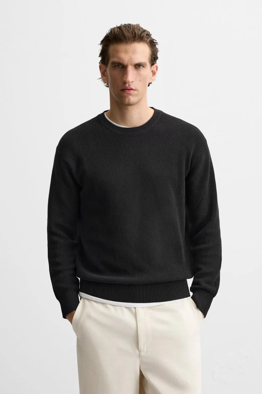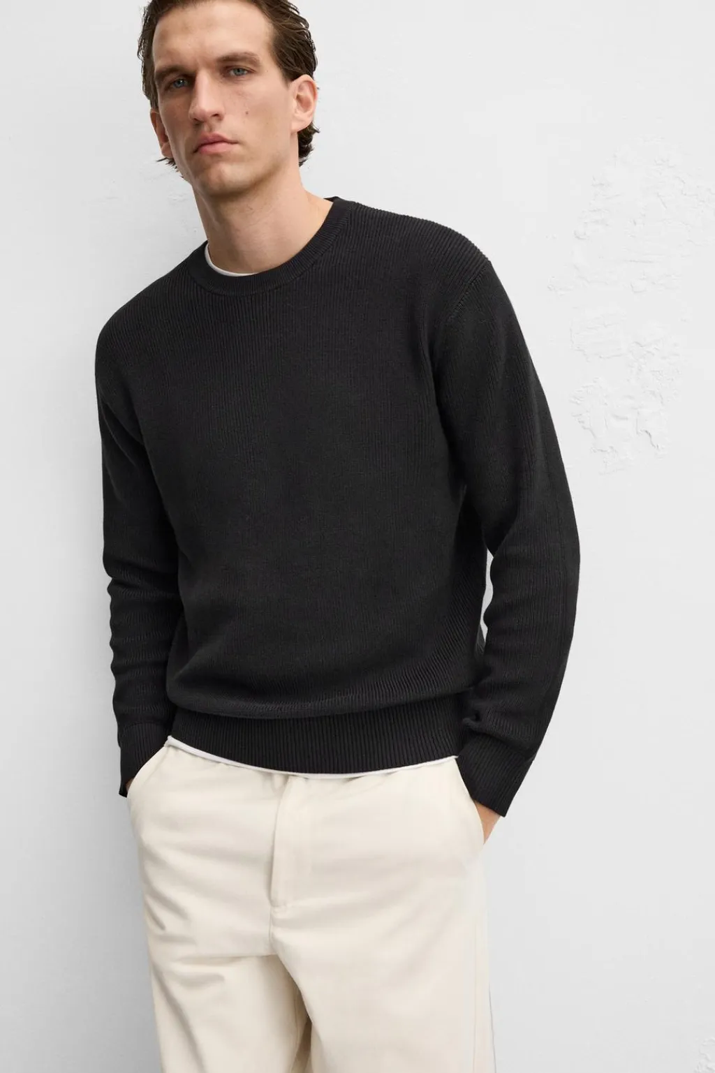 Jersey regular fit tejido en hilatura de algodón. Cuello redondo y manga larga. Acabados en rib.