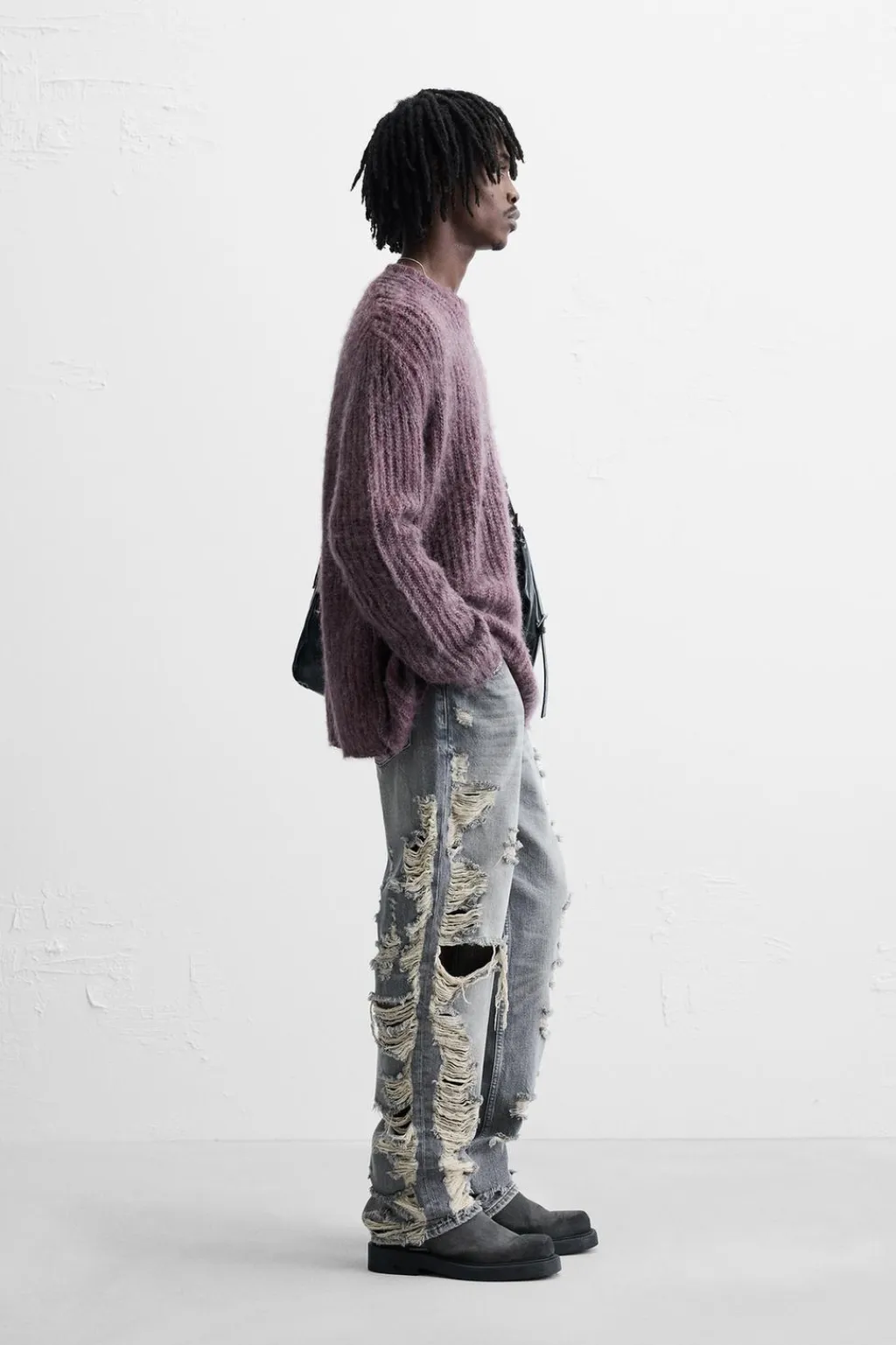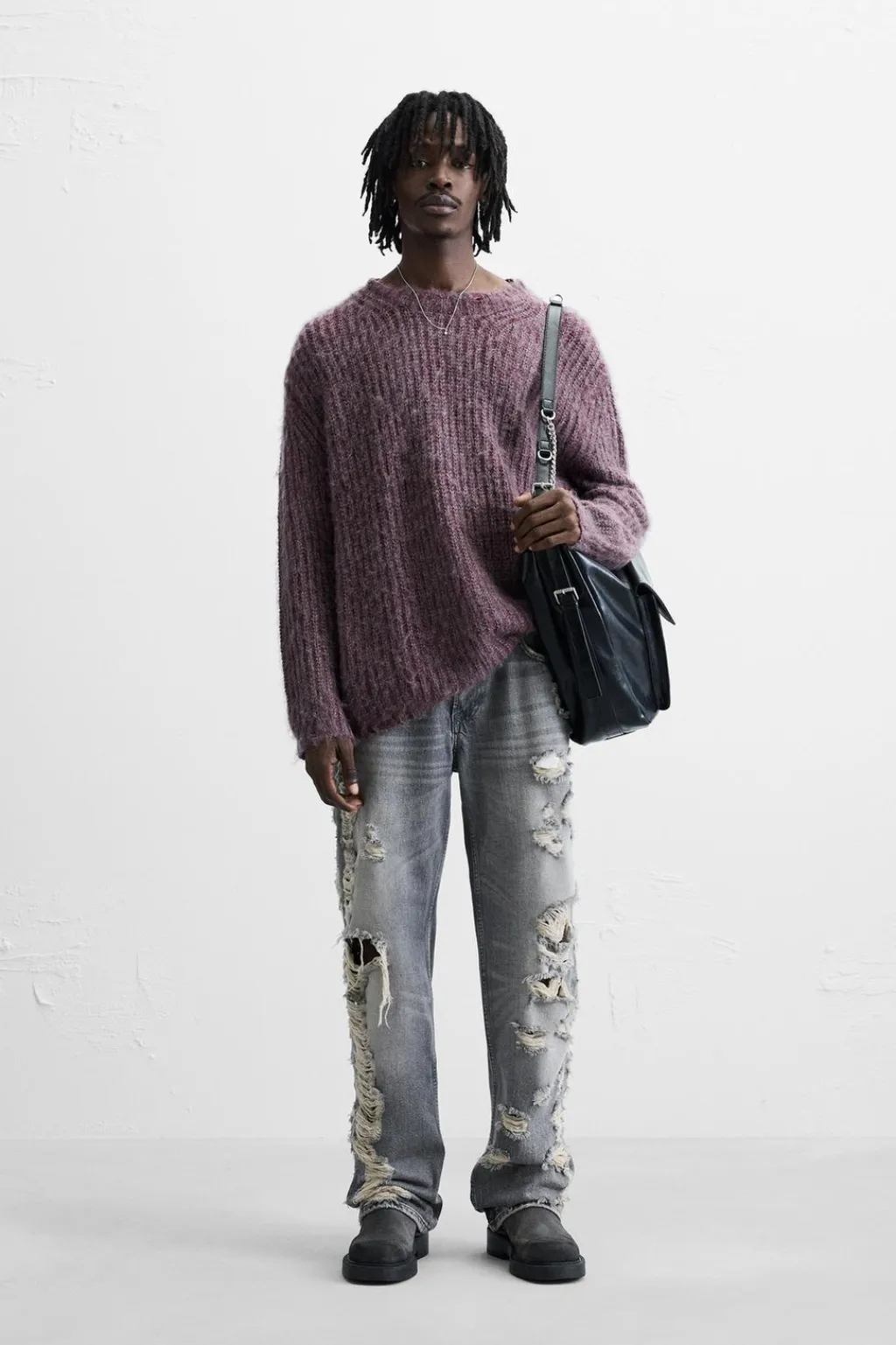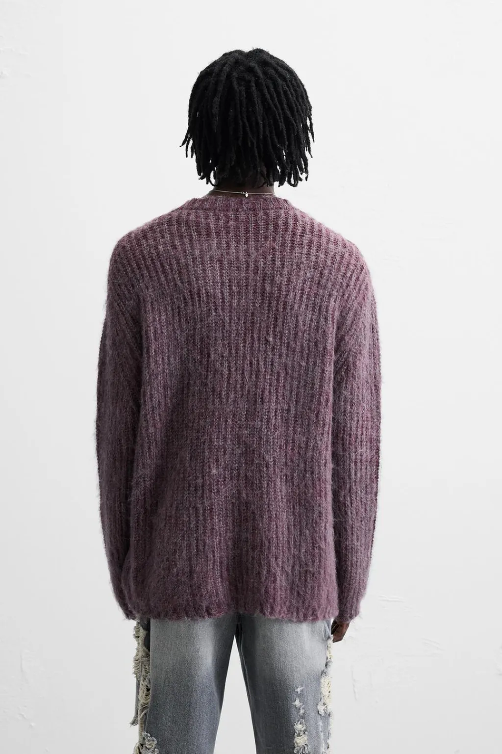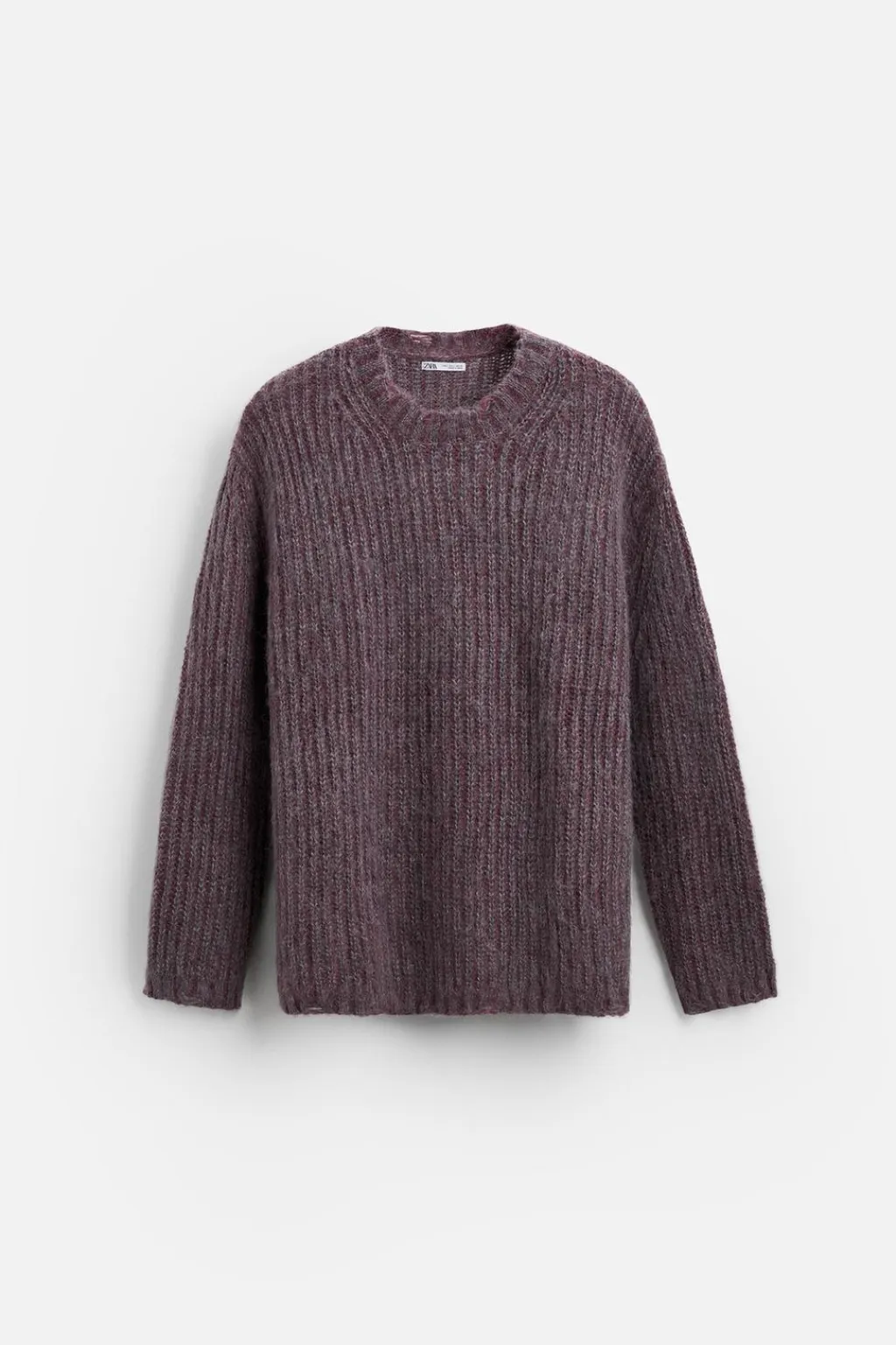 Jersey relaxed fit tejido en hilatura con acabado cepillado. Cuello redondo y manga larga. Acabados en rib.