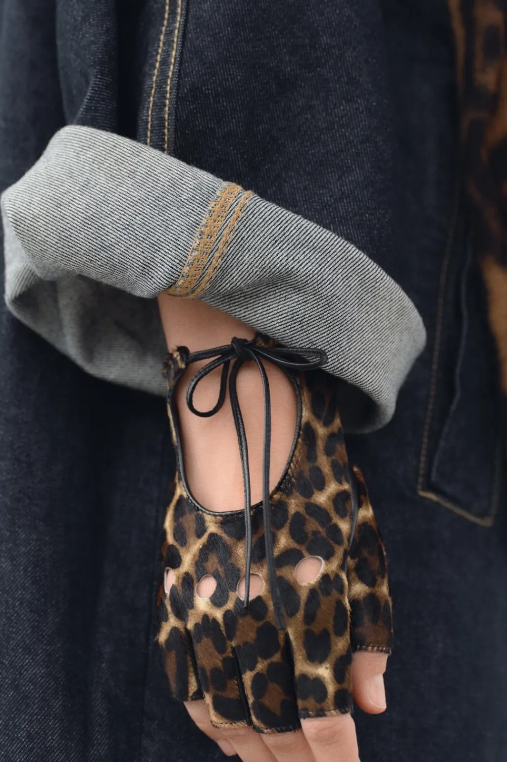 Mitones estampados realizados en piel 100%. Detalle de tejido perforado. Cierre con lazada.